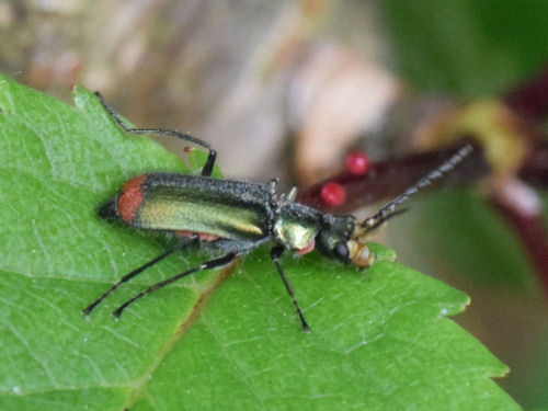 - Slightly smaller and bluer than Malachius bipustulatus (below).