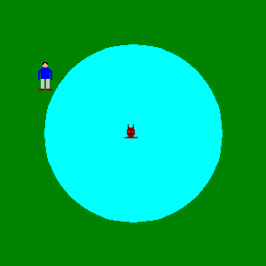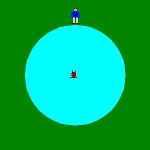 This doesn't work. The rabbit has to swim the radius of the circle (the distance from the middle to the edge). Let's call this r. The man has to travel πr. (If you don't know what π is, click here.) But the man can run four times as fast as the rabbit can swim. That means that he will get there π/4 times as fast as the rabbit. π/4 is less than one (as π is about 3.14159) so the man will get there first, as you can see on the left.