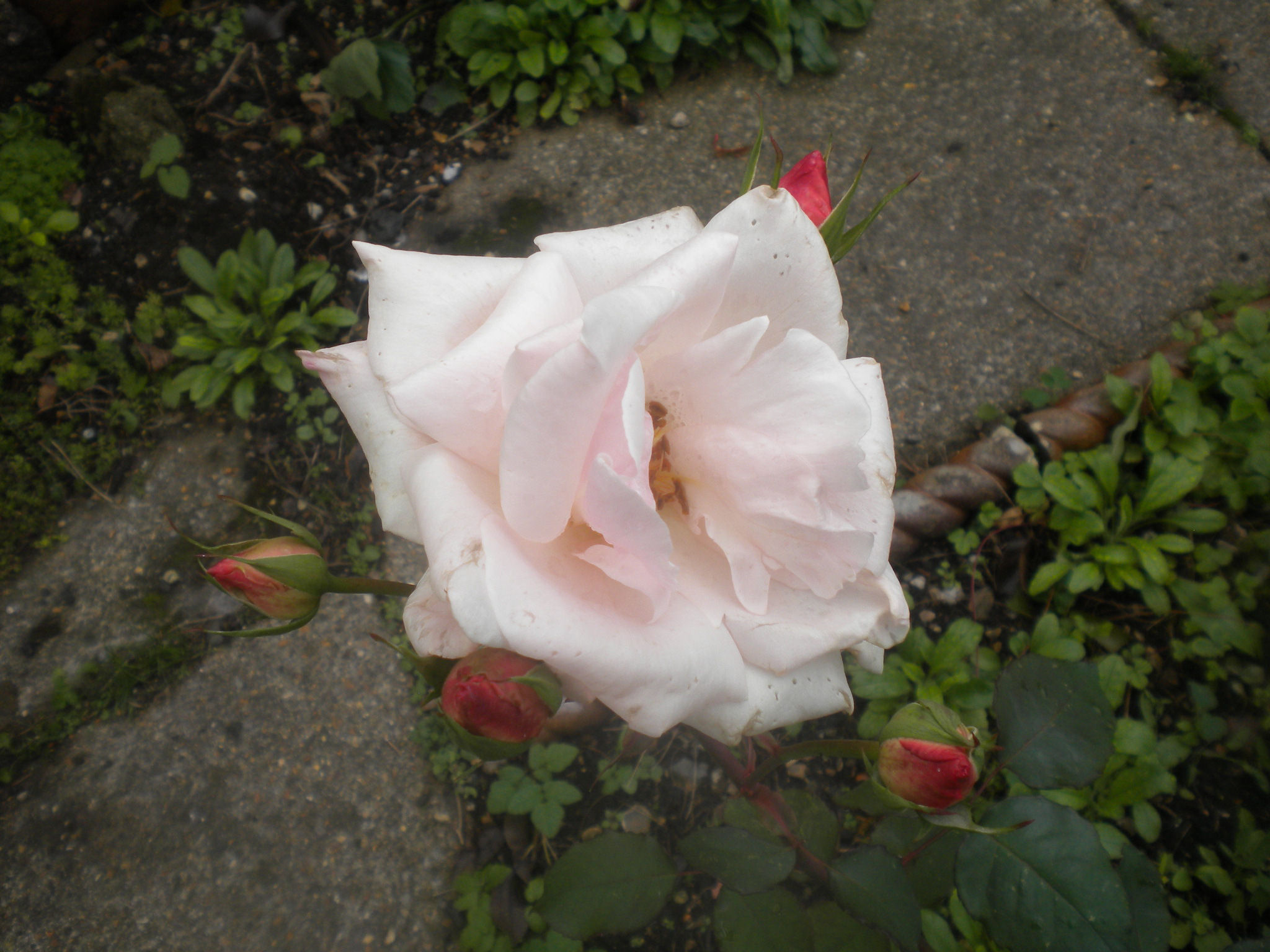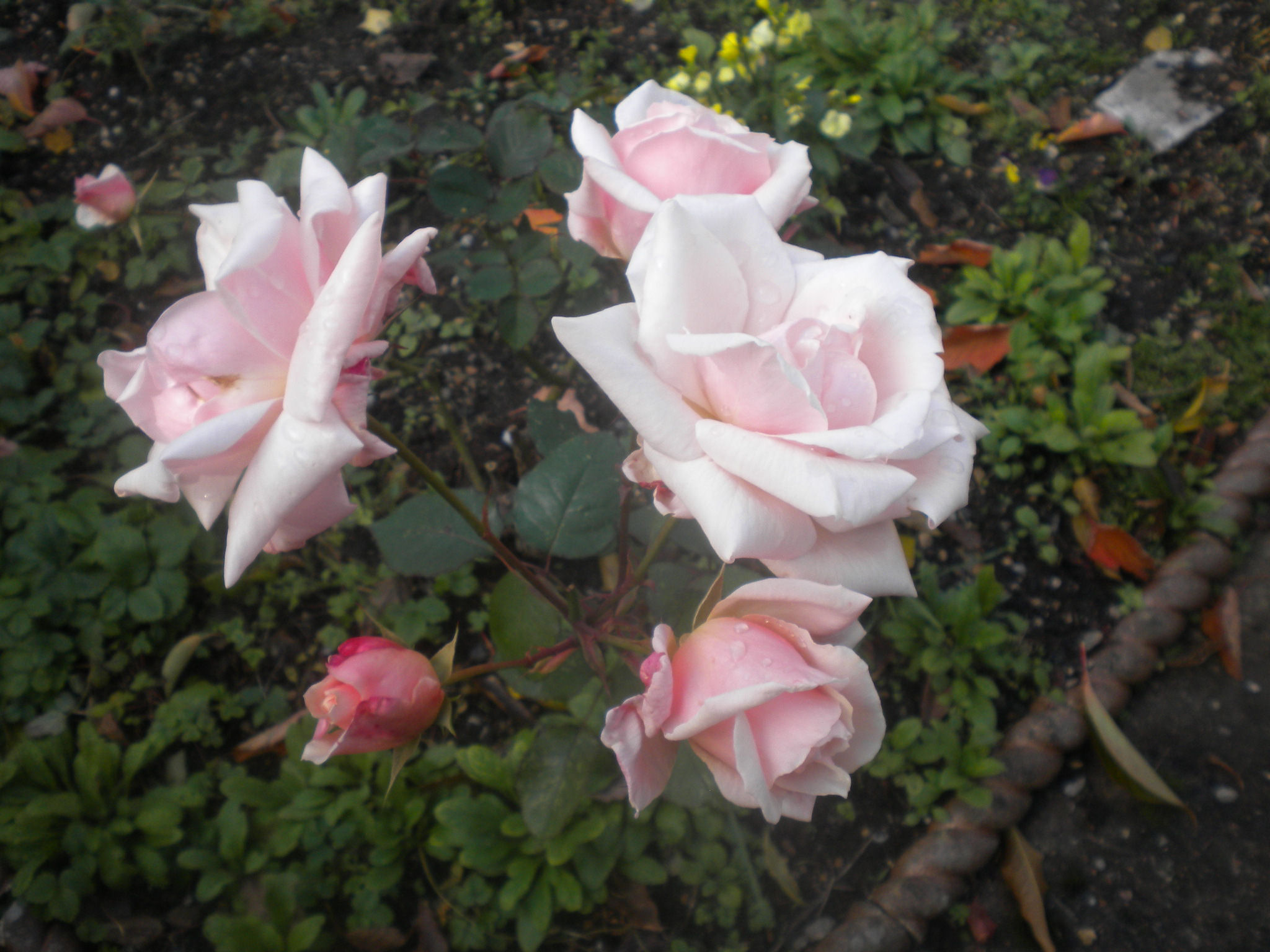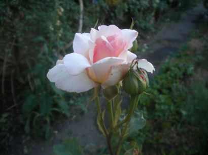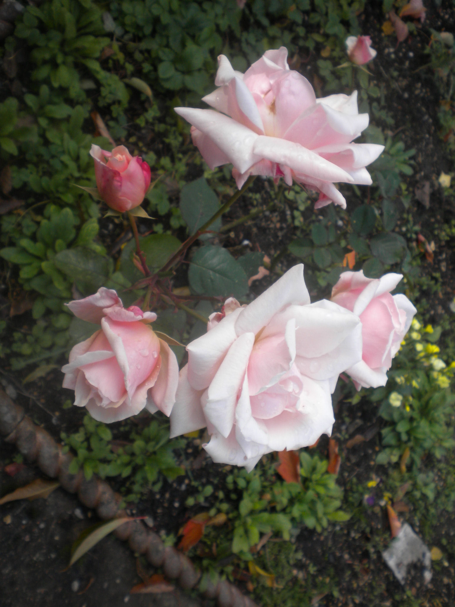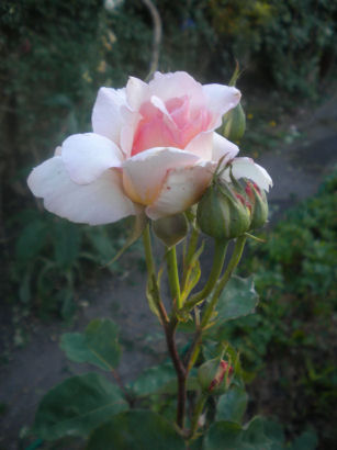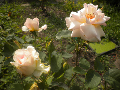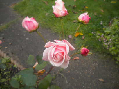 I don't know the name of this rose. It was in the garden when we arrived. This was in 1979, so it's an old plant! I think it is a floribunda rose, with several flowers on each stem,. It flowered from May almost to July and then started flowering again August into October.