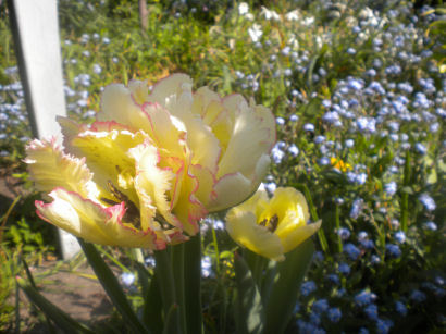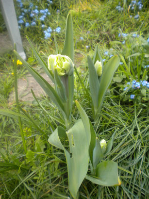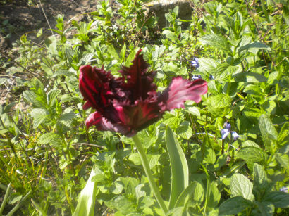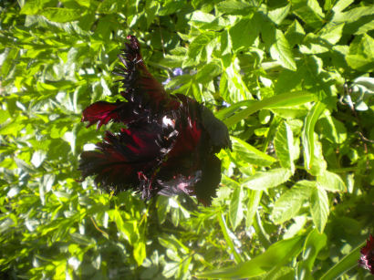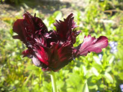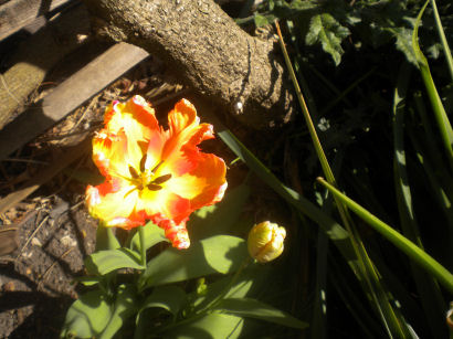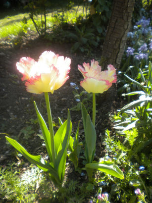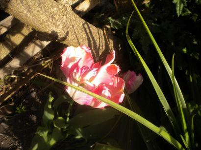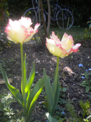 Tulips are usually thought of as very formal flowers with severe shapes. There are certainly tulips like that, but there are a lot of different varieites, and I prefer the others! These were bought from Bloms. Some are small, early tulips. Some are multi-coloured. But my favourite are the parrot tulips, with feathery petals. They can have more than one colour. As they flower, they get more and more weird in shape! We call them Triffids.