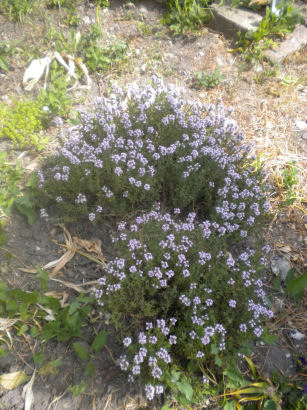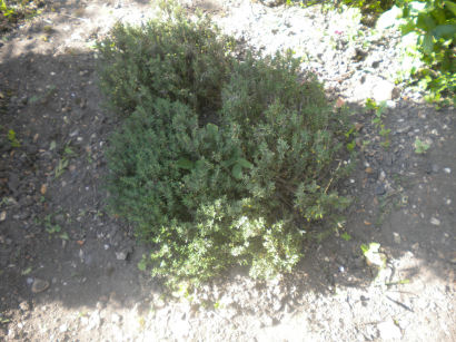 Thyme grows like a very small bush. It stays green during the winter, and has old wood and new wood. However, I don't tend to prune it. I get a new plant if it gets too leggy! It seems to seed itself as well, but not strongly.