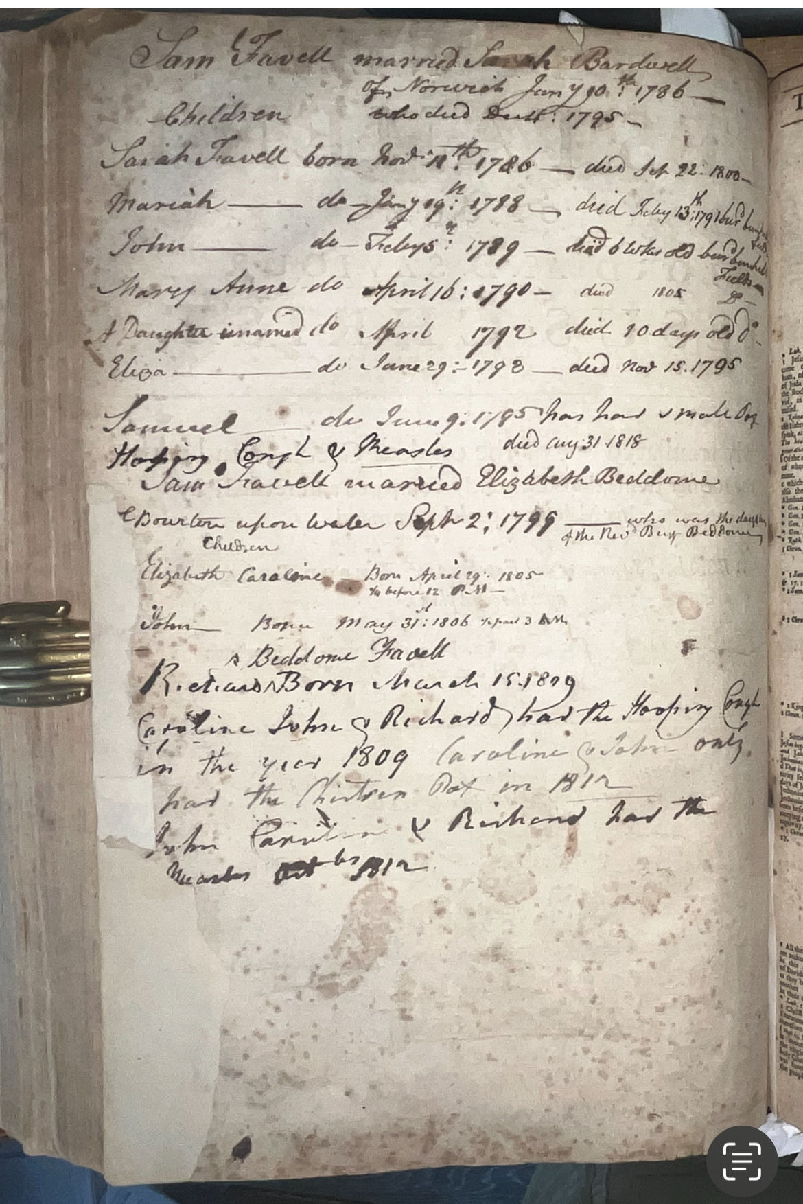 Elizabeth Beddome was Sam Favell's second wife. His first wife had been Sarah Bardwell and they had been married at St Gregory's, Norwich, on the 10th Jan 1786. They lived in Tooley Street and had 6 children before Sarah died in 1795 and was buried at Bunhill Fields on the 8th December at the age of 29. Only three children was alive at the time of his second marriage, and only the youngest, Samuel, was still alive in 1816. He must have died by the time of his father's will, since he isn't mentioned.