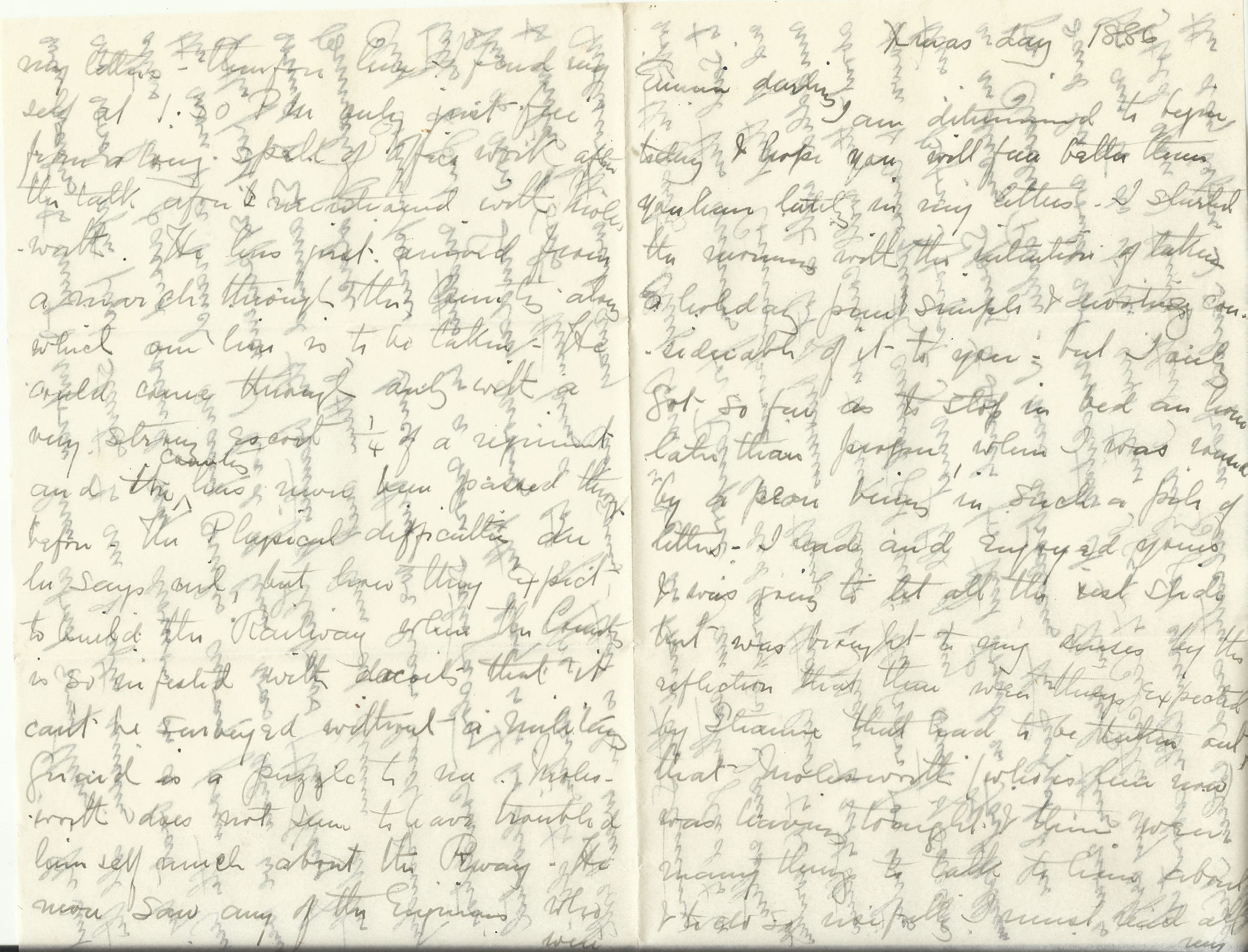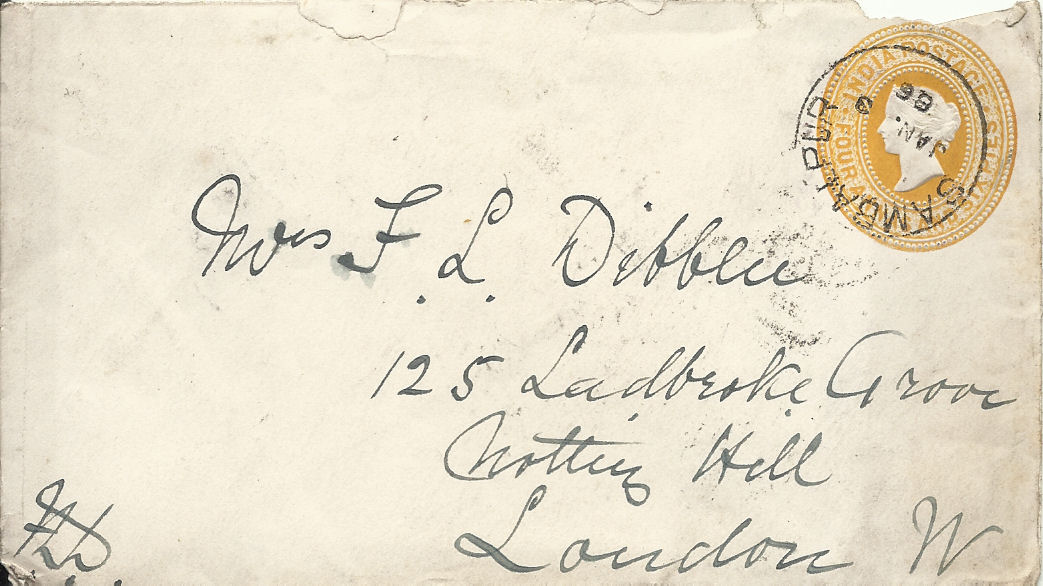 Some comments explaining the background: Fred and Emily were born in Canada. Fred made a career as a railway engineer, travelling widely, and ending up in India. Emily married him just before they both went out to India, and their relationship was very close. Most of their eight children were born in India and three of them died there as infants. Probably as a result of this, or because of the boys education, it was decided to leave the children in England, while Emily continued with Fred in India (see letter from Emily's mother). This explains the references in the letters below where Fred says to Emily "Do you remember?". There is also an amusing story published in a newspaper, which shows Emily with Fred while he was working, without the children. However, eventually they decide that Emily should be in England as well, with their children. Perhaps this was because the two oldest sons were getting older, and it was necessary to start thinking about their careers. The letters date from this period when Fred was alone in India. Sadly, Fred died in India in 1888. Emily must have kept the letters as a link to her beloved husband.