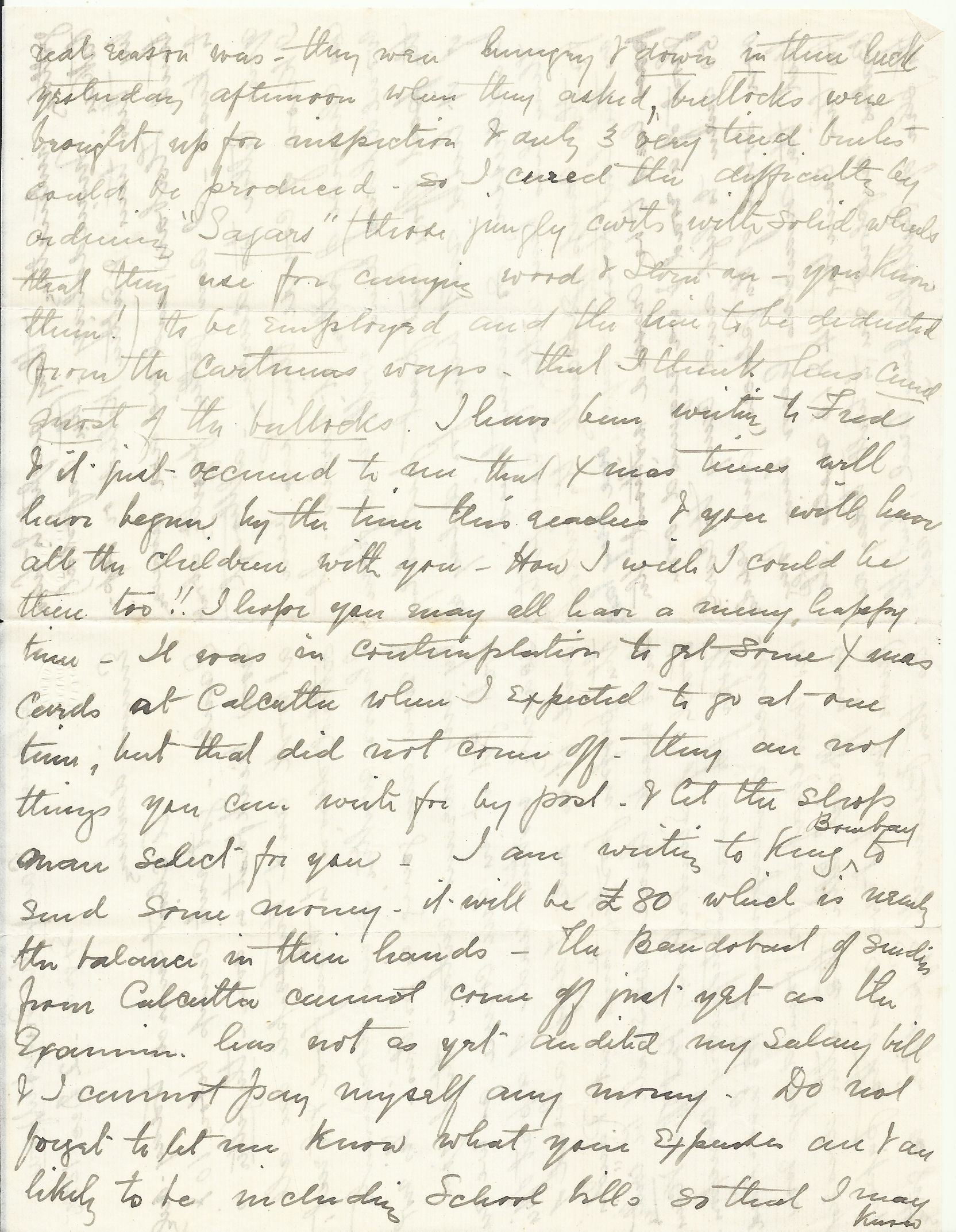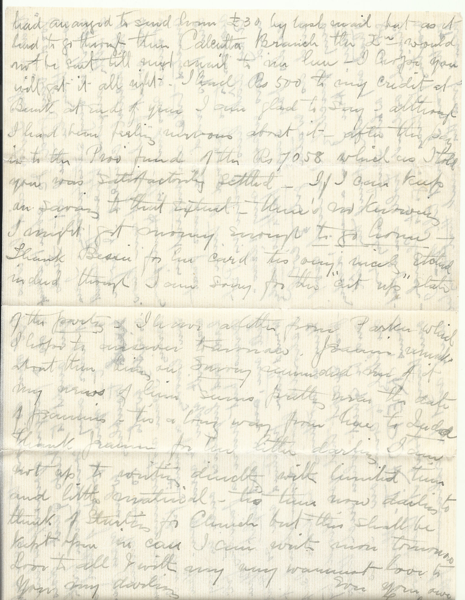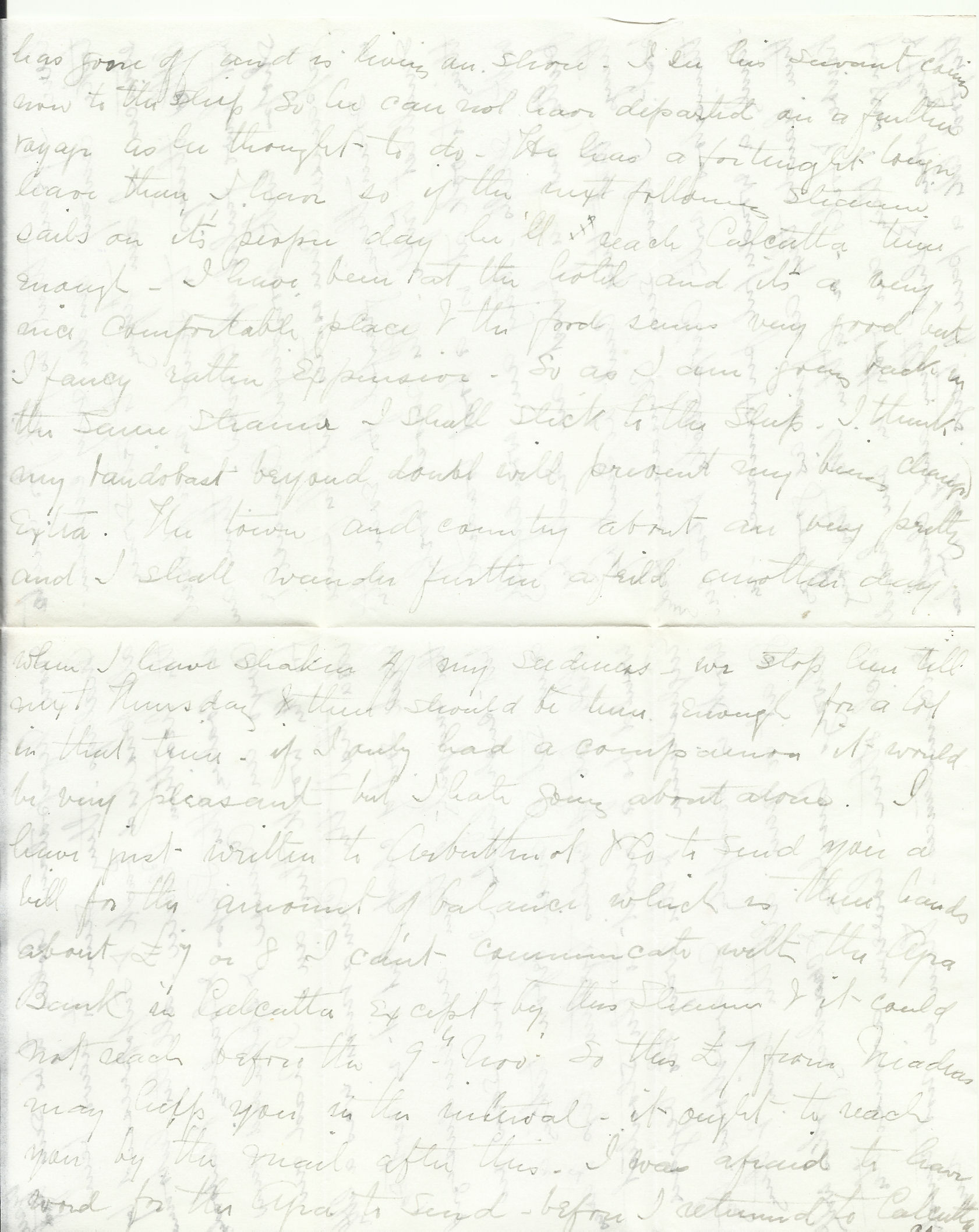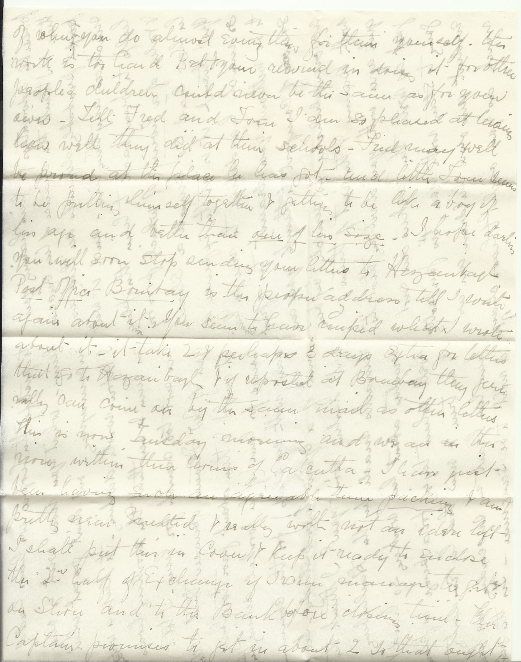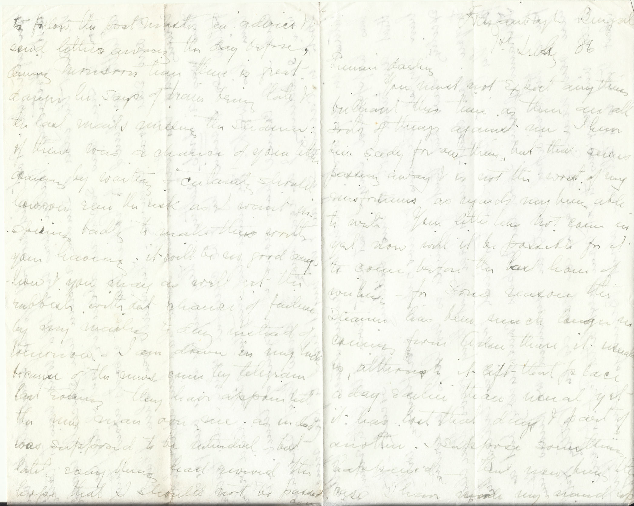 There is a lot in your letter, darling, I want to answer and write about, but it must be put off next mail. I shall have no letter from you, and probably not for three weeks. Next time, write c/o Post Master, Calcutta, and I will leave direction about my new address. I shall send home £30 this mail, as I could not feel sure, how much you had left, and did not like to risk leaving you short, when so many payts would be coming due.