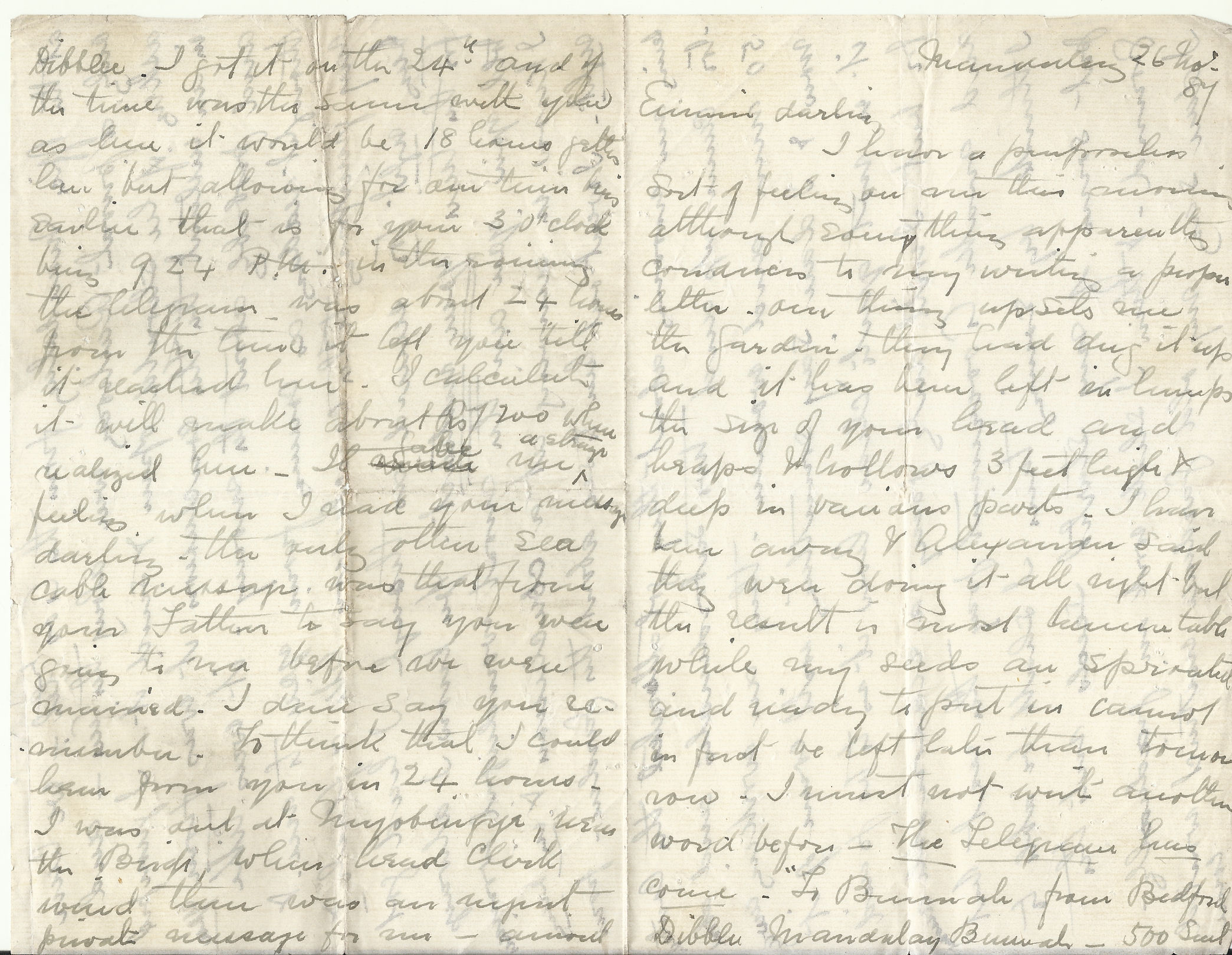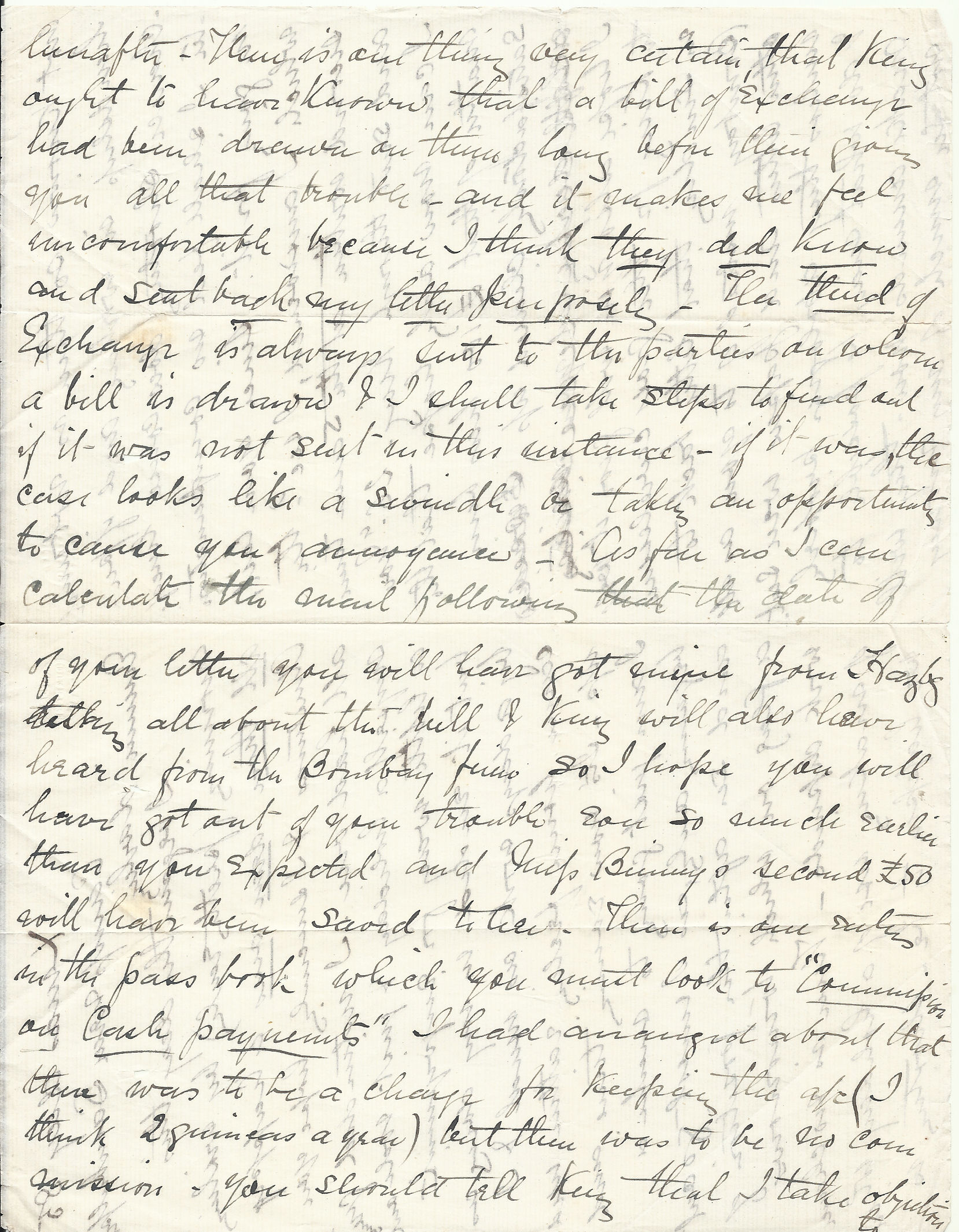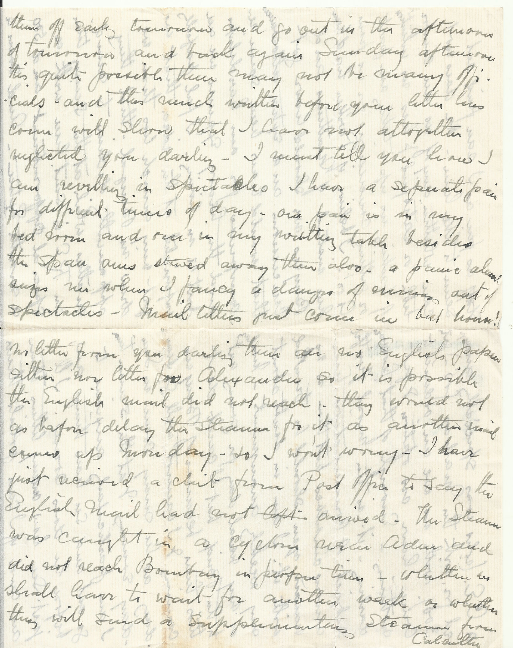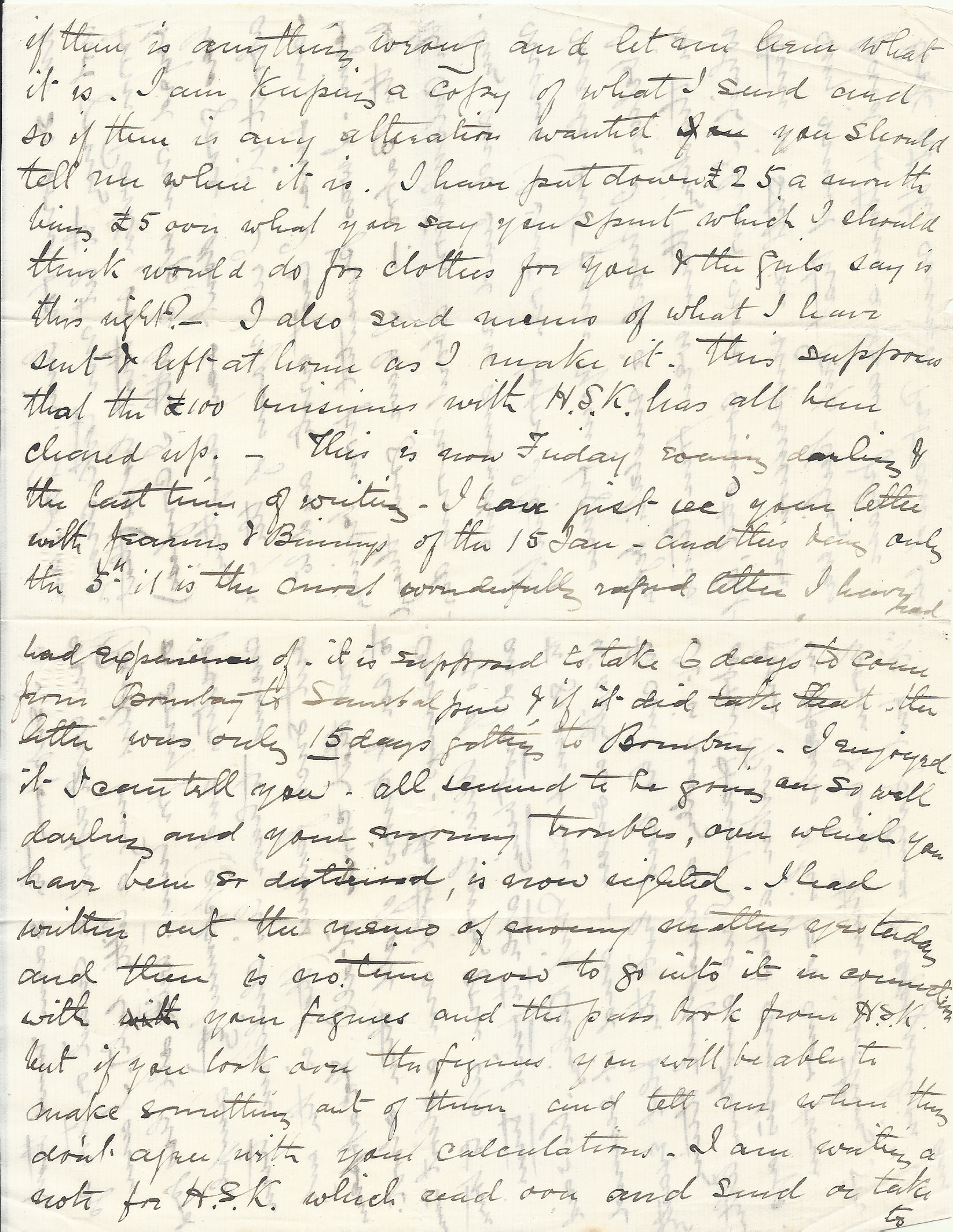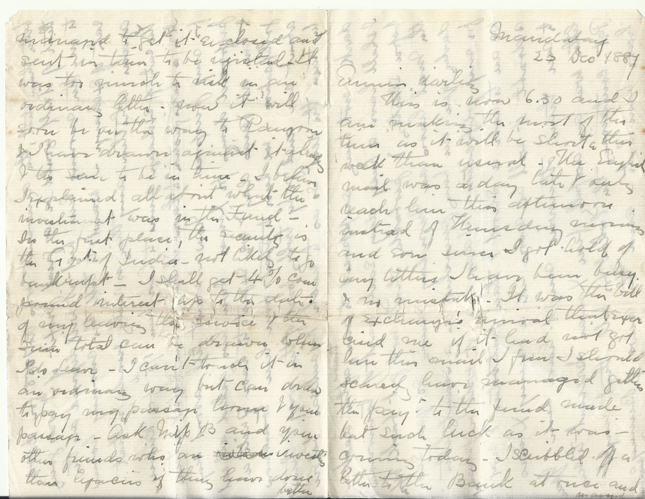 There is a lot in your letter, darling, I want to answer and write about, but it must be put off next mail. I shall have no letter from you, and probably not for three weeks. Next time, write c/o Post Master, Calcutta, and I will leave direction about my new address. I shall send home £30 this mail, as I could not feel sure, how much you had left, and did not like to risk leaving you short, when so many payts would be coming due.