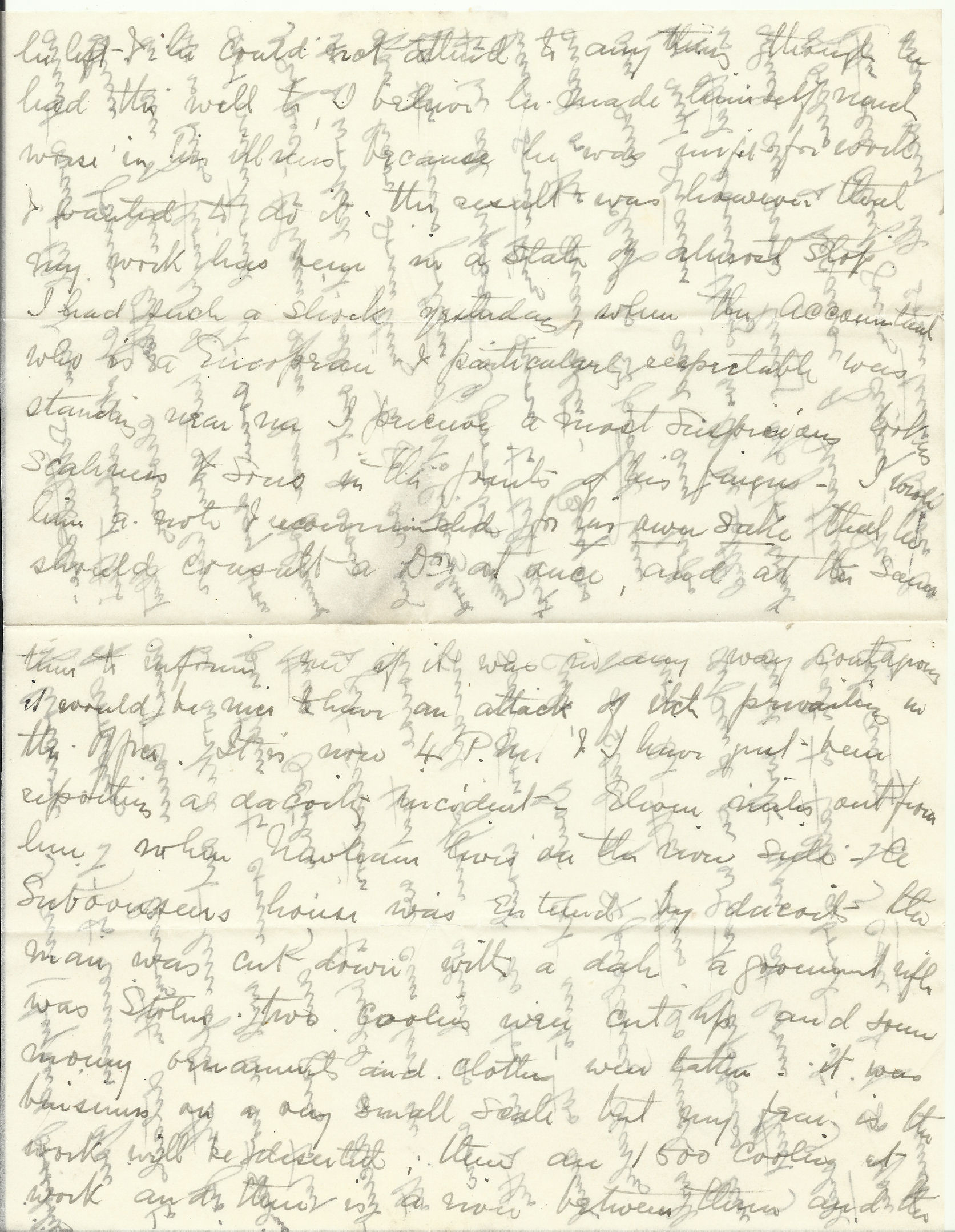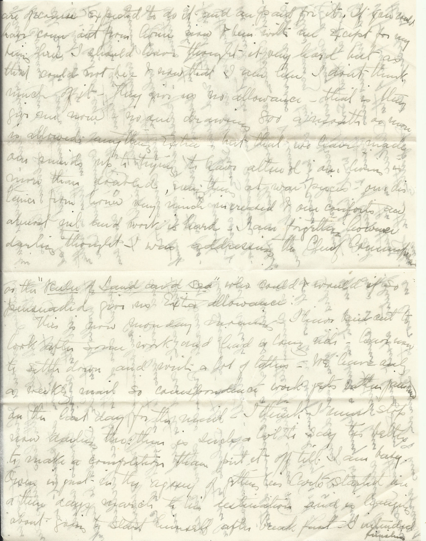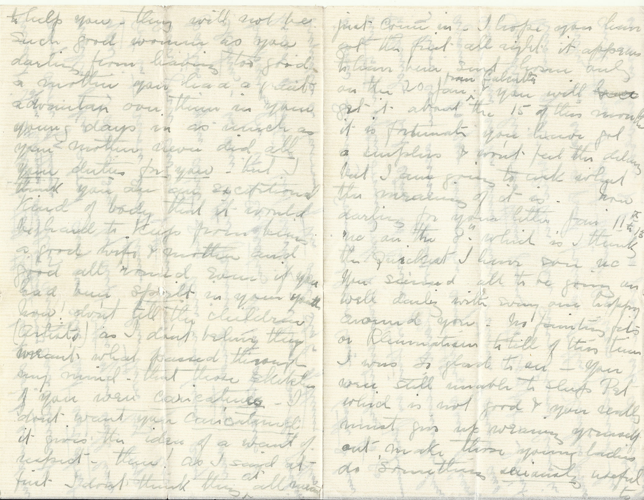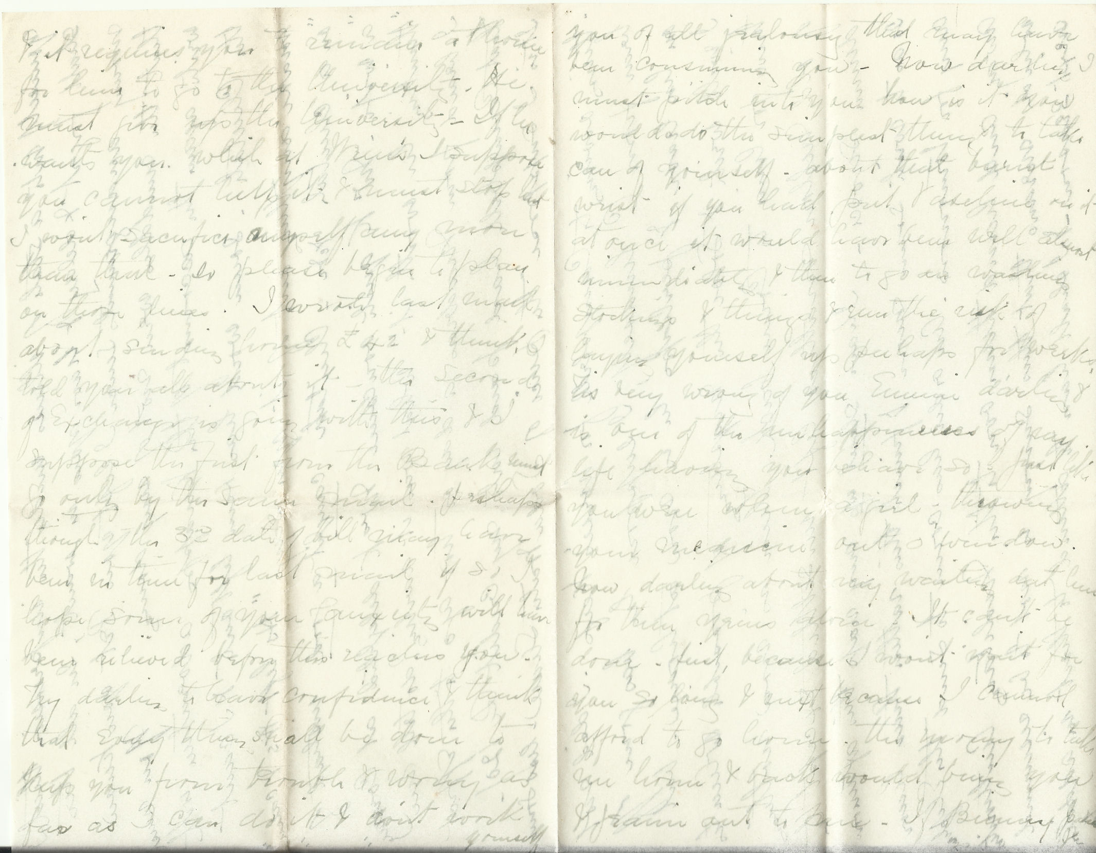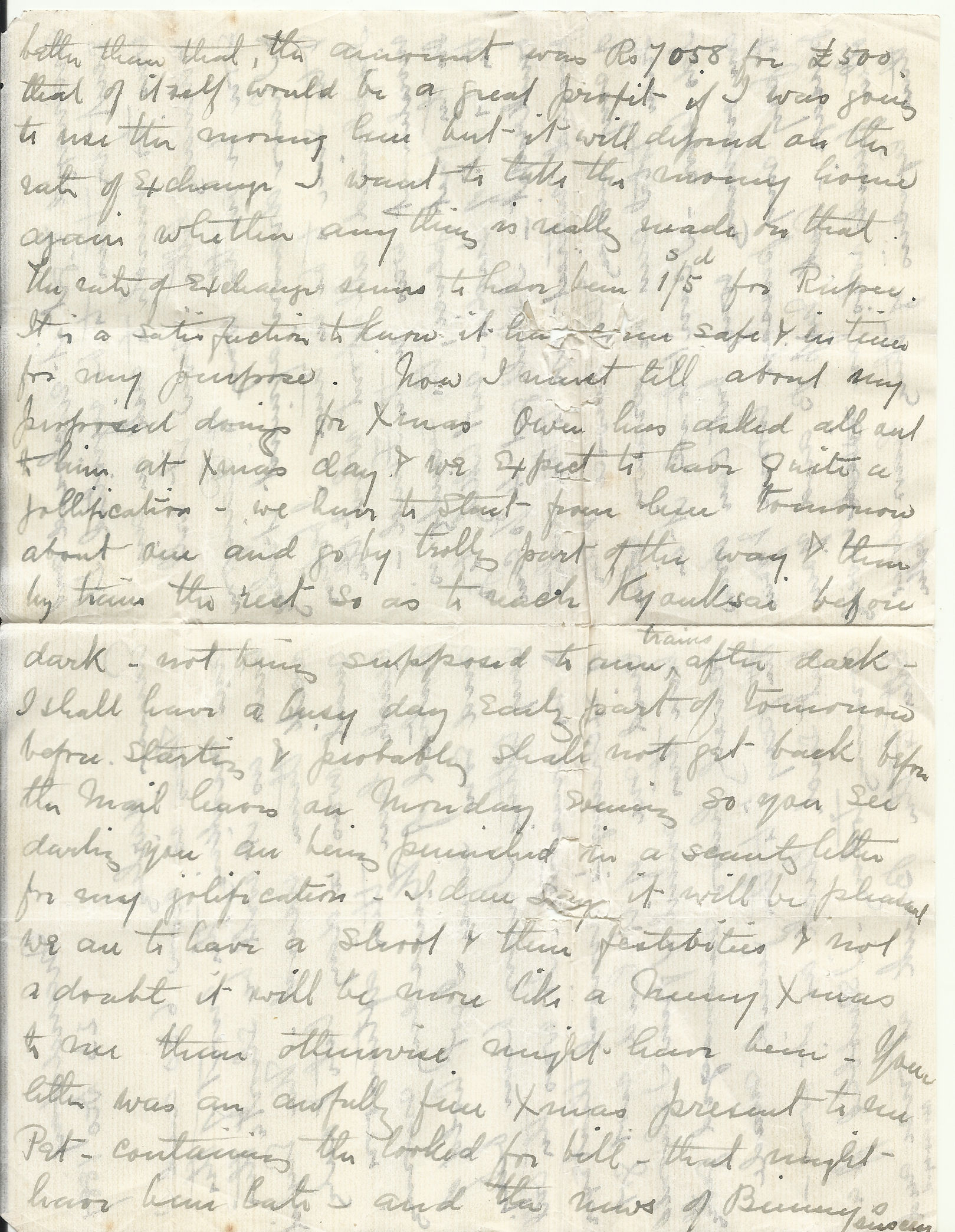 There is a lot in your letter, darling, I want to answer and write about, but it must be put off next mail. I shall have no letter from you, and probably not for three weeks. Next time, write c/o Post Master, Calcutta, and I will leave direction about my new address. I shall send home £30 this mail, as I could not feel sure, how much you had left, and did not like to risk leaving you short, when so many payts would be coming due.