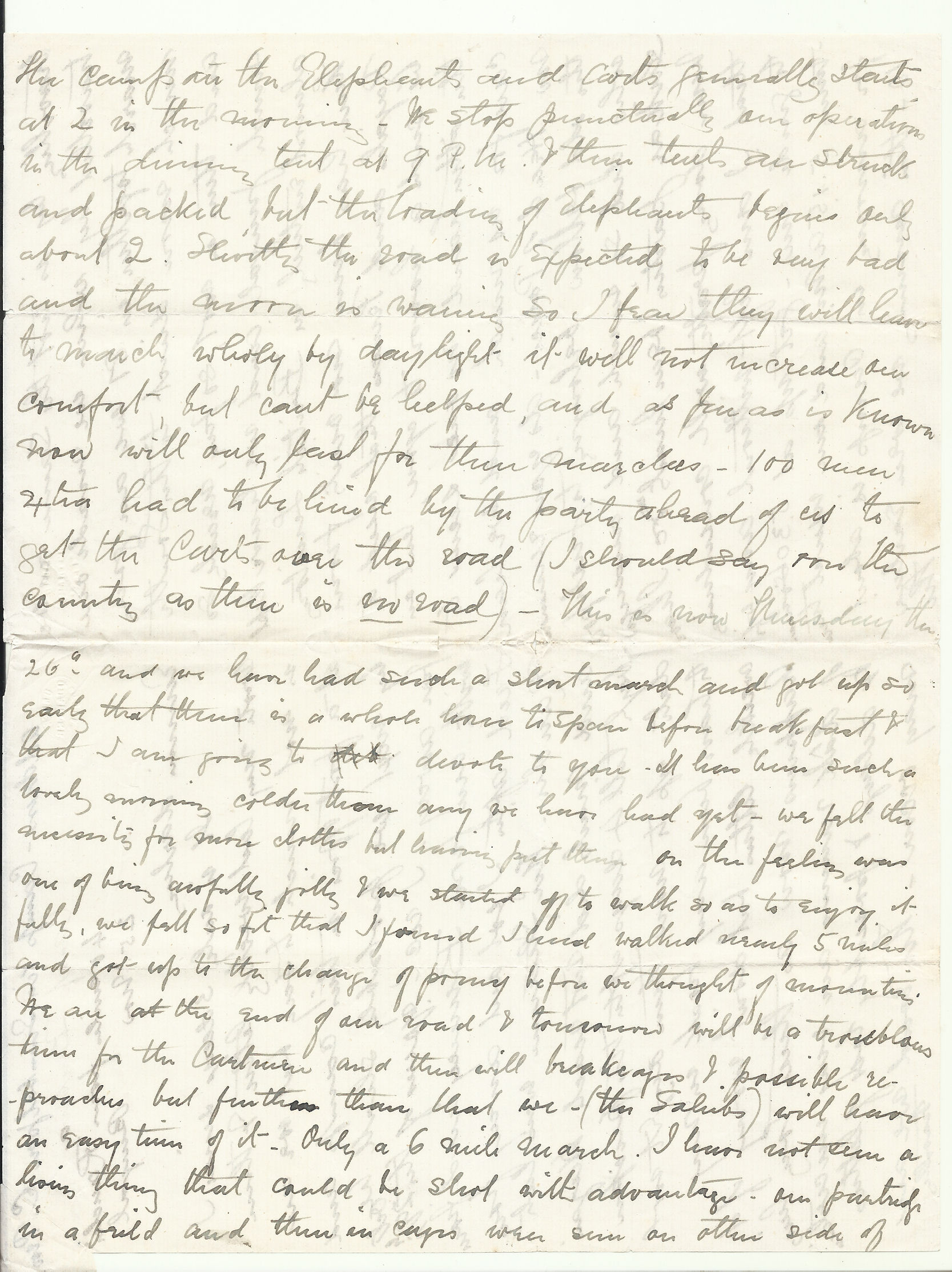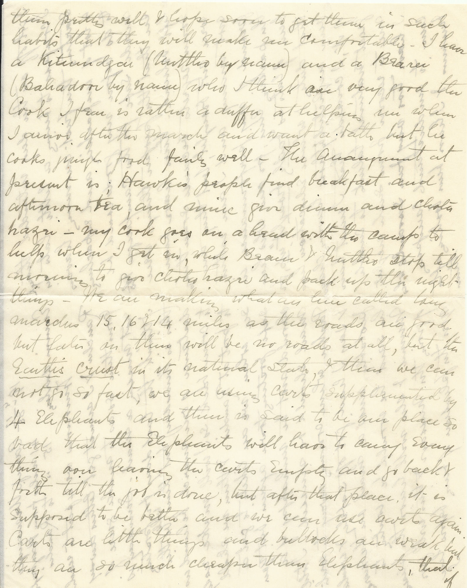 I forget whether I told you, how to send letters. I think I did say to send c/o Postmaster Calcutta, when first I got my orders to come here, but I ought, in my last letter, to have said address Delhi. All my correspondence must, I think, go through there, till the expedition is over, but of that, you shall hear more, when I get to Delhi. I am still without the letter of instruction, which was to have been sent back, but I suppose it will come tomorrow.