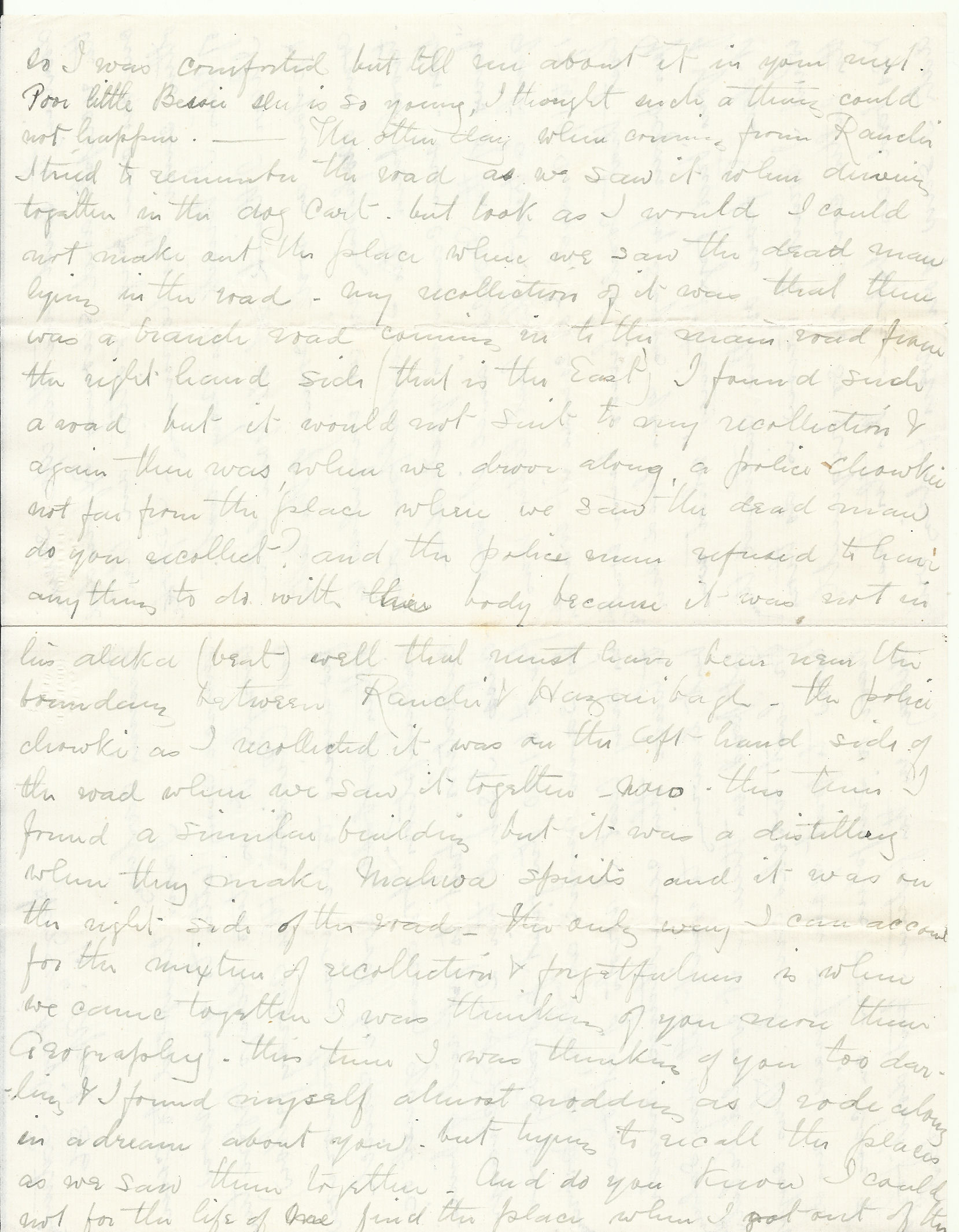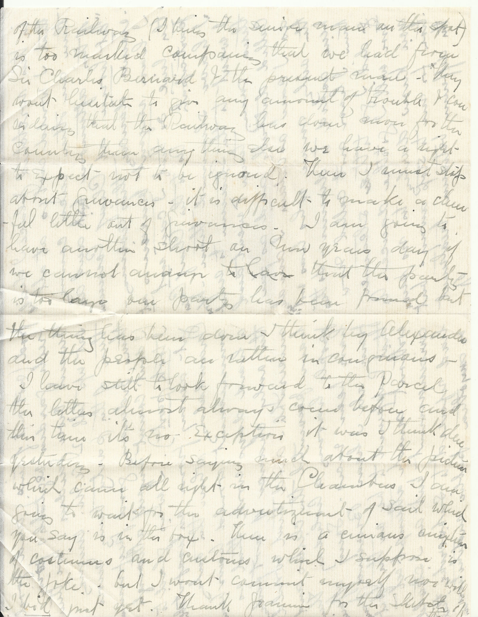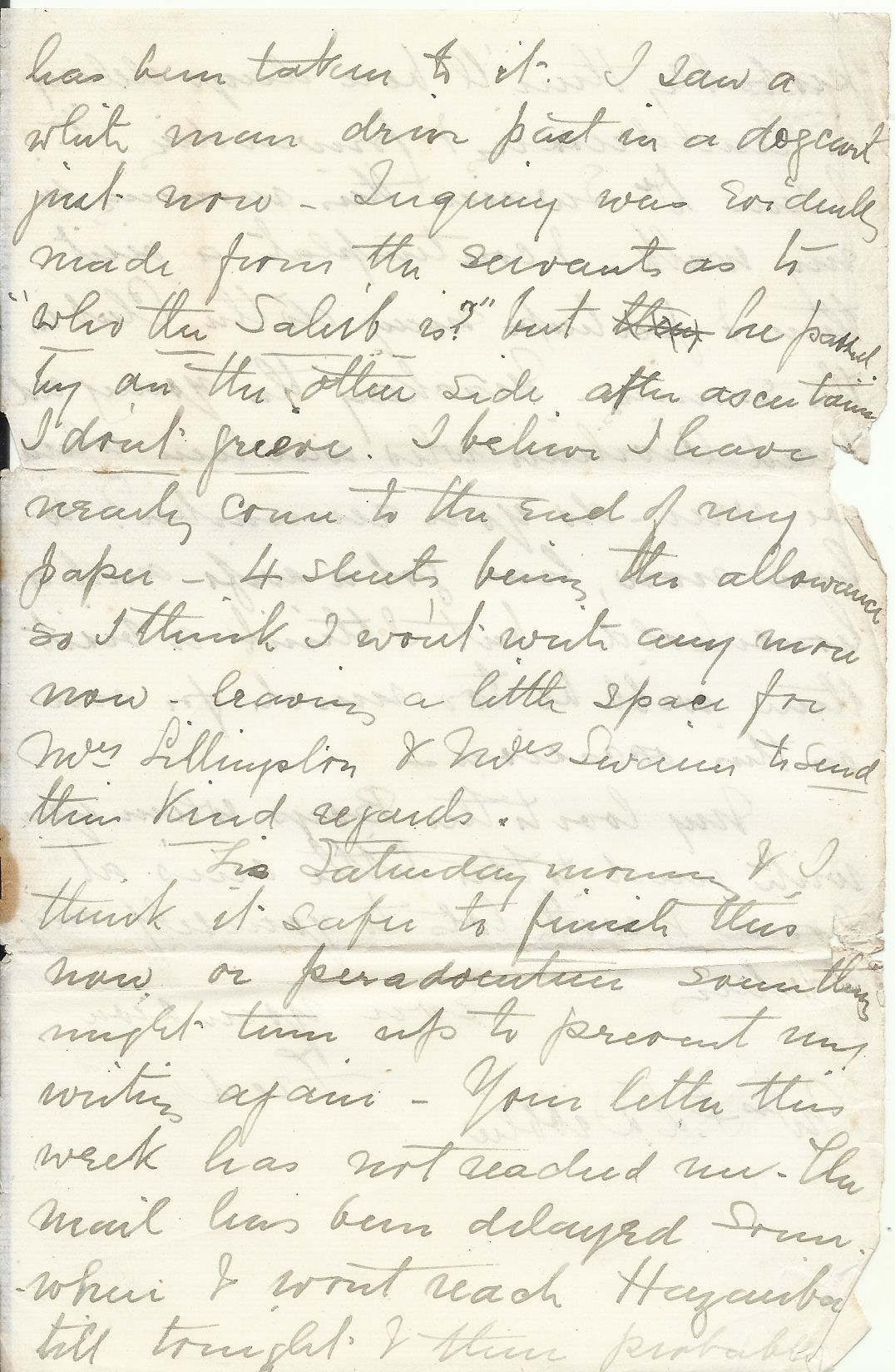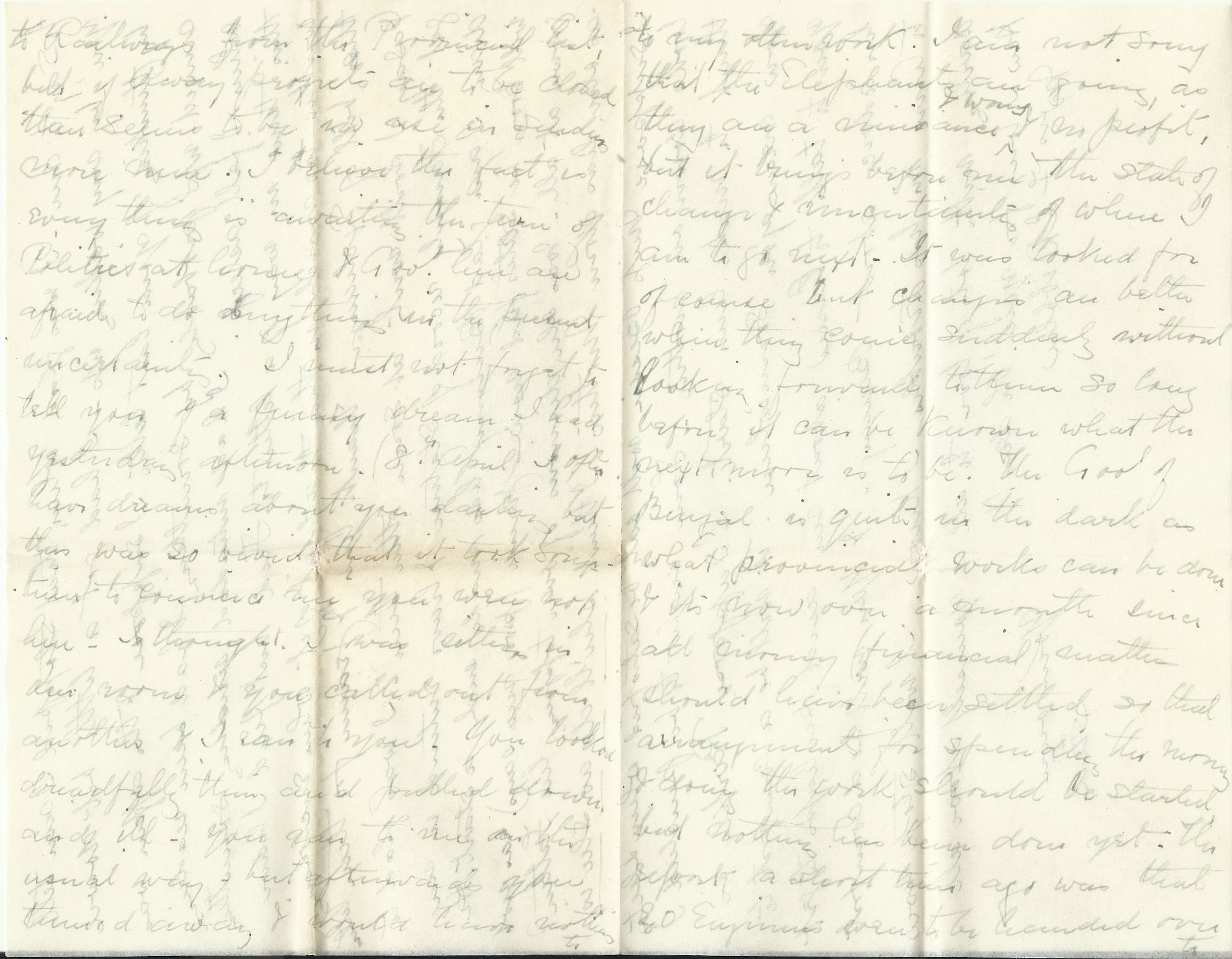 Since writing the above, I went and paid a visit on Mr and Mrs Finney. You remember him at Poona, darling? And I have finished the letter to Binney, so your share of letter, this time, will be so much shorter. I would not have time, I fear, to write much more, as tomorrow, I shall be dreadfully busy, and as soon I cease to be busy, I must start for Delhi. I wish you could be out with me, in this camping season. The Country is not so good, but the weather, they tell me, is splendid, so cold & dry. I am going to invest in Country cloth at Cawnpore, and make a big Ulster, & how I wish you could tell me how to do it.