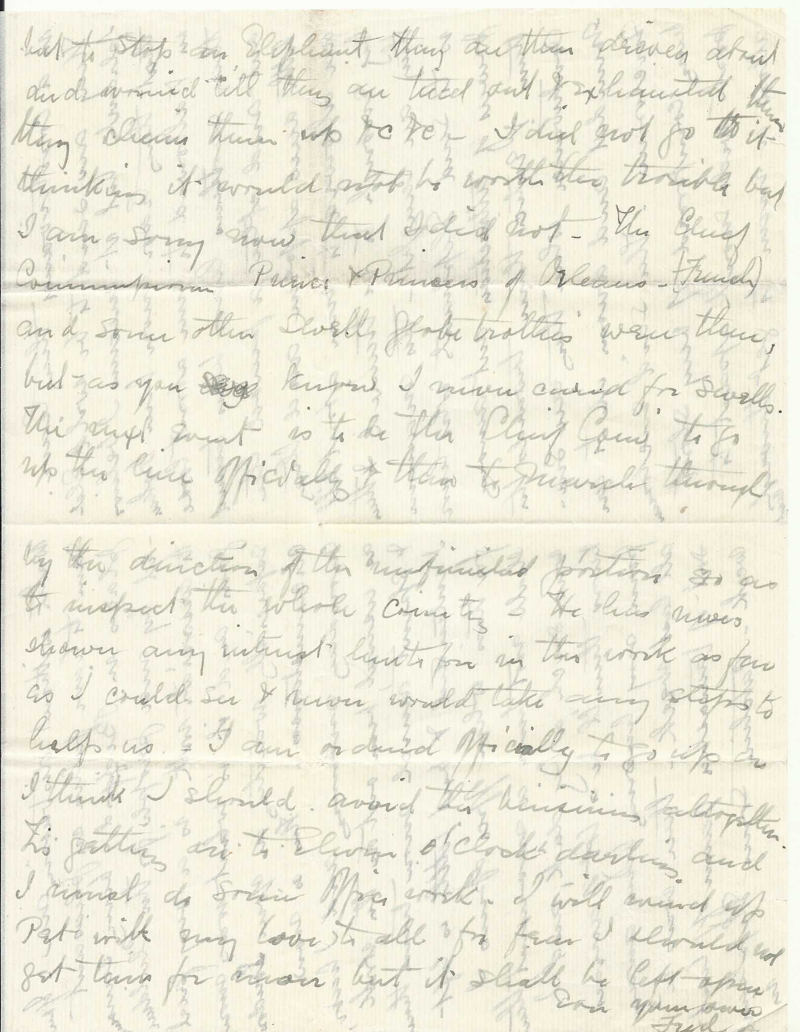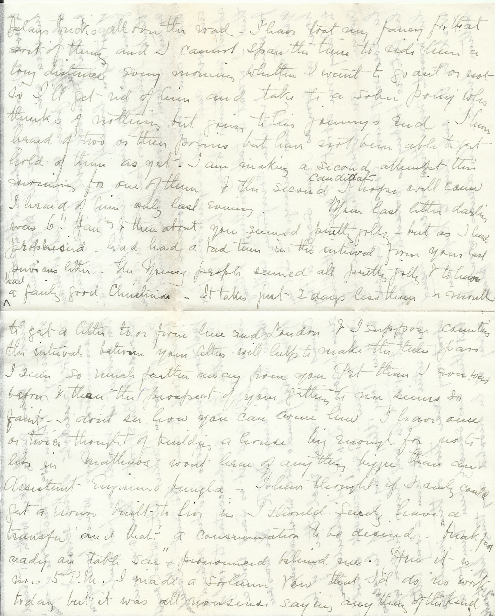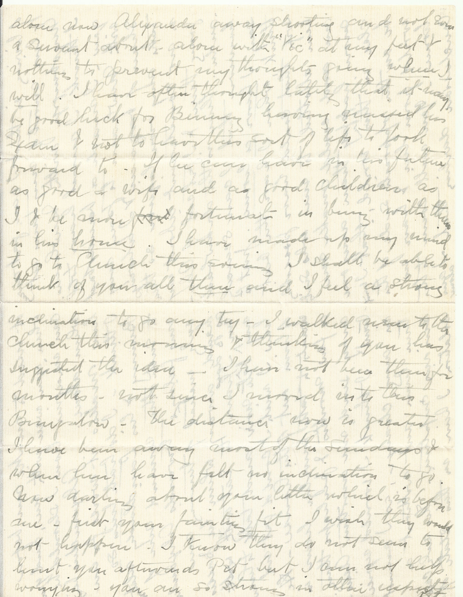 Since writing the above, I went and paid a visit on Mr and Mrs Finney. You remember him at Poona, darling? And I have finished the letter to Binney, so your share of letter, this time, will be so much shorter. I would not have time, I fear, to write much more, as tomorrow, I shall be dreadfully busy, and as soon I cease to be busy, I must start for Delhi. I wish you could be out with me, in this camping season. The Country is not so good, but the weather, they tell me, is splendid, so cold & dry. I am going to invest in Country cloth at Cawnpore, and make a big Ulster, & how I wish you could tell me how to do it.