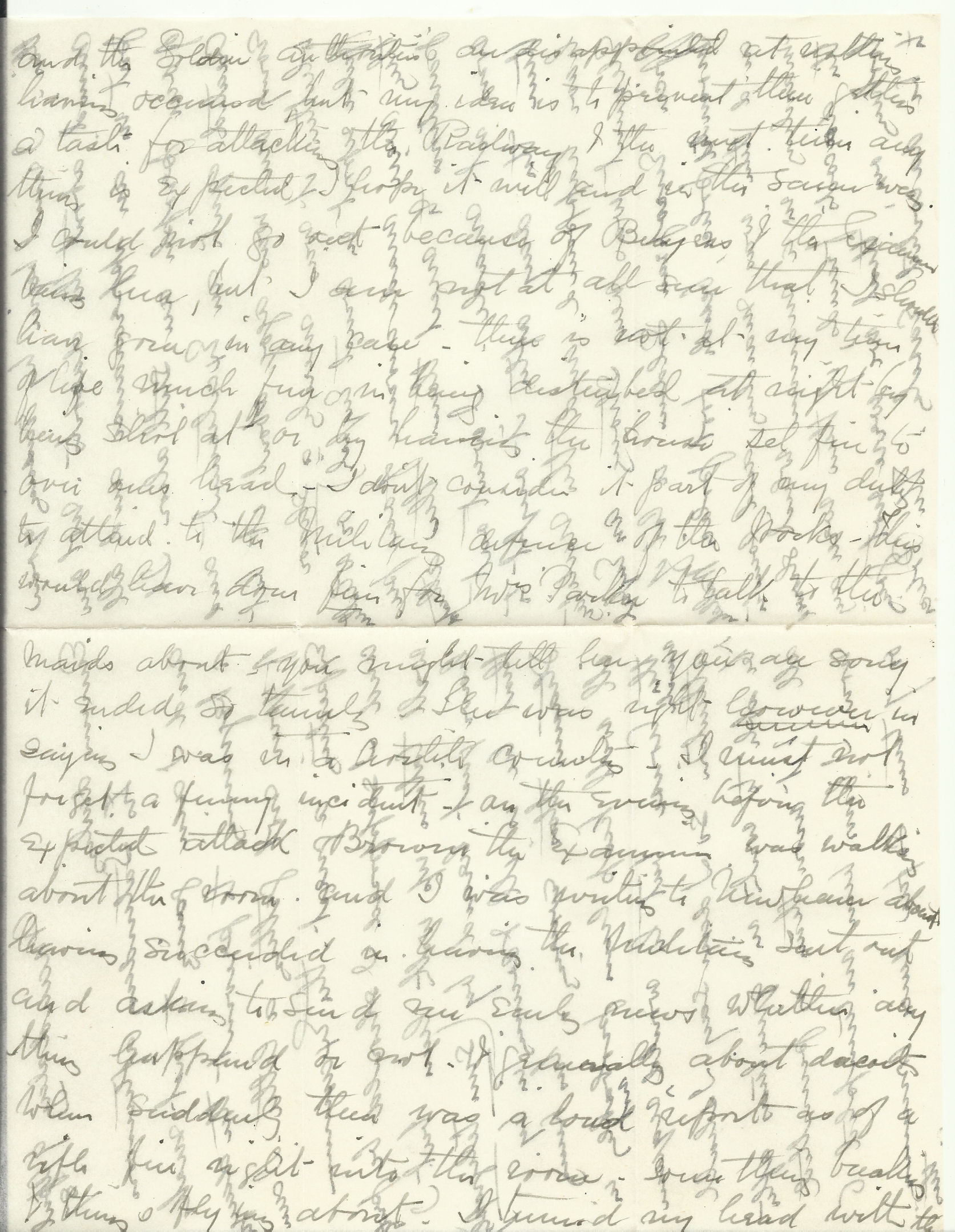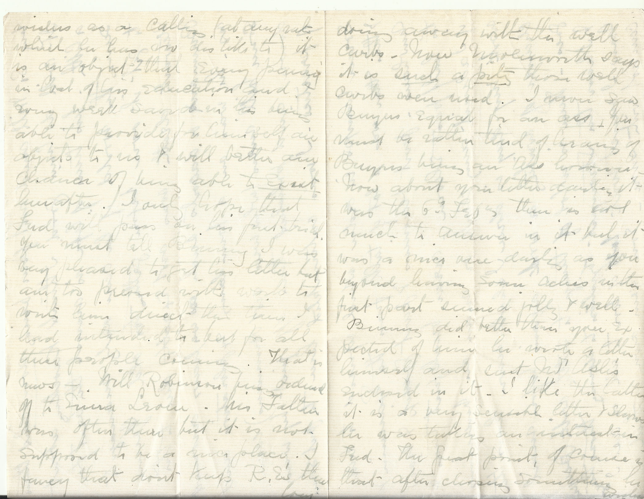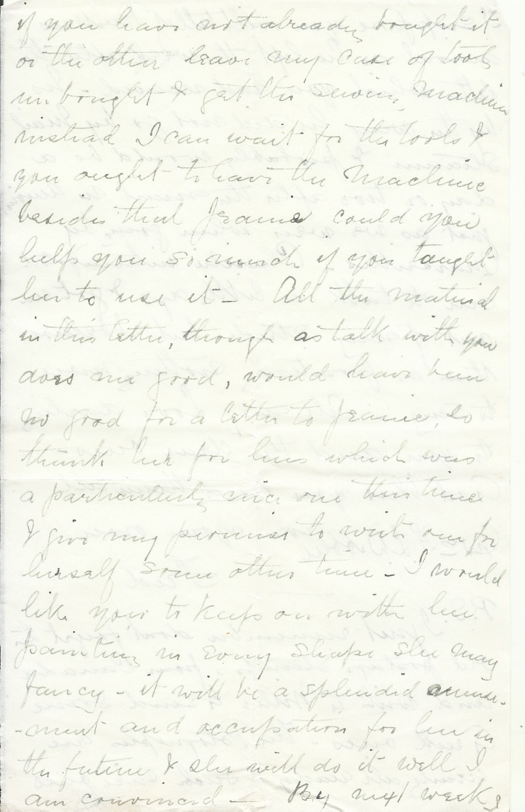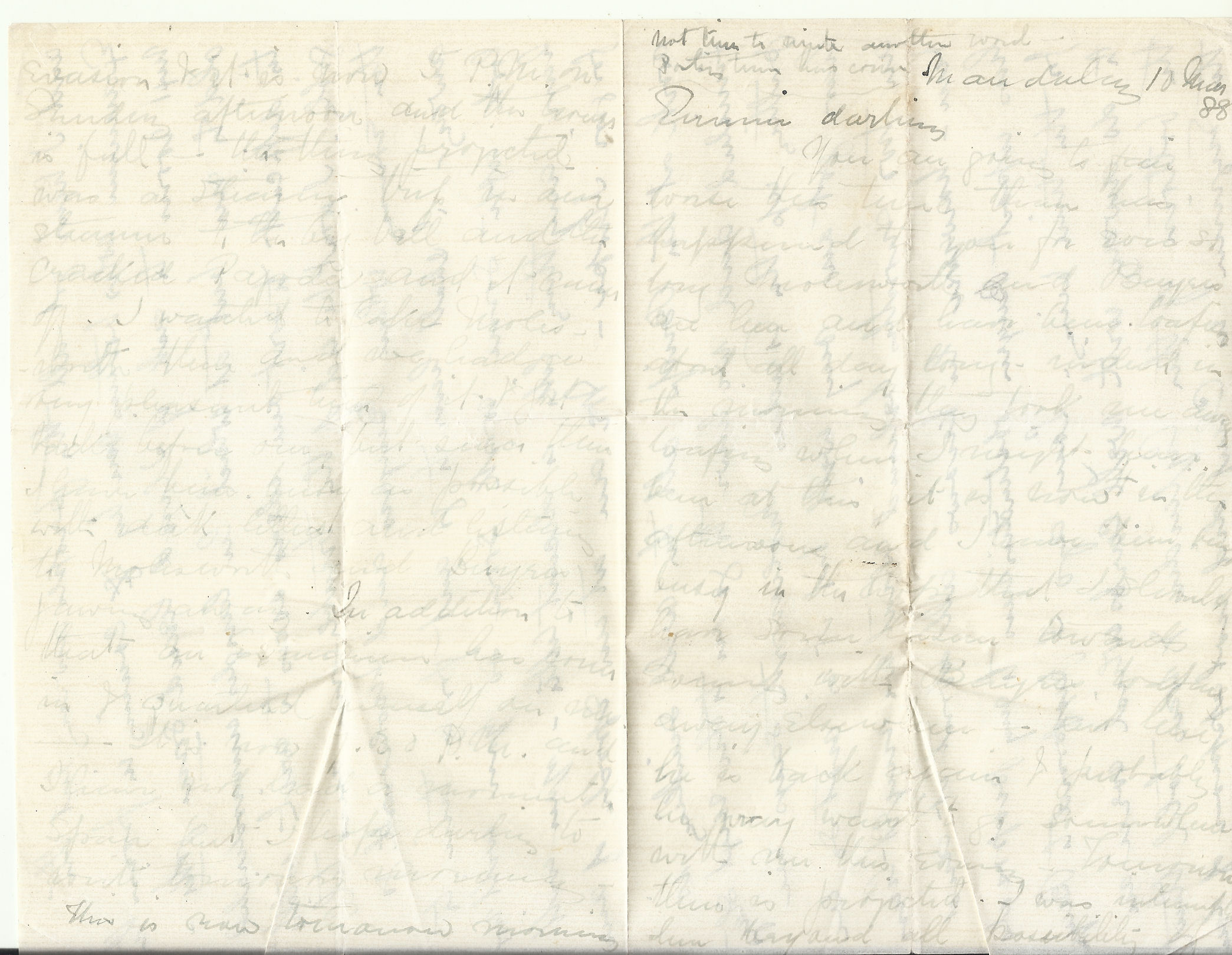 Since writing the above, I went and paid a visit on Mr and Mrs Finney. You remember him at Poona, darling? And I have finished the letter to Binney, so your share of letter, this time, will be so much shorter. I would not have time, I fear, to write much more, as tomorrow, I shall be dreadfully busy, and as soon I cease to be busy, I must start for Delhi. I wish you could be out with me, in this camping season. The Country is not so good, but the weather, they tell me, is splendid, so cold & dry. I am going to invest in Country cloth at Cawnpore, and make a big Ulster, & how I wish you could tell me how to do it.