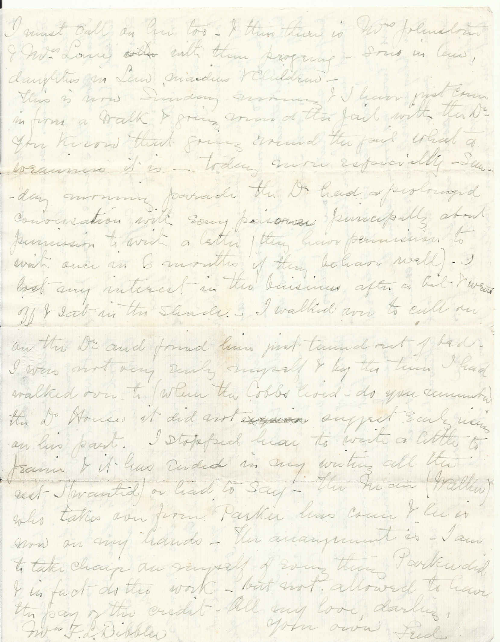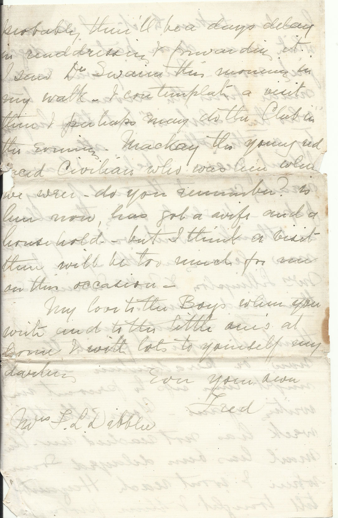 These were found among family papers. They are letters written by Frederick Dibblee (Fred) to his wife Emily (Emmie), or, in a few cases, to George Binney Dibblee (Binney) or Frederick Dibblee junior (Fred), two of this sons.