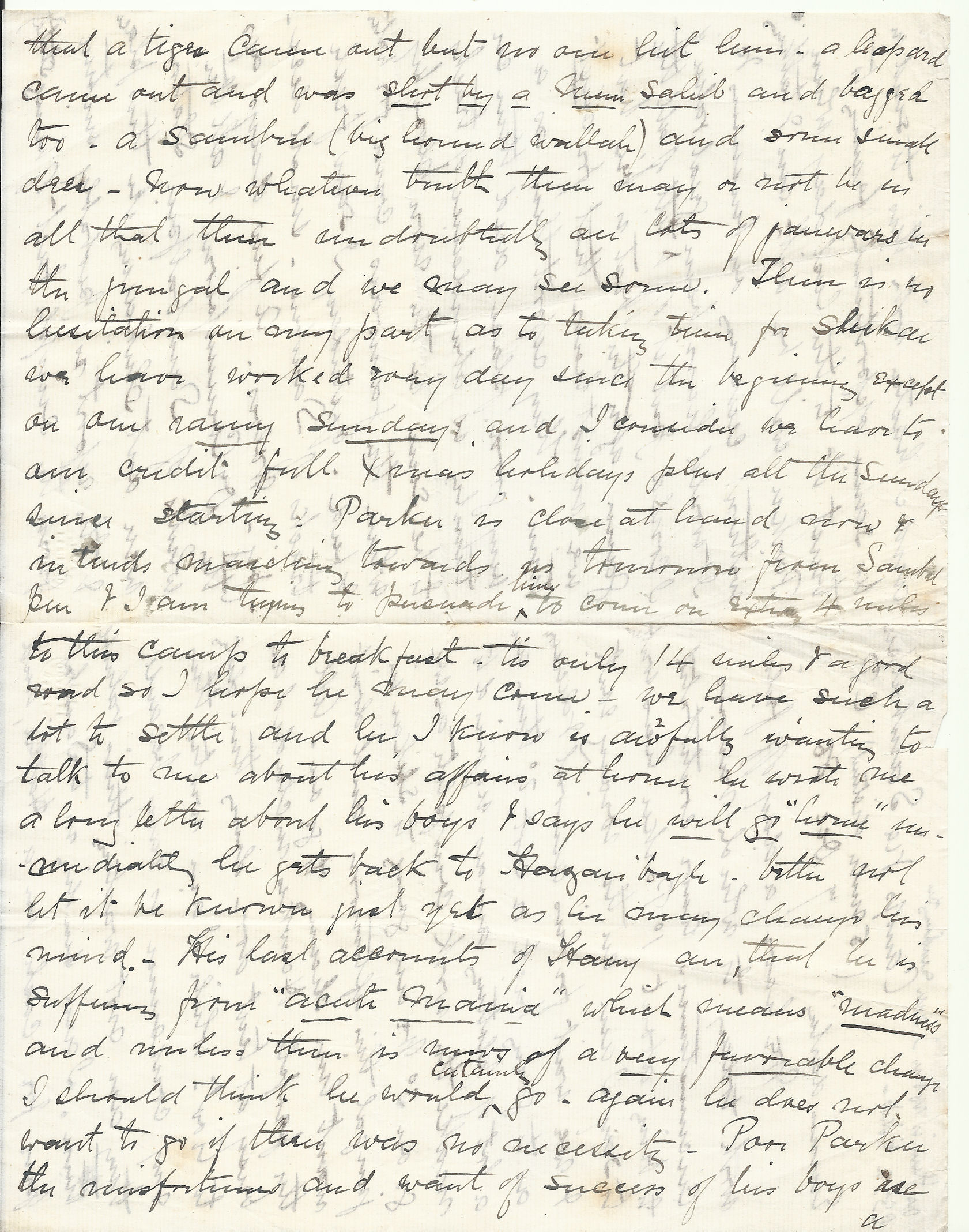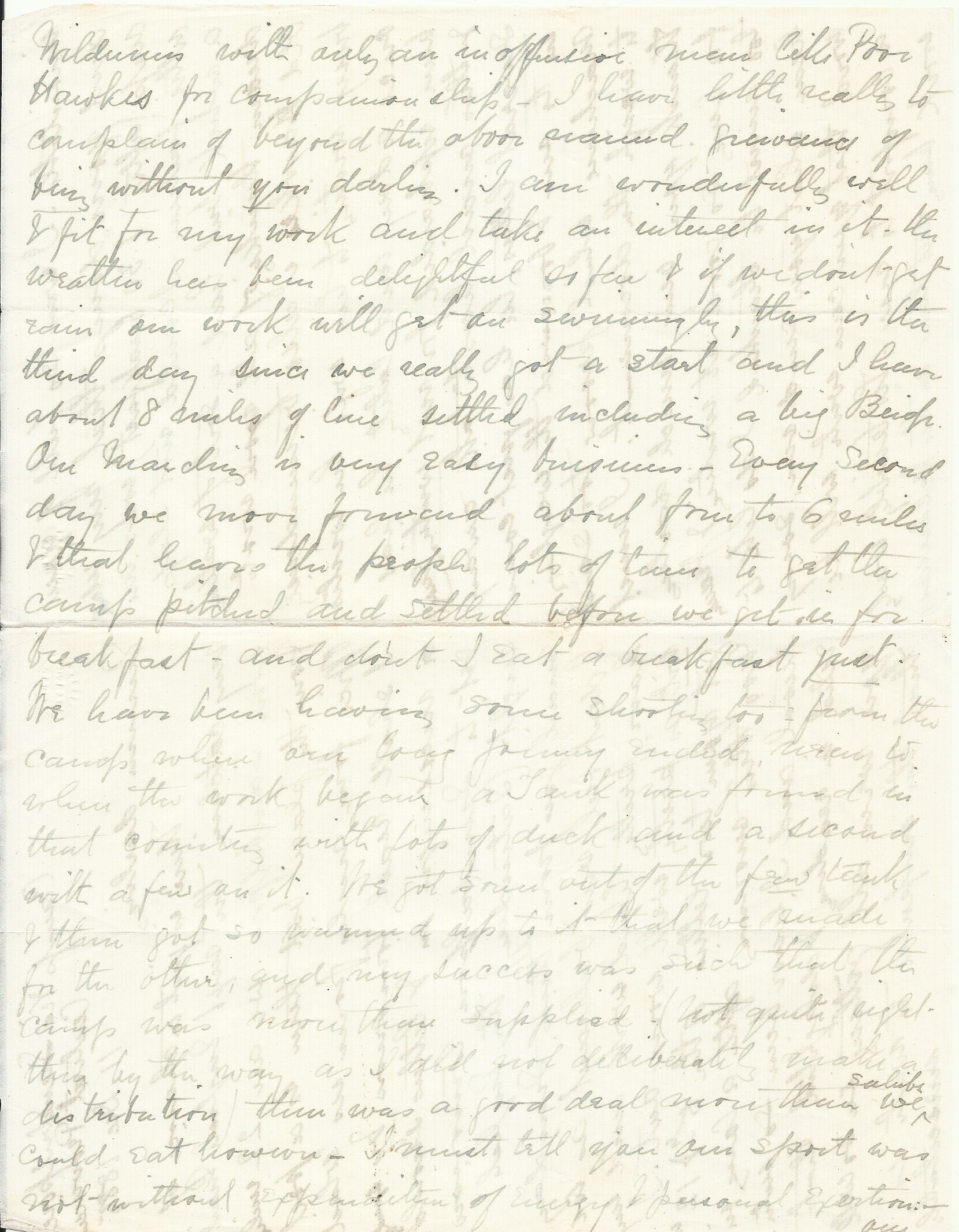 I thought to get away from here, tomorrow night, but cannot manage it now, as my own purchases are not complete, & I must wait for the letter from Delhi. I had a big day yesterday - several hours at least at Belviews - buying enamel iron plates, dishes, cooking pots, and a tremendous lot of tin stores. The plates and things are not as good as those you bought for me, at the Army & Navy, but I think they will do very well, but the things, I got for Degchis, are perfectly charming. They say, tis not good, to take copper things to be tinned, as you cannot get tin wallahs in the Wilderness, so I have got those thin iron enamel, very light and nice shaped. In my other purchases, I think I did fairly well. The old man (Belview's) at the shop said, I had forgotten nothing. He has a pretty big order, which I shall have to pay for, tomorrow. My principal things, left to be done, are cartridges, for such shooting as I may expect, and the supply of liquor, that I require for self and friends, for the next four months.