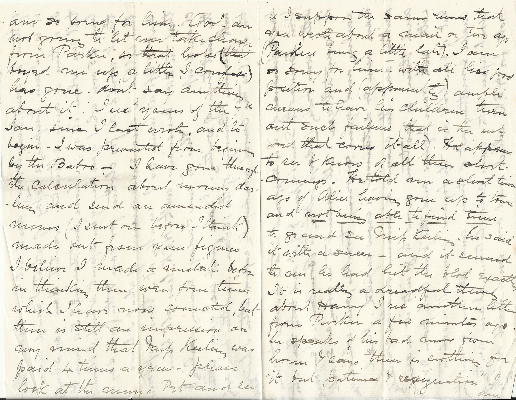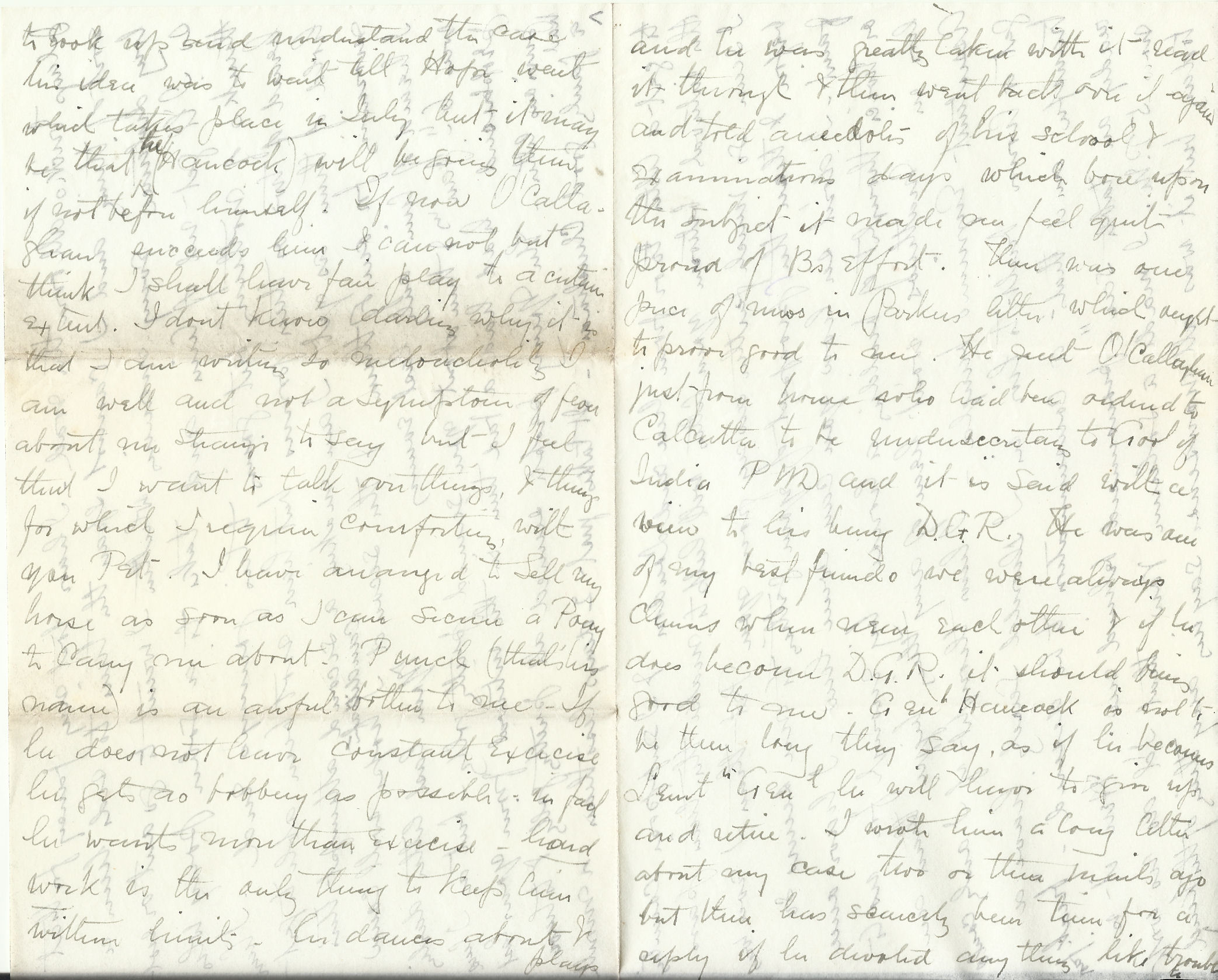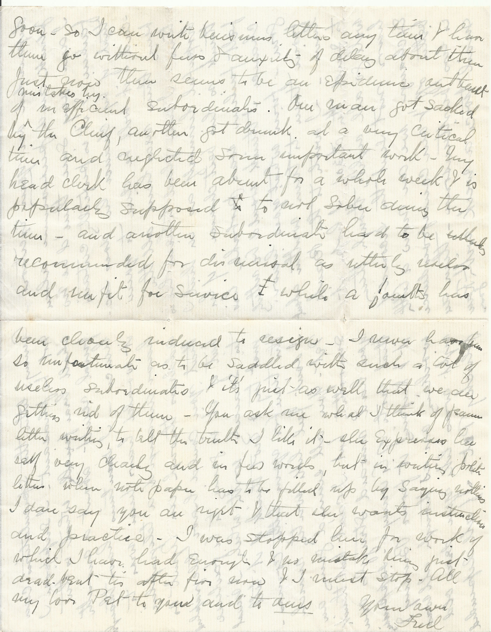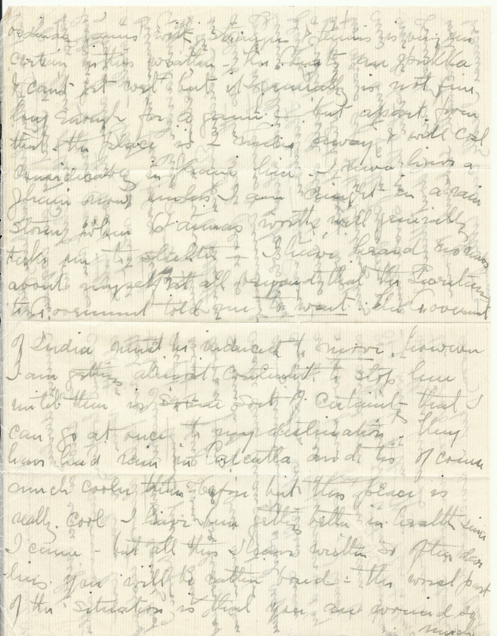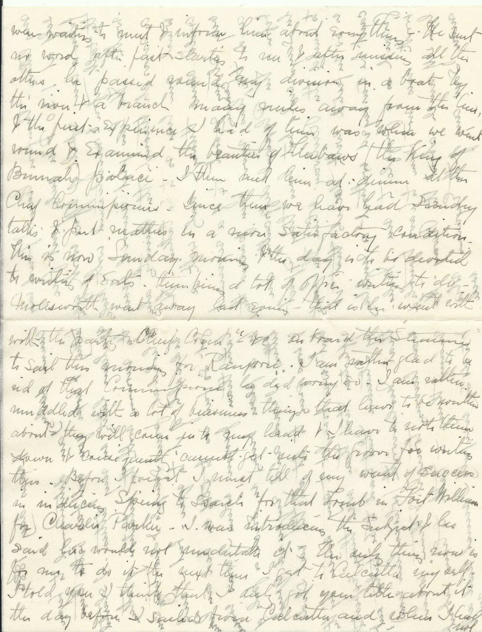 I am writing now, whilst waiting for dinner time to come, there being just a little time, but there will be no time tomorrow, I fear. Those wretched people at Simla took a whole week to reply to the telegraph, about my arrival in Calcutta, & then replied on Saturday afernoon, after the office (Secretariat) here been closed, so that I got it only at midday today, & now, there is actually not time to do, what is wanted, and get the things on to Bell, before he arrives at Karachi. I will wind up, Pet, for fear there'll be no time tomorrow, but will add something if it is possible.