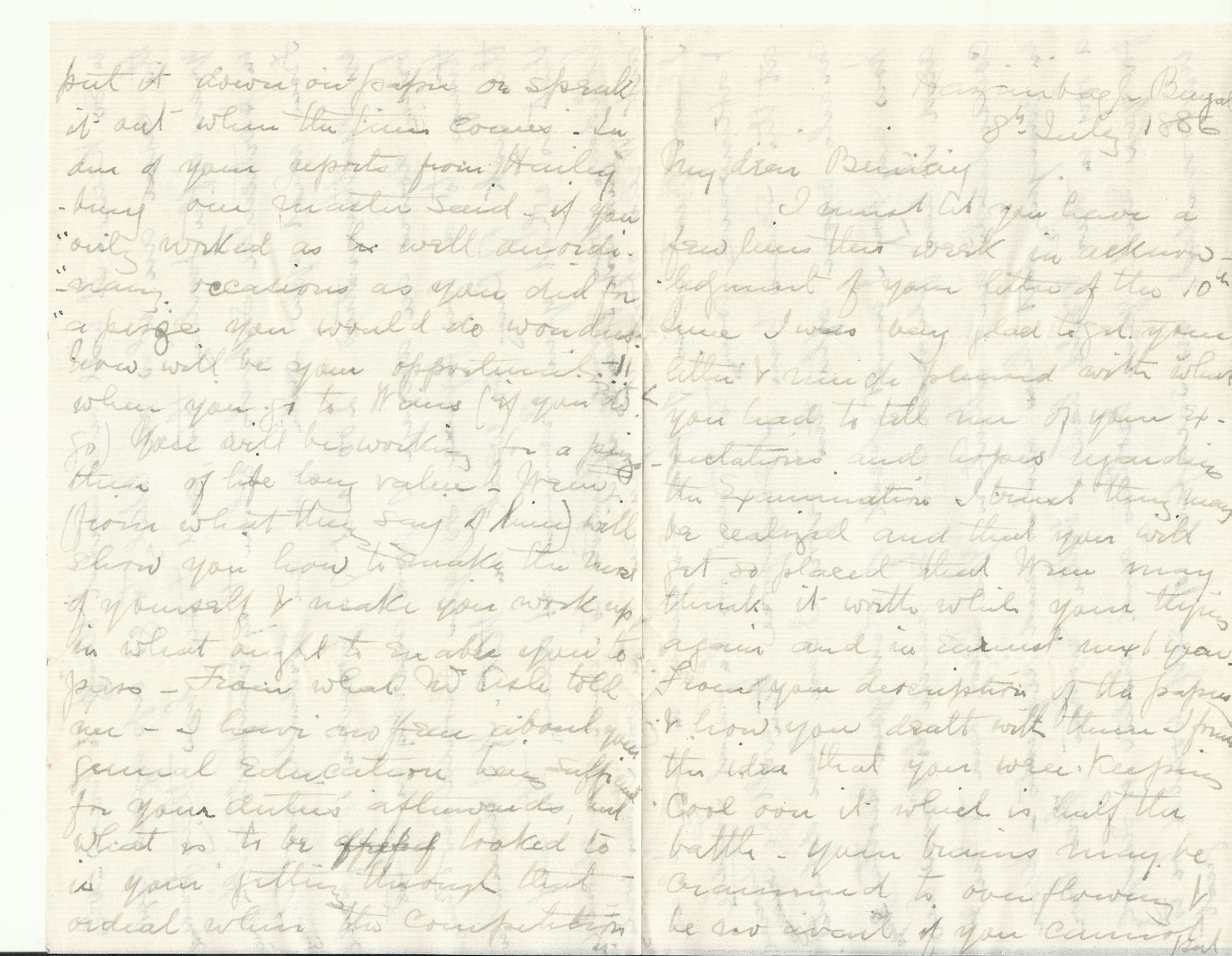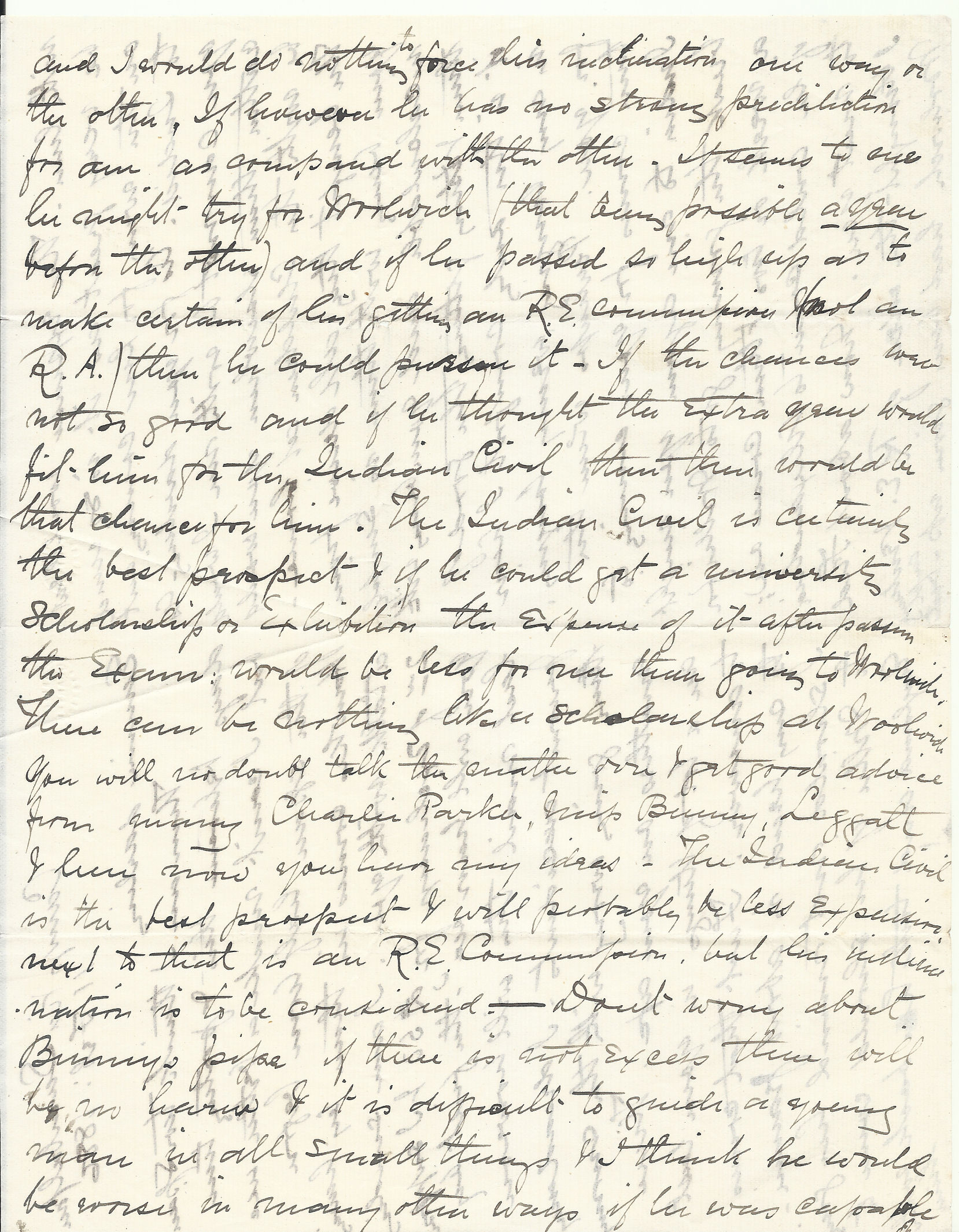 I must send you a few lines to go in Mothers letter, to tell you directly, how pleased I am at your success. I think it very well indeed, your getting such a good place in the exam for Woolwich, and the few, with whom I could talk to hear about it, say it was particularly good at your age, and without special preparation. It appeared in the English papers, & people, who knew me, saw it and congratulated me. With regard to the future, the matter will be pretty well decided, before this reaches you, and your prospect seems a very fair one, in any case.