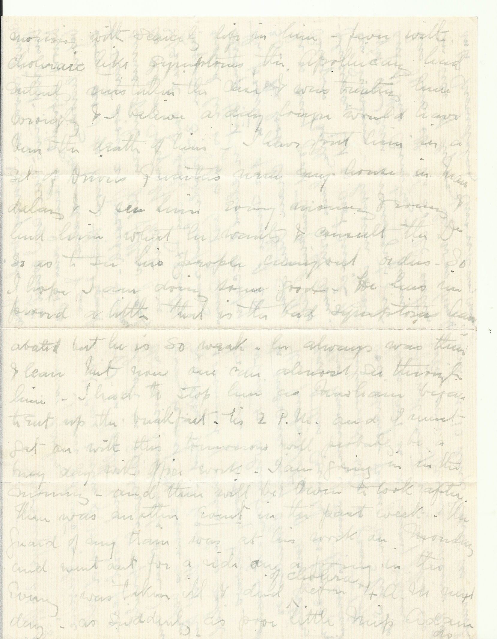 On Friday morning, when I went over, to arrange about a room in the Hospital for him (as he and I had agreed upon the previous day), I found him delirious, and looking very bad, so after giving him two spoonfuls of iced water, I went off to bring the Doctor. I could not find him, so brought another Doctor, but it was then too late. His own Doctor had, in the meantime, come, but he was beyond human skill, & soon after expired.
