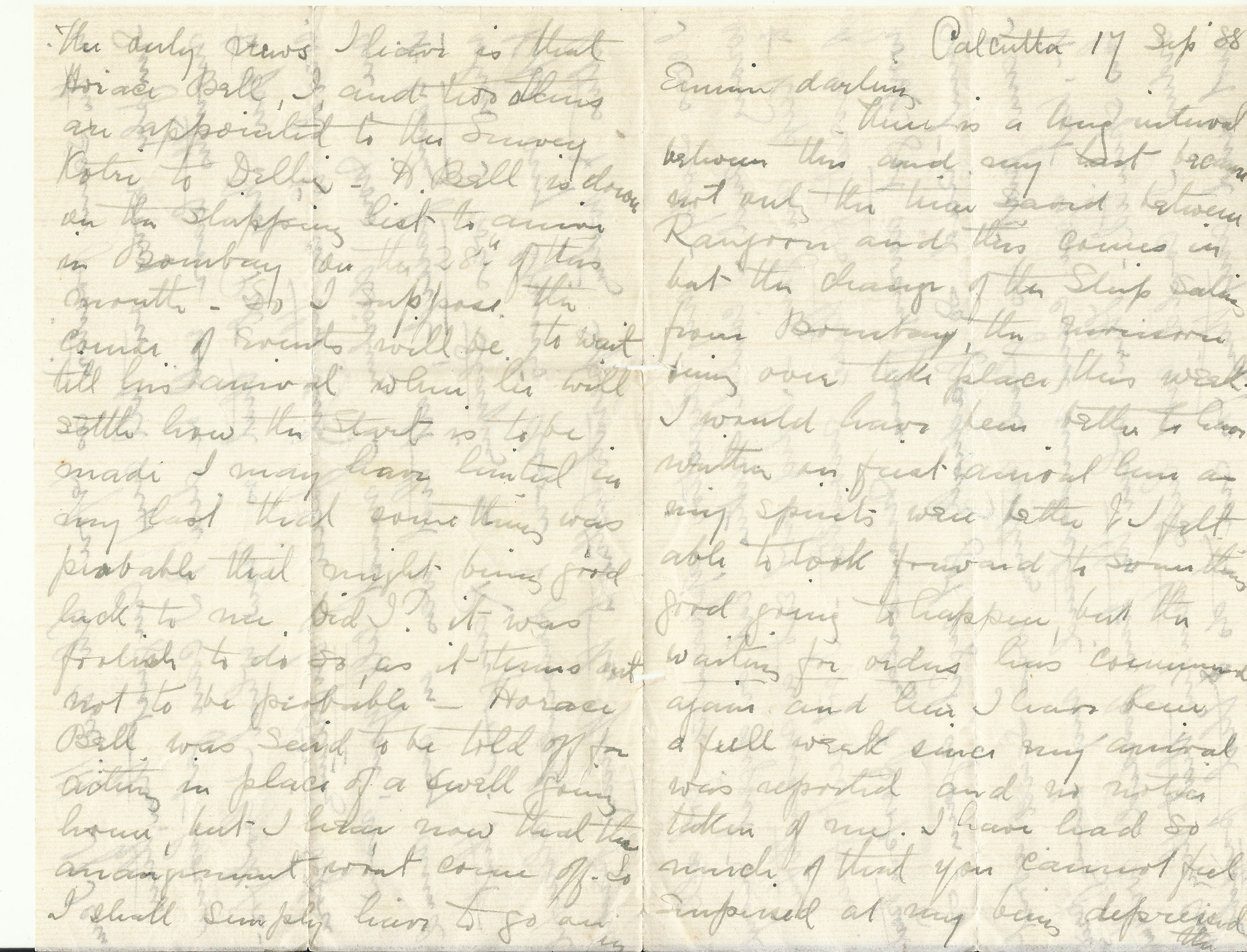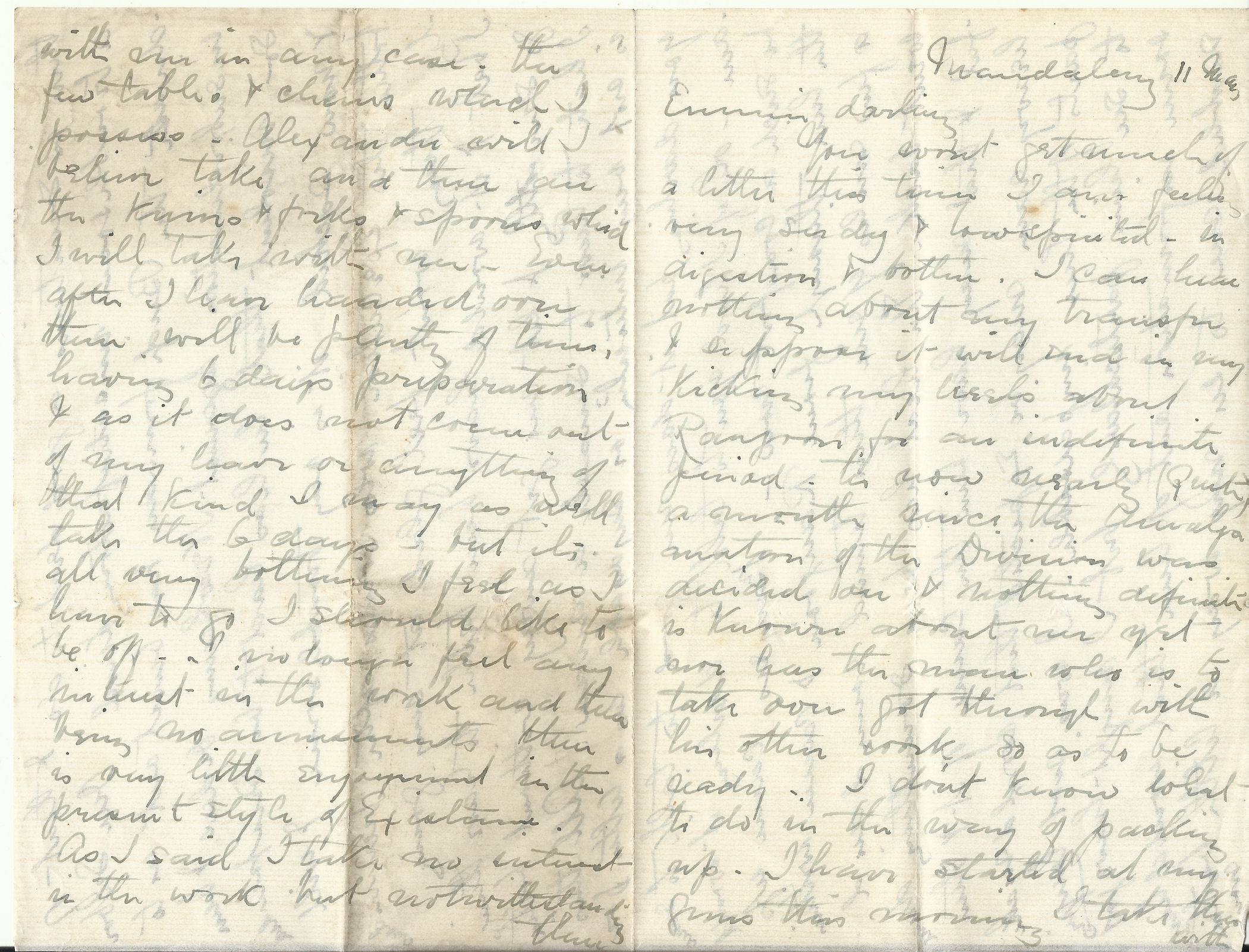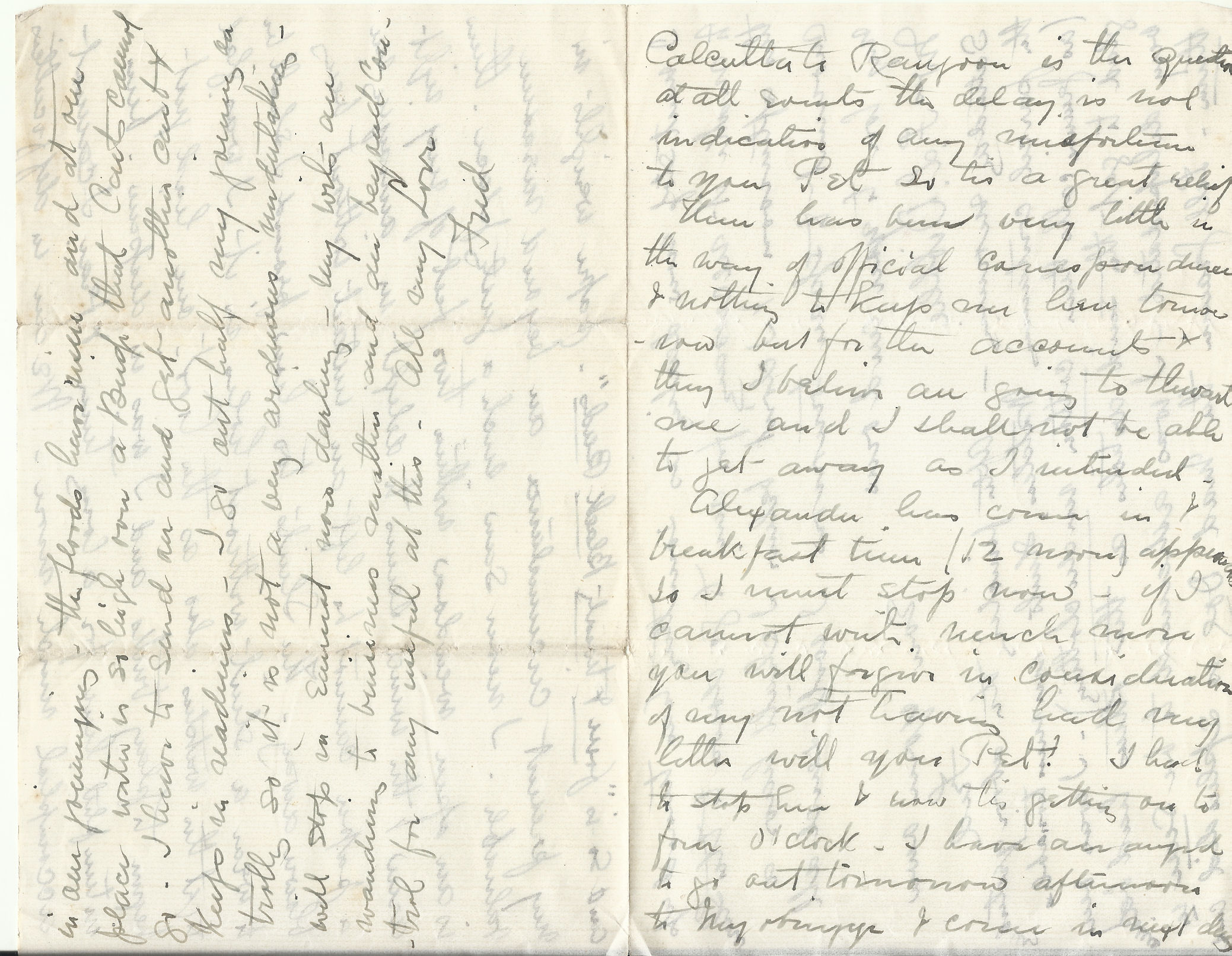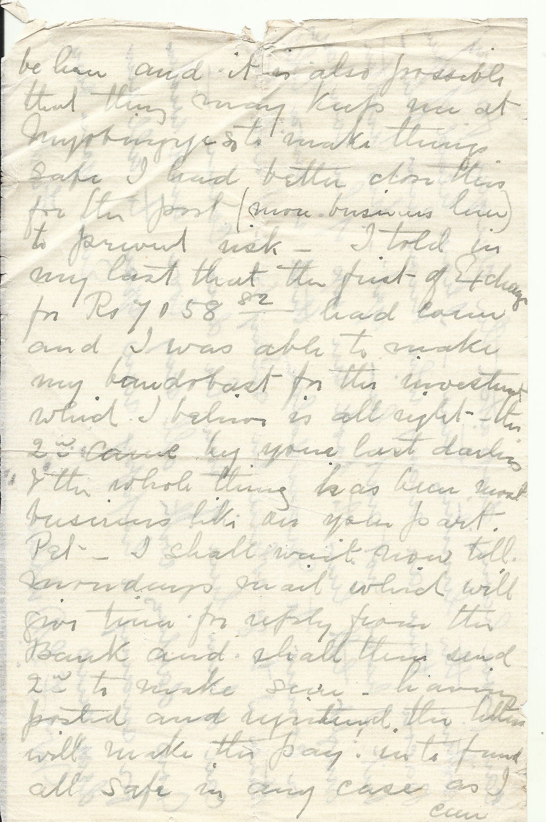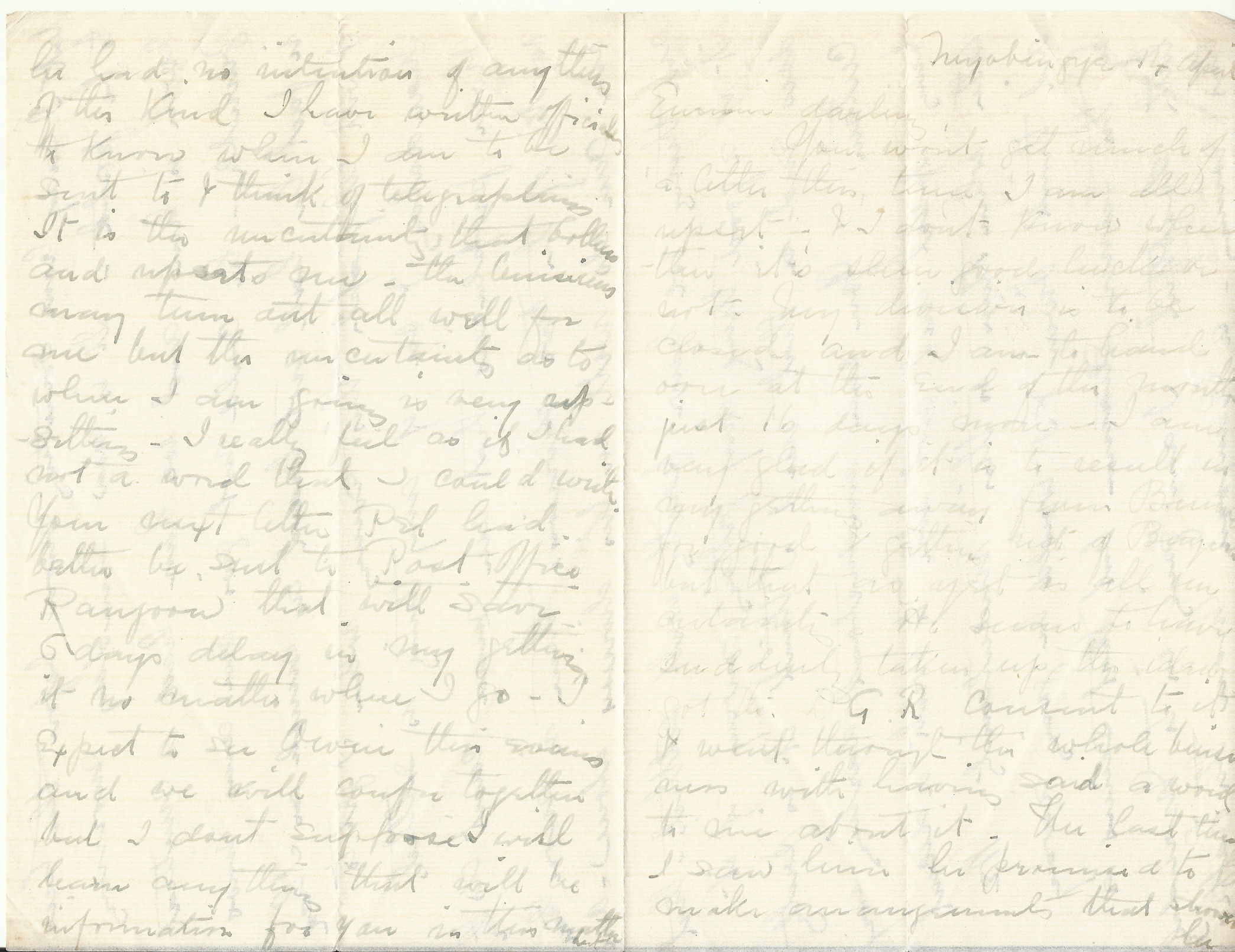 I am not going to write much at this sitting, only just enough to show that I am sane. There is not much to spare however. I hope to finish on board ship, on the way to Calcutta. Orders came for me at last, on Saturday evening, and since then I have been in a state of preparation, more or less. All my packing appears, however, yet to be done. Things that I have had in daily use, since I came to Rangoon, are all out and about. I intended doing it yesterday, but it took me all day long, to get my pay settled, & the cheques for it in the office, & I was able to do absolutely nothing besides, did not get back till after 5, to my tiffin at the Club. I find it's no use, darling, trying to write now. The bills, about me, are all wrong. One man has neglected to send his, and must now be looked up personally, in his shop. Besides there is my banking business, & remittance to you, darling, to be seen to, & I must off. I intended having my packing done most scientifically, with a view to the change of climate in India, but alas, the time seems very short, although it's all day till 3 tomorrow morning. I wish you were here, Pet. Good bye now till from board ship.
