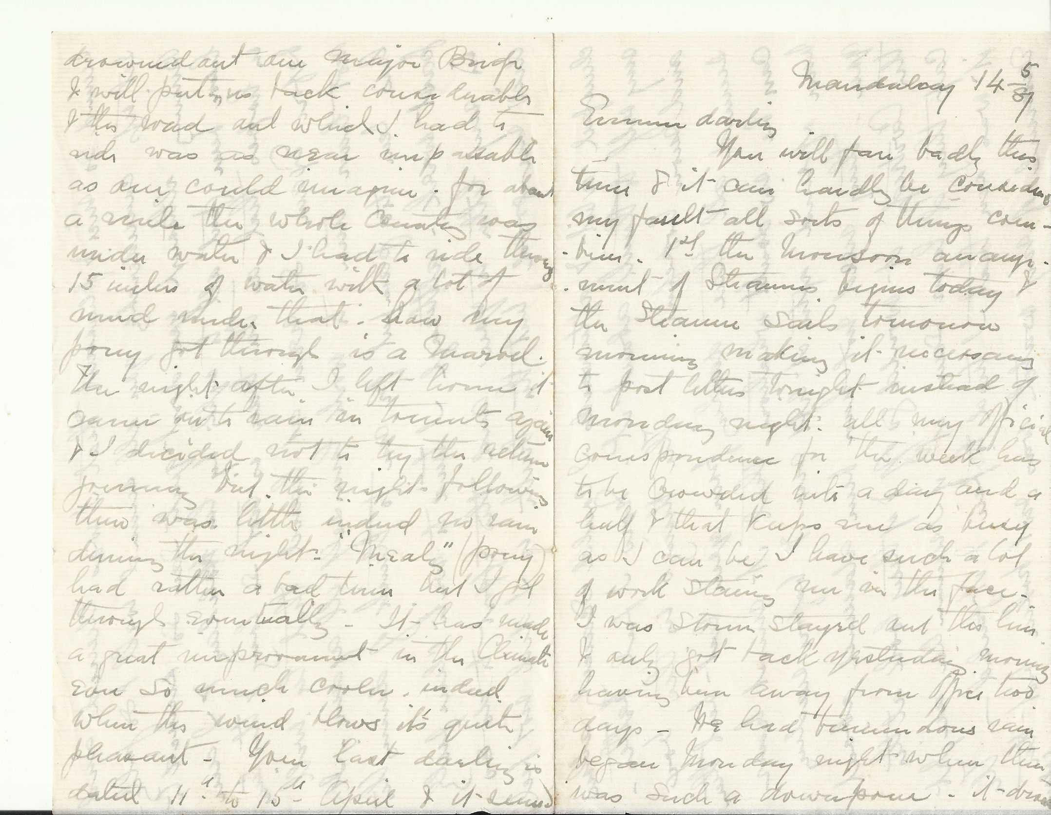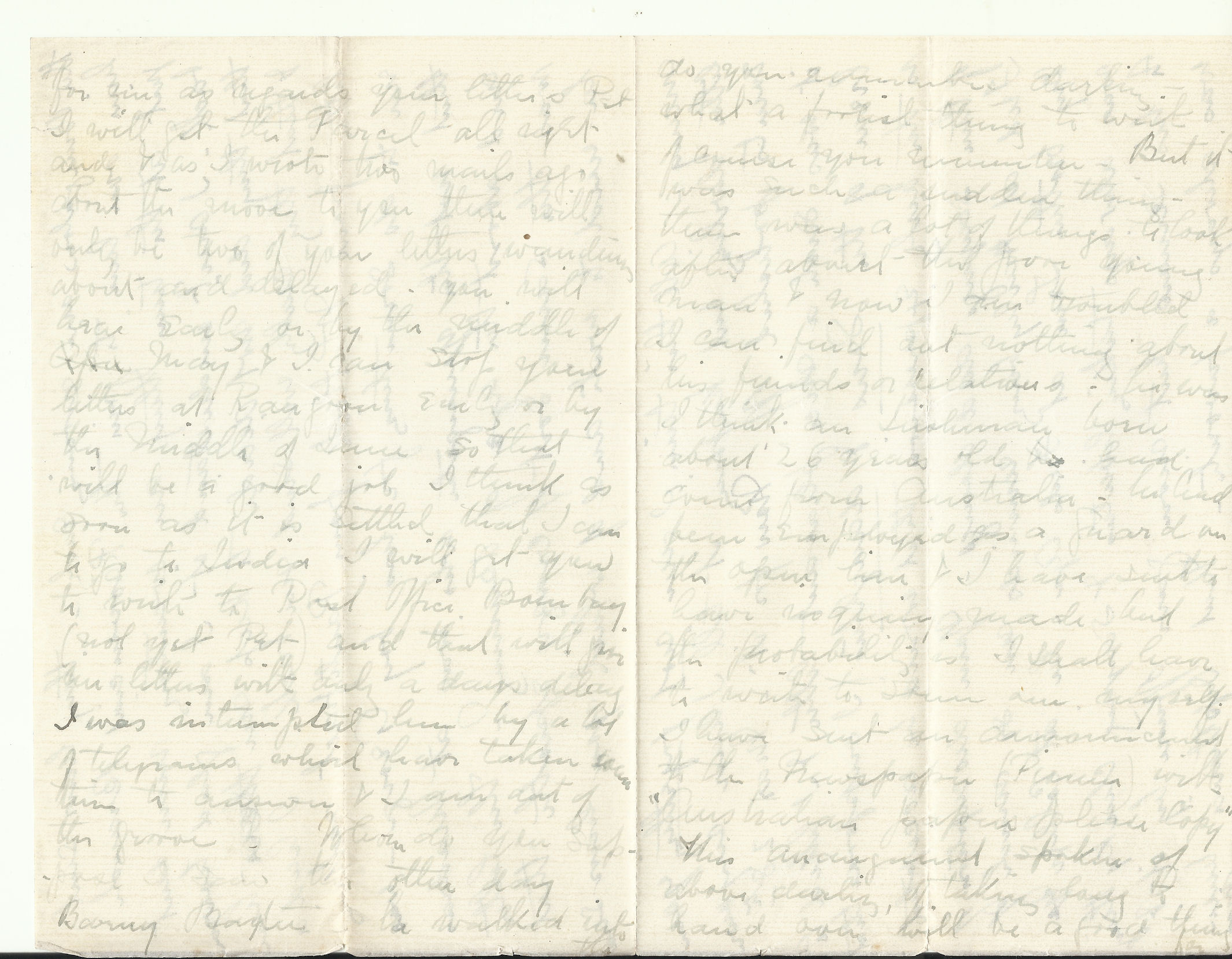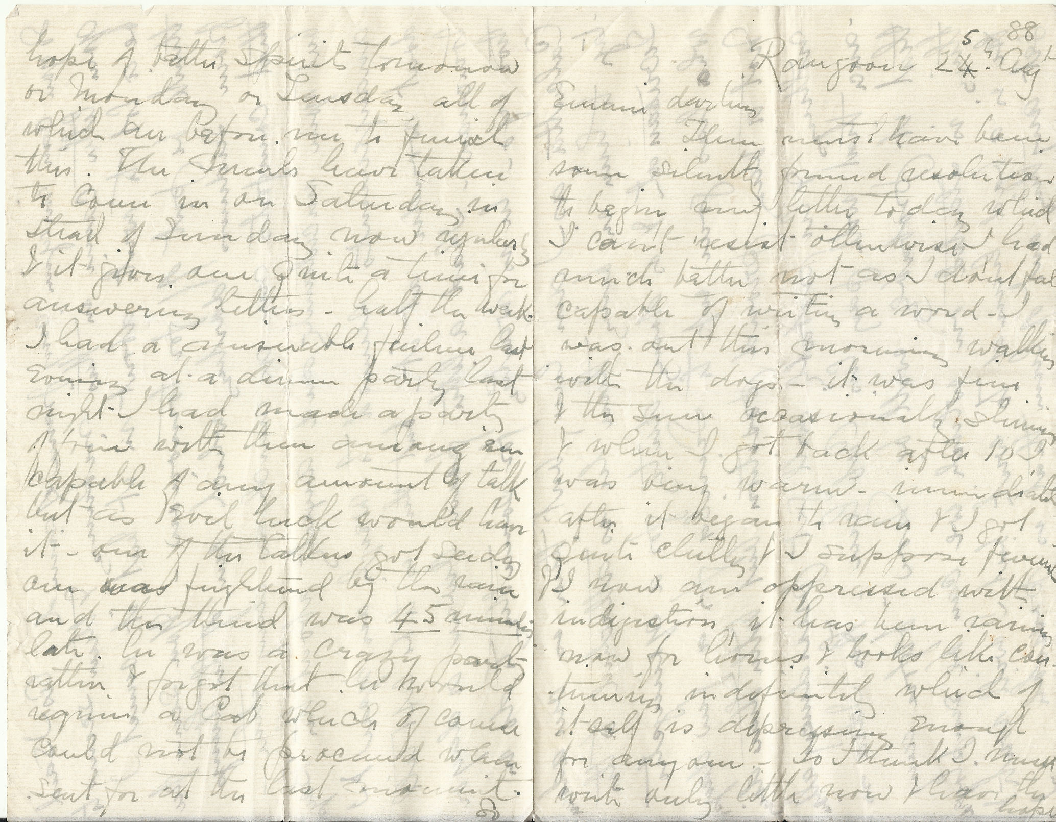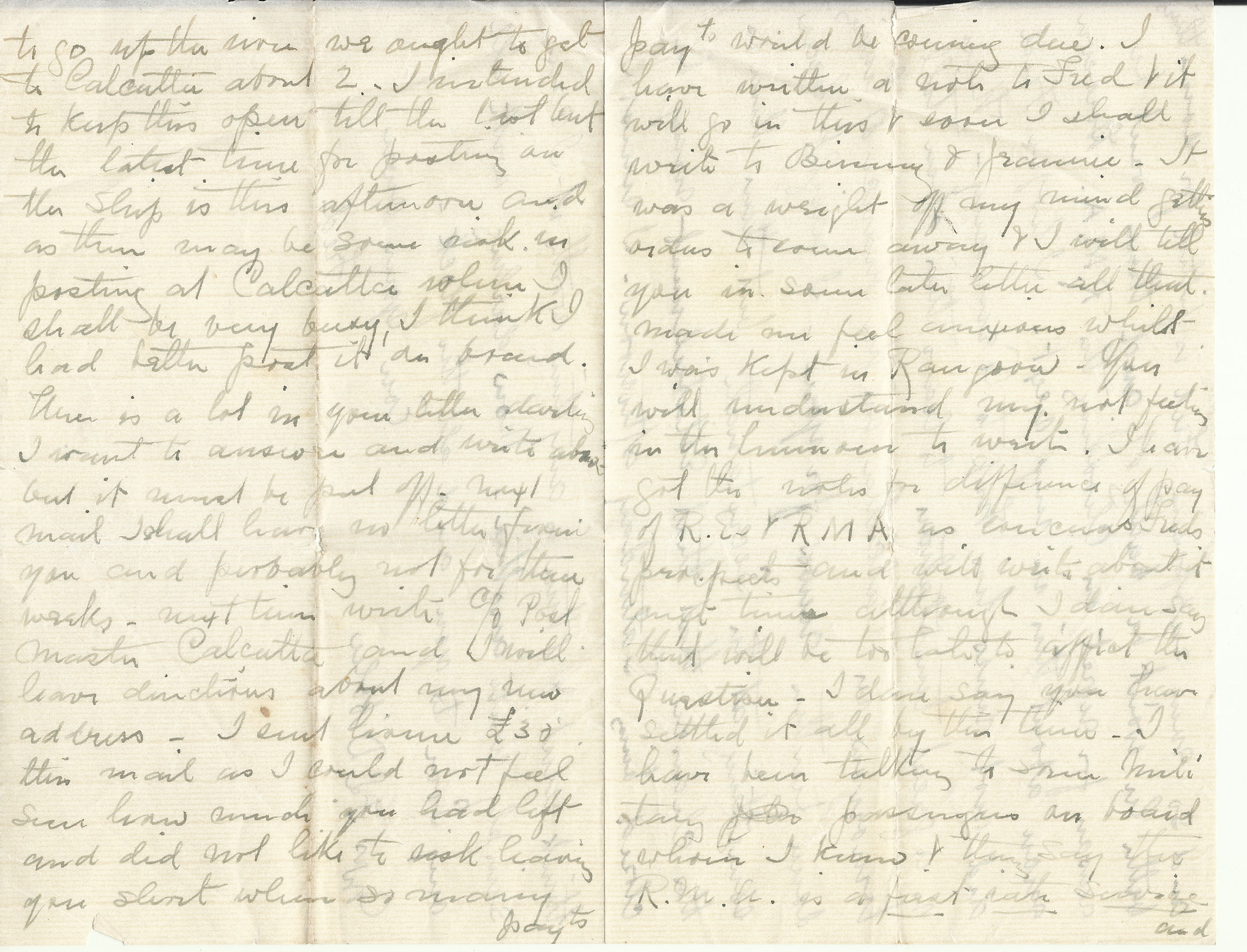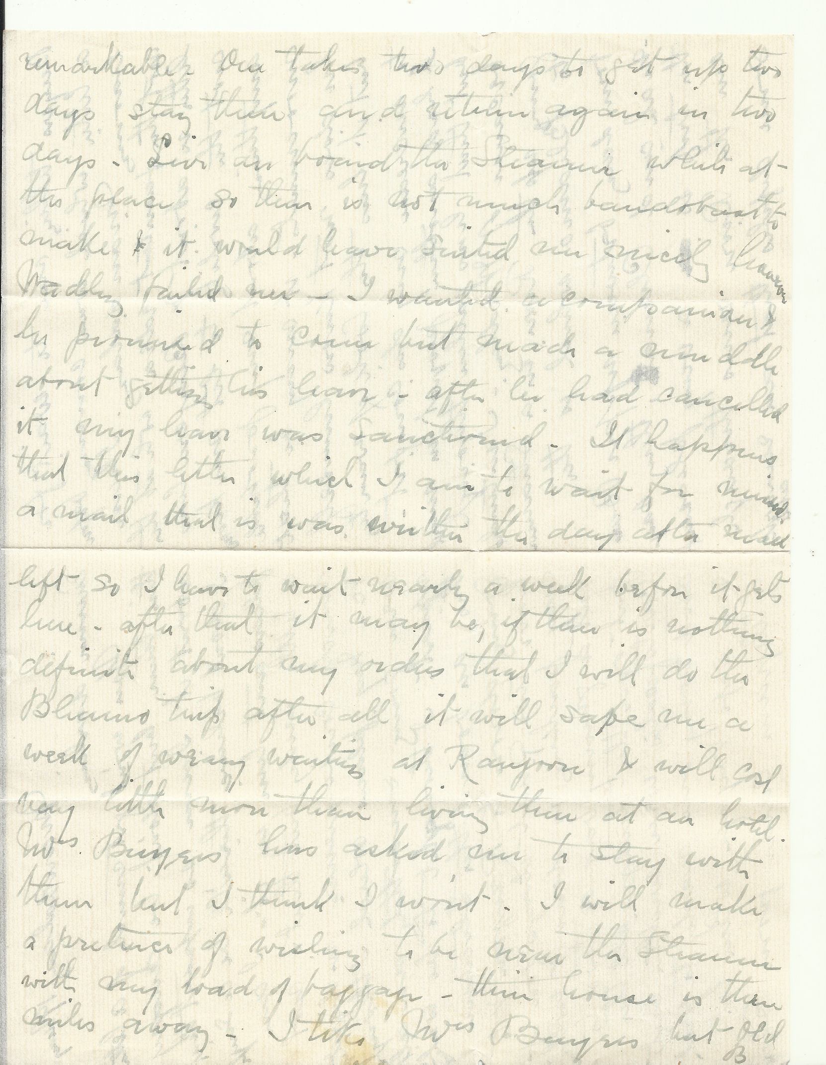 I am not going to write much at this sitting, only just enough to show that I am sane. There is not much to spare however. I hope to finish on board ship, on the way to Calcutta. Orders came for me at last, on Saturday evening, and since then I have been in a state of preparation, more or less. All my packing appears, however, yet to be done. Things that I have had in daily use, since I came to Rangoon, are all out and about. I intended doing it yesterday, but it took me all day long, to get my pay settled, & the cheques for it in the office, & I was able to do absolutely nothing besides, did not get back till after 5, to my tiffin at the Club. I find it's no use, darling, trying to write now. The bills, about me, are all wrong. One man has neglected to send his, and must now be looked up personally, in his shop. Besides there is my banking business, & remittance to you, darling, to be seen to, & I must off. I intended having my packing done most scientifically, with a view to the change of climate in India, but alas, the time seems very short, although it's all day till 3 tomorrow morning. I wish you were here, Pet. Good bye now till from board ship.