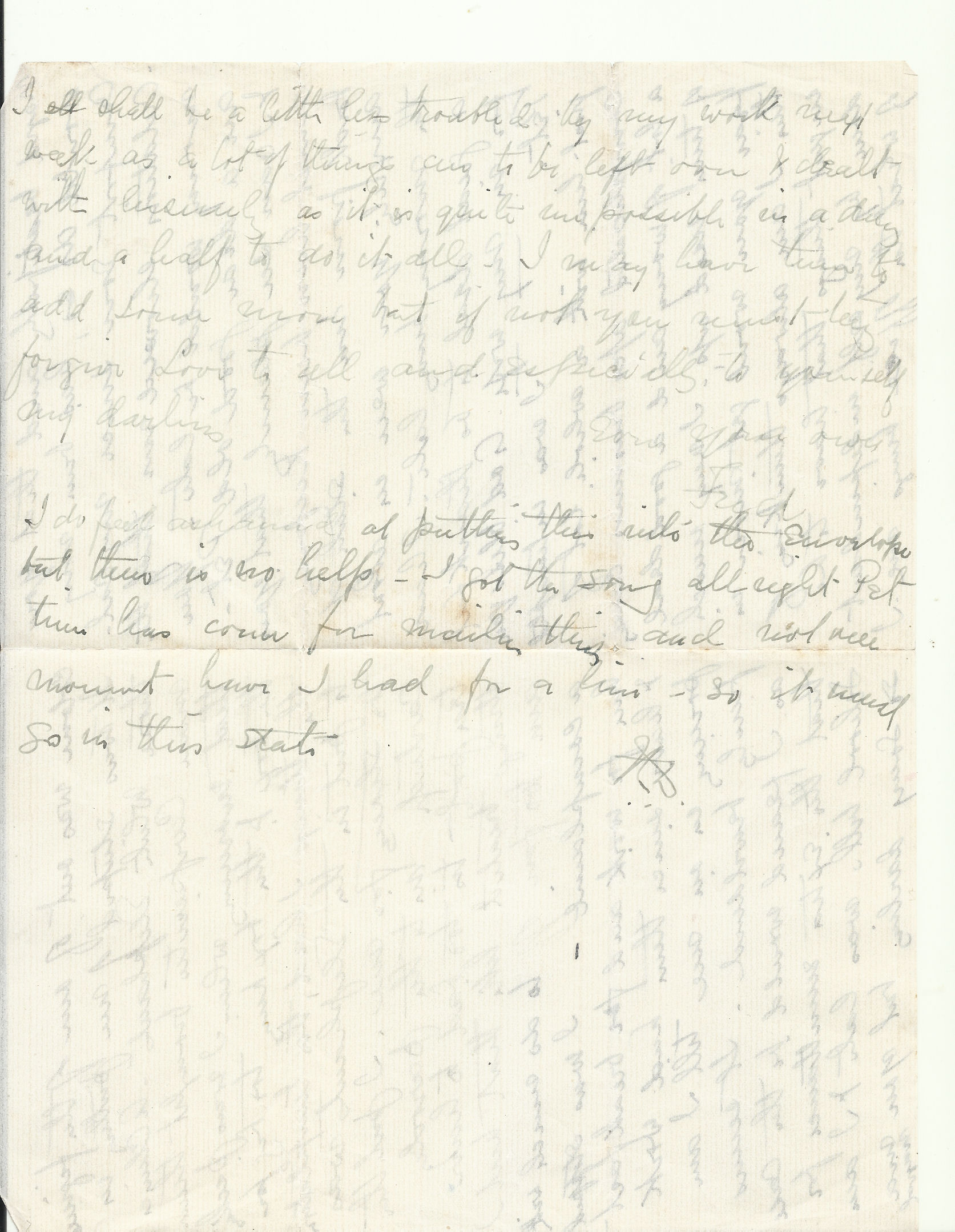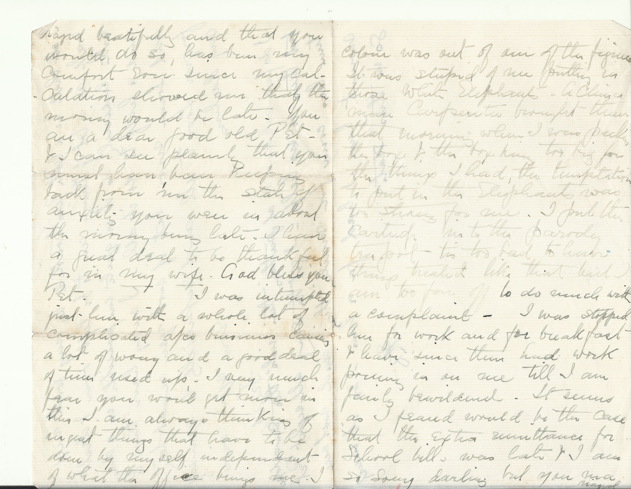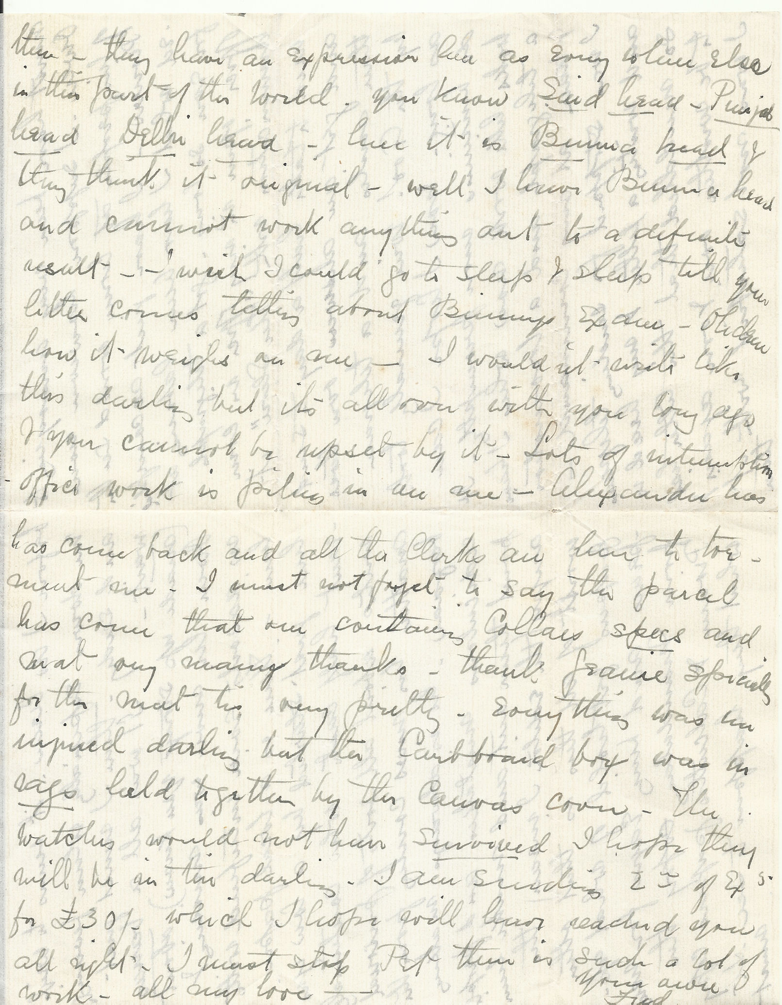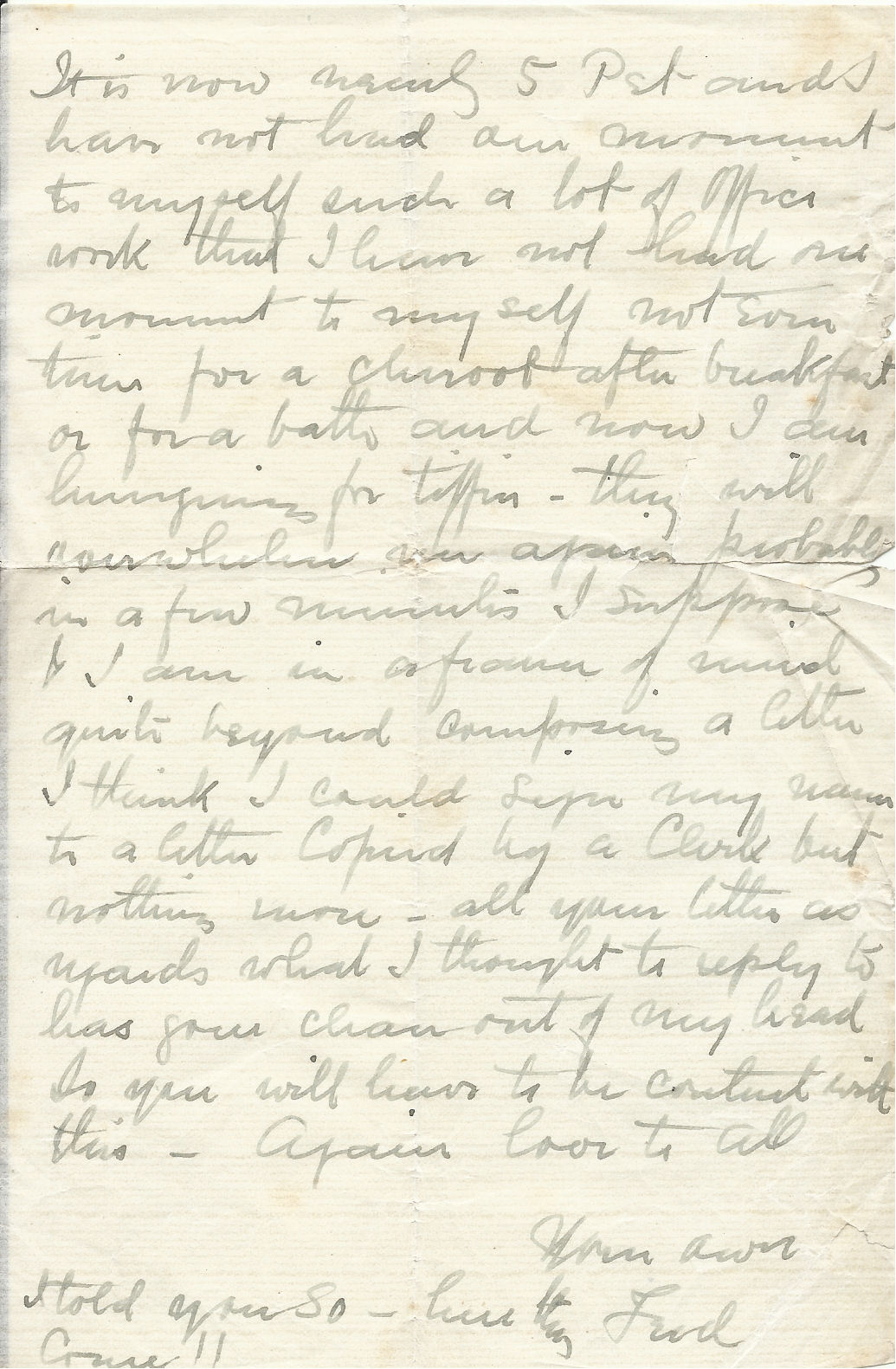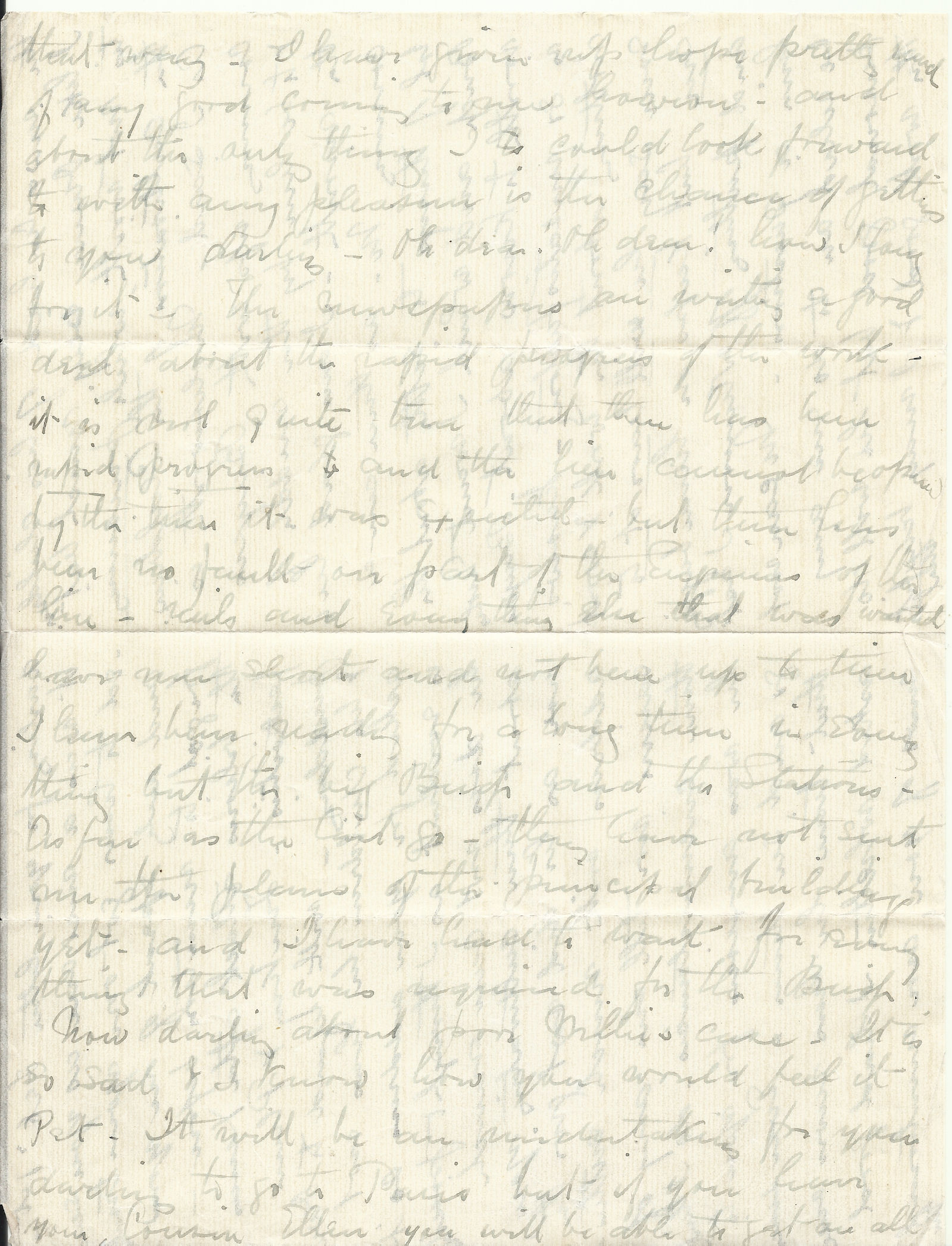 I am not going to write much at this sitting, only just enough to show that I am sane. There is not much to spare however. I hope to finish on board ship, on the way to Calcutta. Orders came for me at last, on Saturday evening, and since then I have been in a state of preparation, more or less. All my packing appears, however, yet to be done. Things that I have had in daily use, since I came to Rangoon, are all out and about. I intended doing it yesterday, but it took me all day long, to get my pay settled, & the cheques for it in the office, & I was able to do absolutely nothing besides, did not get back till after 5, to my tiffin at the Club. I find it's no use, darling, trying to write now. The bills, about me, are all wrong. One man has neglected to send his, and must now be looked up personally, in his shop. Besides there is my banking business, & remittance to you, darling, to be seen to, & I must off. I intended having my packing done most scientifically, with a view to the change of climate in India, but alas, the time seems very short, although it's all day till 3 tomorrow morning. I wish you were here, Pet. Good bye now till from board ship.