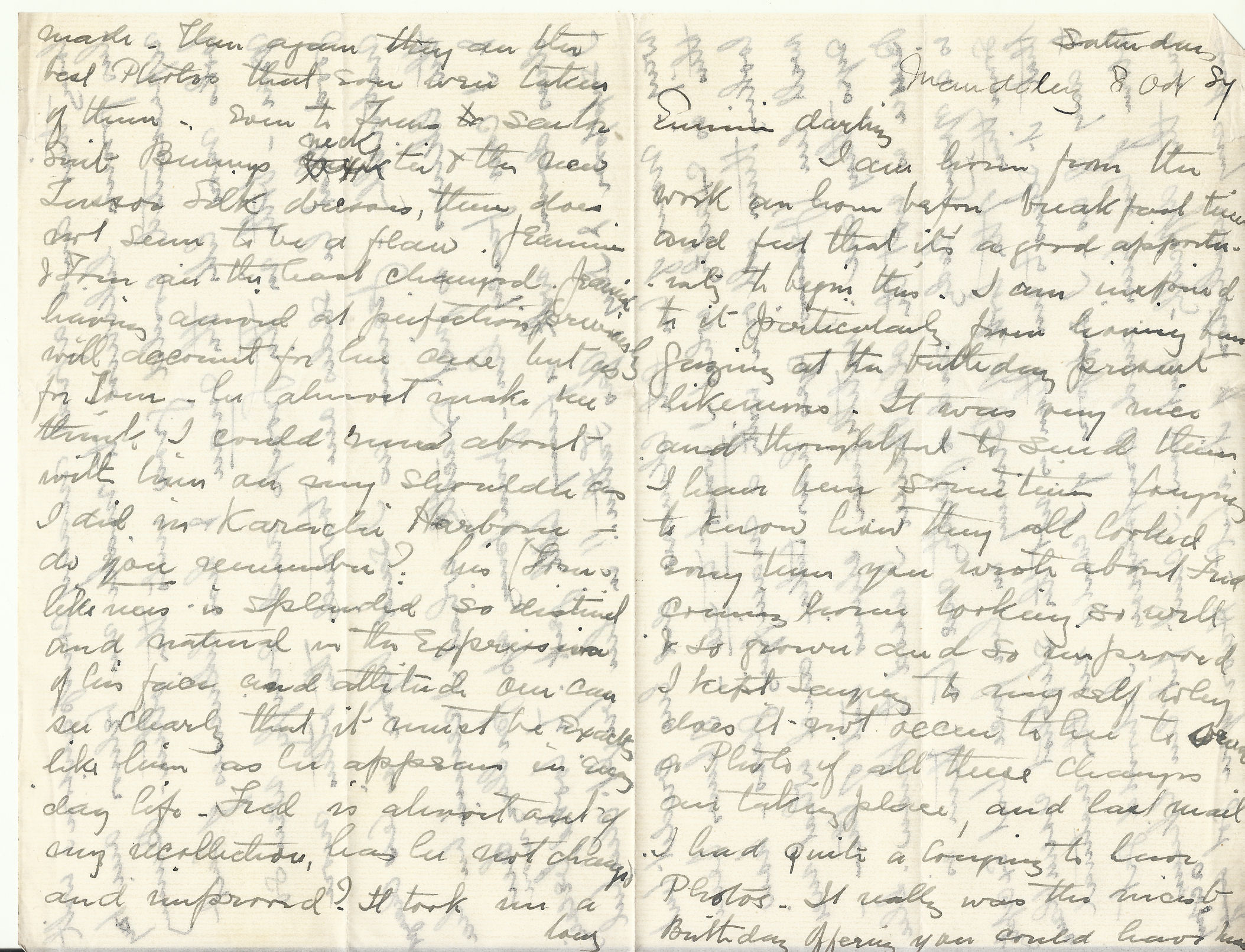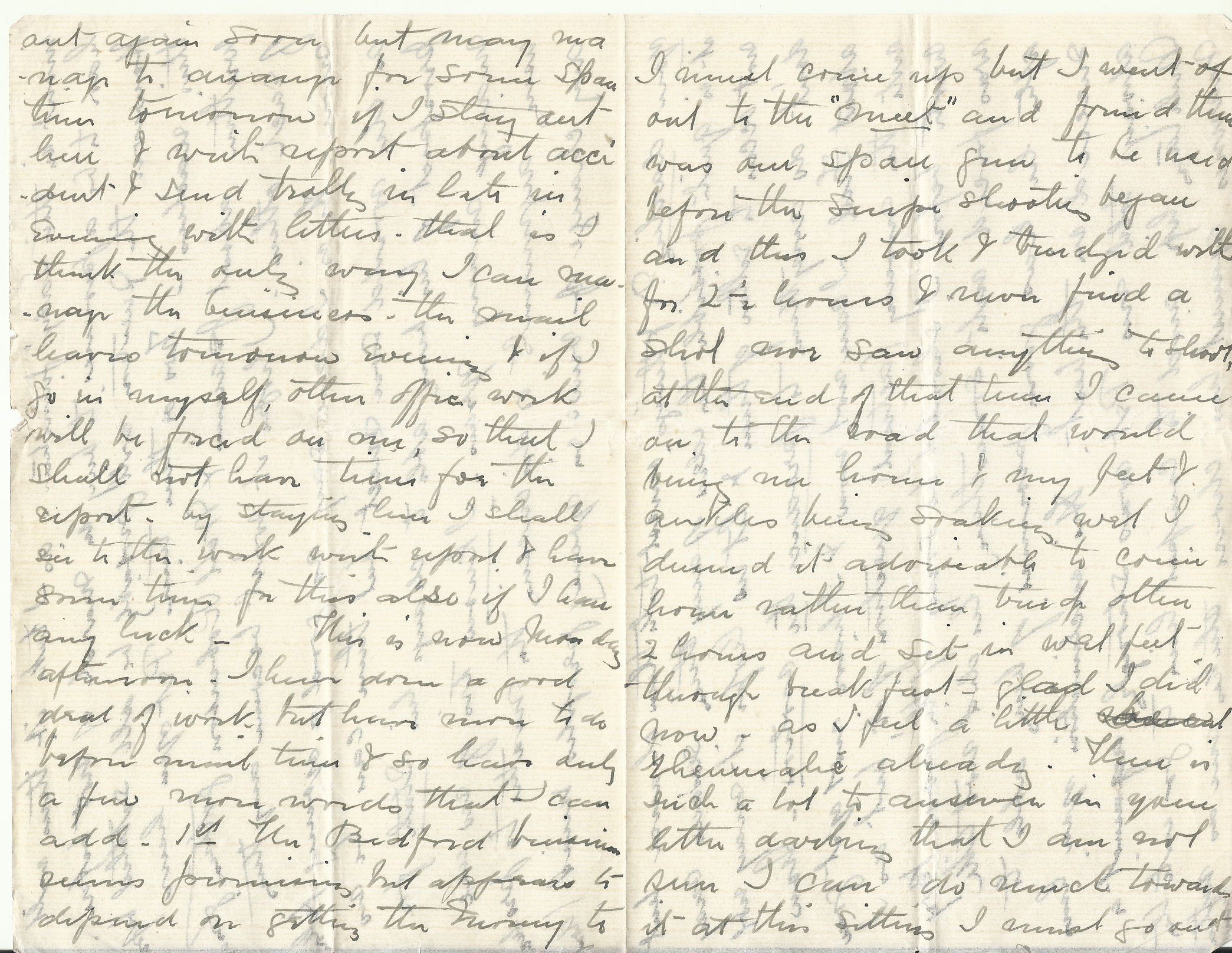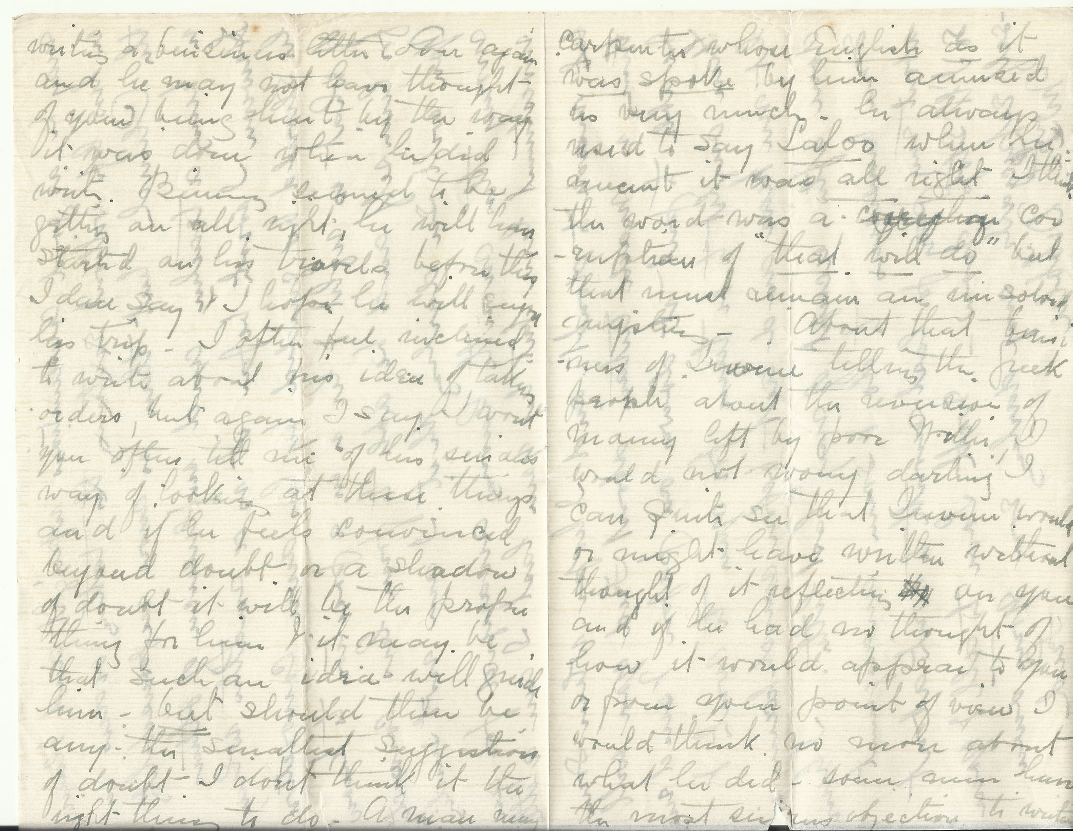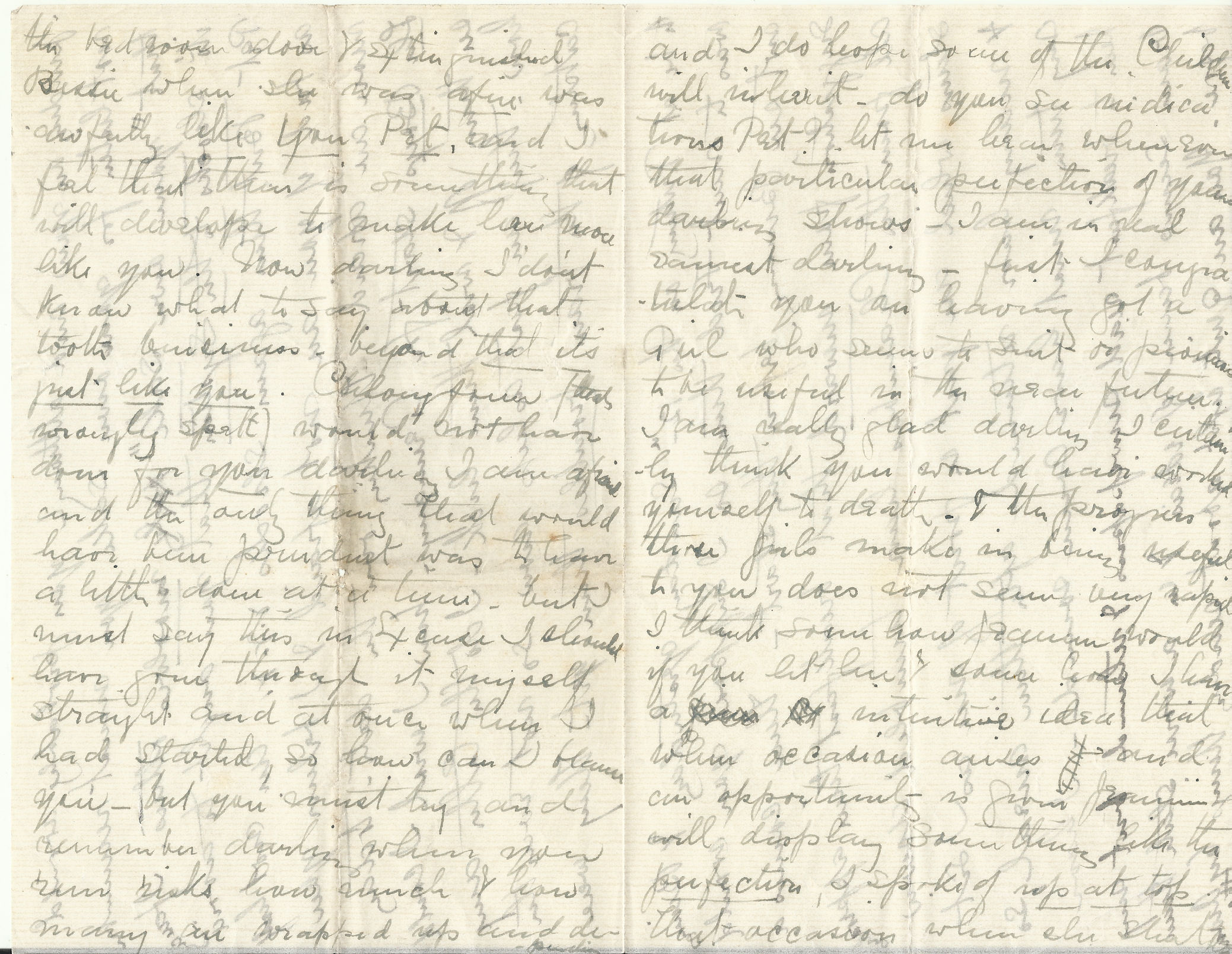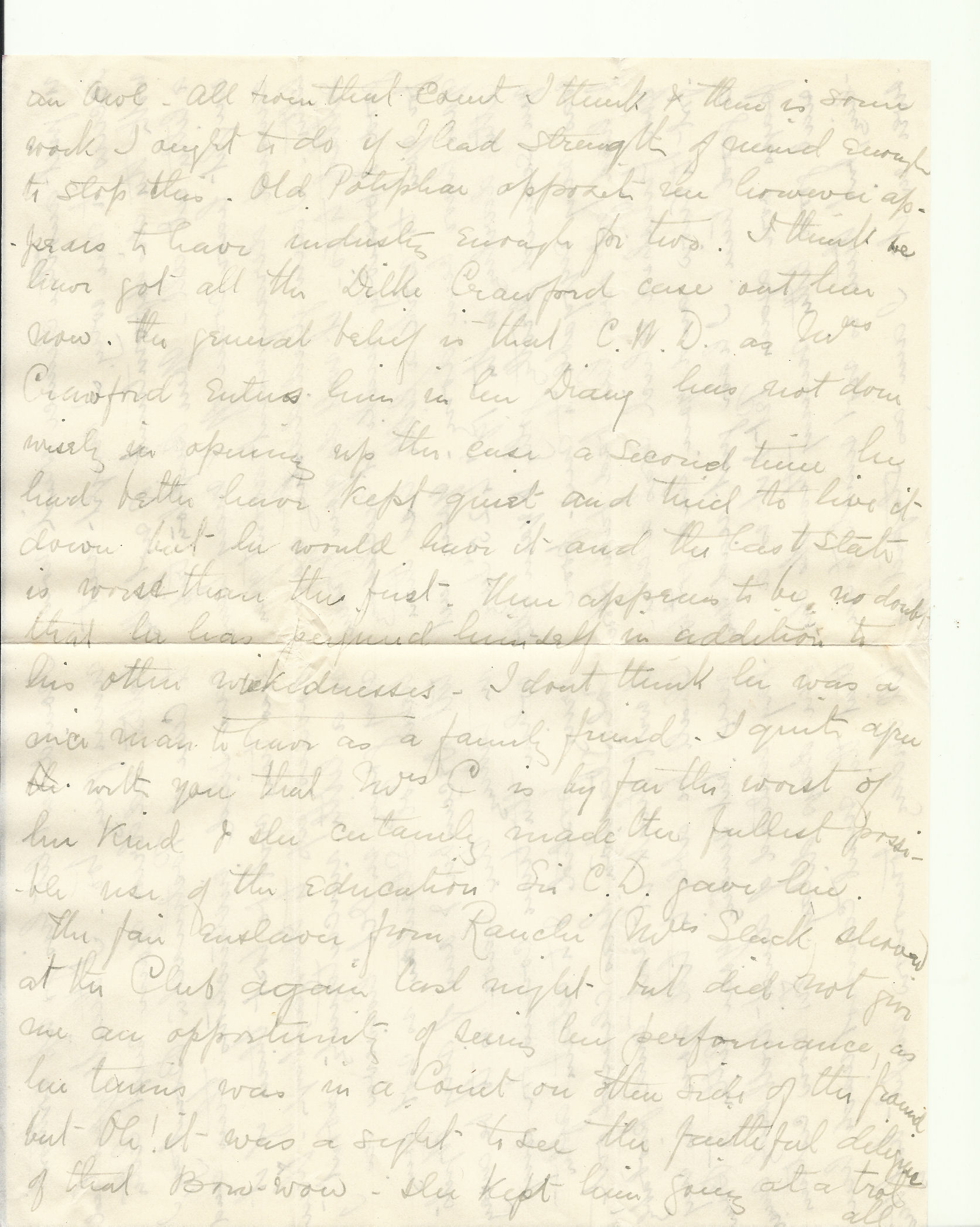 I am not going to write much at this sitting, only just enough to show that I am sane. There is not much to spare however. I hope to finish on board ship, on the way to Calcutta. Orders came for me at last, on Saturday evening, and since then I have been in a state of preparation, more or less. All my packing appears, however, yet to be done. Things that I have had in daily use, since I came to Rangoon, are all out and about. I intended doing it yesterday, but it took me all day long, to get my pay settled, & the cheques for it in the office, & I was able to do absolutely nothing besides, did not get back till after 5, to my tiffin at the Club. I find it's no use, darling, trying to write now. The bills, about me, are all wrong. One man has neglected to send his, and must now be looked up personally, in his shop. Besides there is my banking business, & remittance to you, darling, to be seen to, & I must off. I intended having my packing done most scientifically, with a view to the change of climate in India, but alas, the time seems very short, although it's all day till 3 tomorrow morning. I wish you were here, Pet. Good bye now till from board ship.