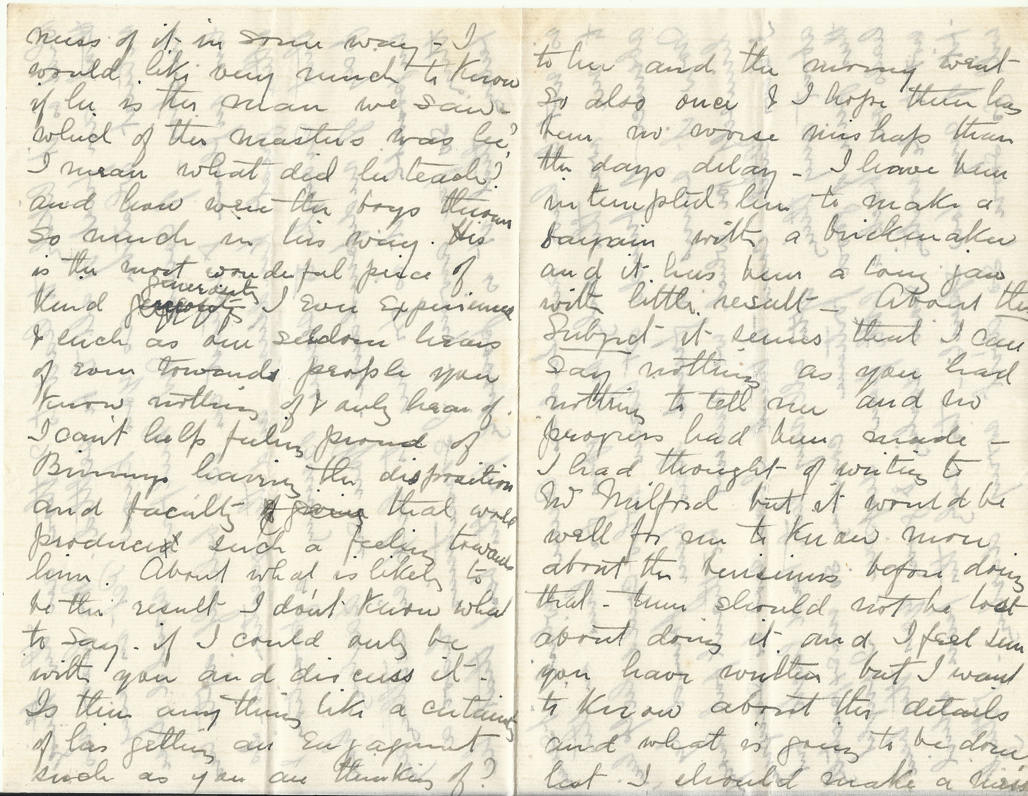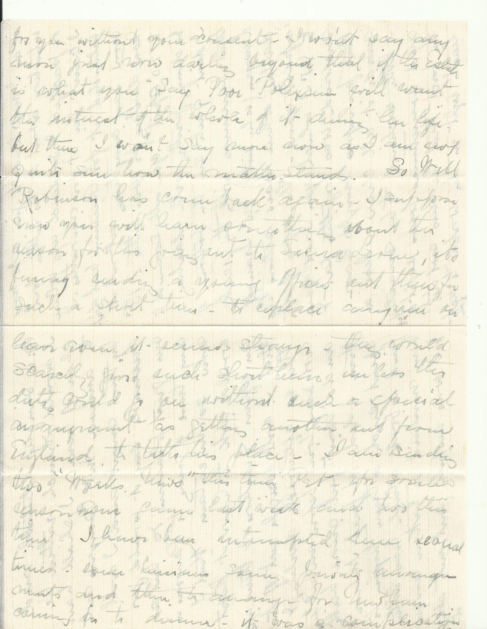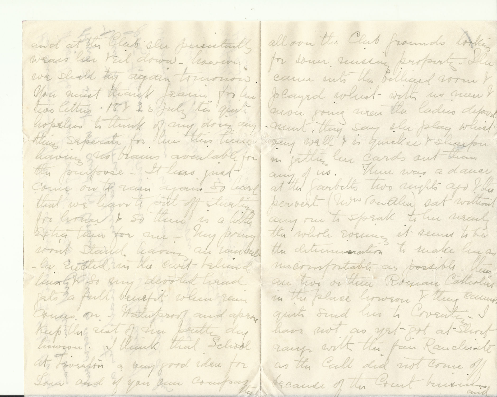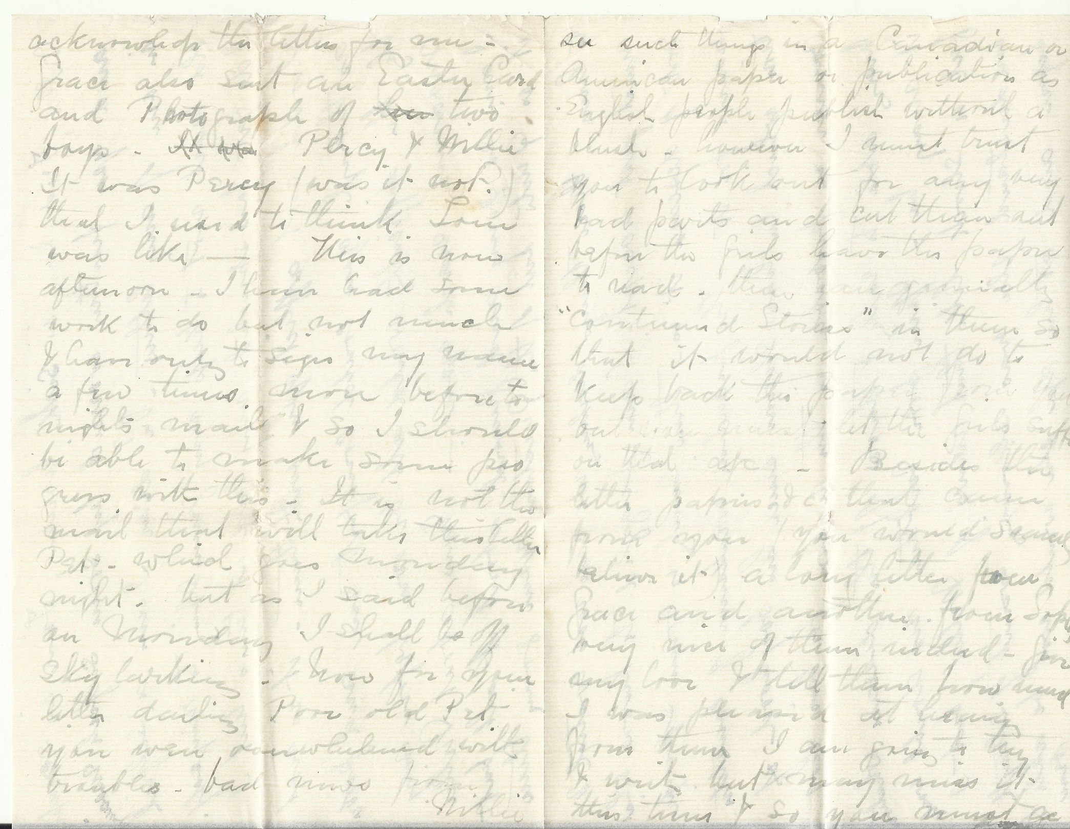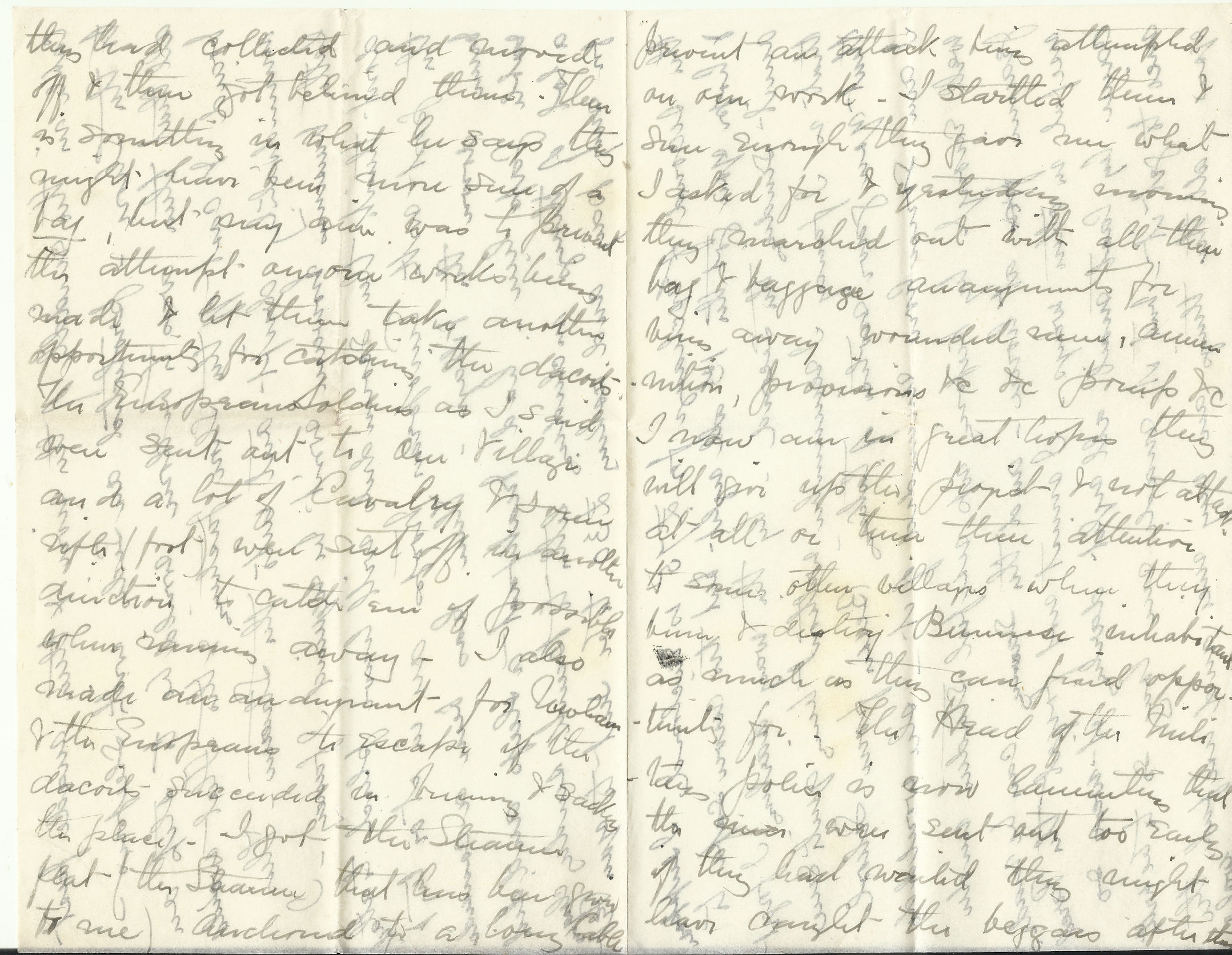I am not going to write much at this sitting, only just enough to show that I am sane. There is not much to spare however. I hope to finish on board ship, on the way to Calcutta. Orders came for me at last, on Saturday evening, and since then I have been in a state of preparation, more or less. All my packing appears, however, yet to be done. Things that I have had in daily use, since I came to Rangoon, are all out and about. I intended doing it yesterday, but it took me all day long, to get my pay settled, & the cheques for it in the office, & I was able to do absolutely nothing besides, did not get back till after 5, to my tiffin at the Club. I find it's no use, darling, trying to write now. The bills, about me, are all wrong. One man has neglected to send his, and must now be looked up personally, in his shop. Besides there is my banking business, & remittance to you, darling, to be seen to, & I must off. I intended having my packing done most scientifically, with a view to the change of climate in India, but alas, the time seems very short, although it's all day till 3 tomorrow morning. I wish you were here, Pet. Good bye now till from board ship.