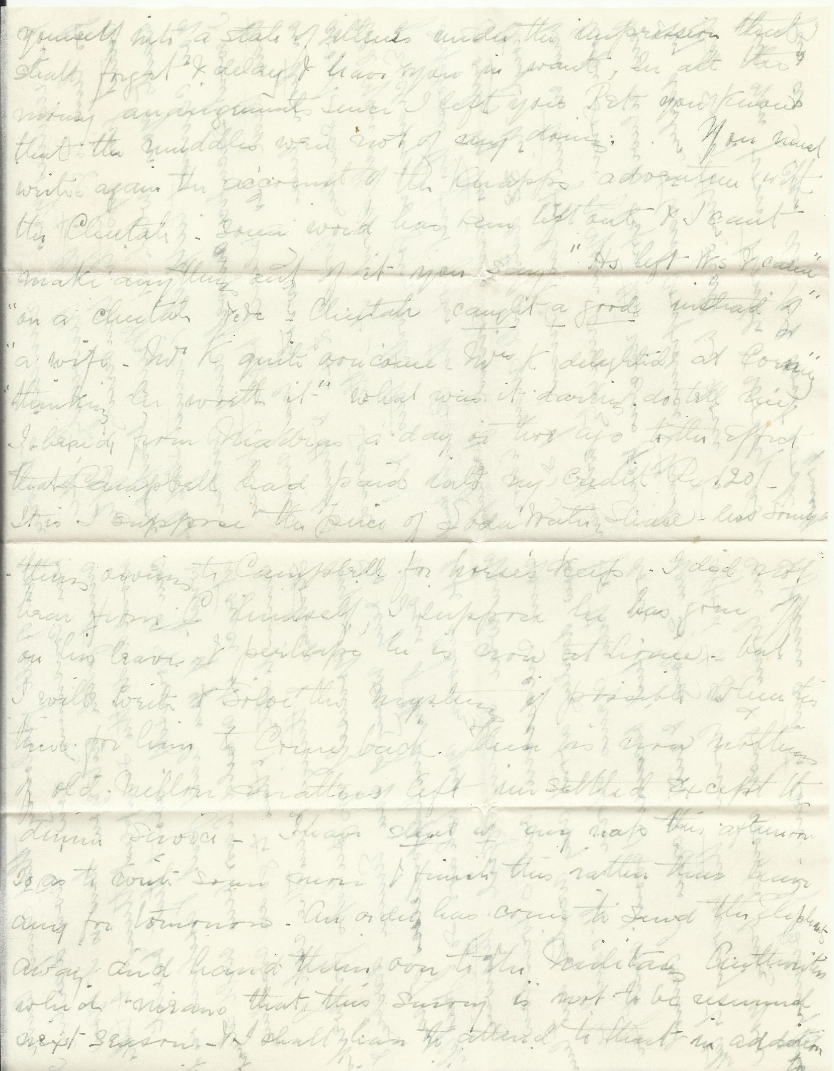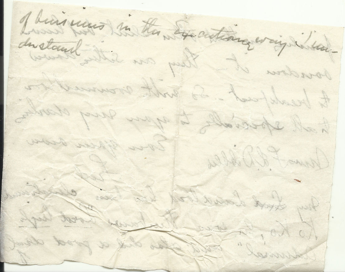 I was so tired, of kicking my heels at Rangoon, and feeling that no one cared anything about me. I should soon have given up writing altogether. You must tell Jeannie and the boys, not to think hard of my not writing to them direct. It was as much as I could do, to write your letters, Pet, and as I said, if I had remained longer in Rangoon, those would have almost have - have certainly dwindled. I shall try and do better after this, when the prospect and my surroundings brighter.