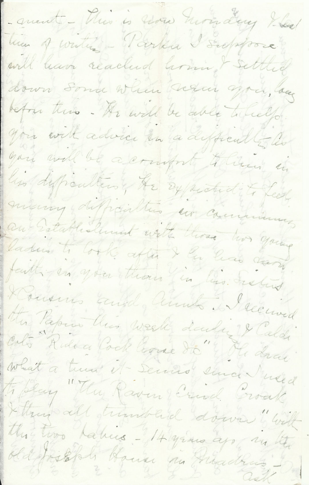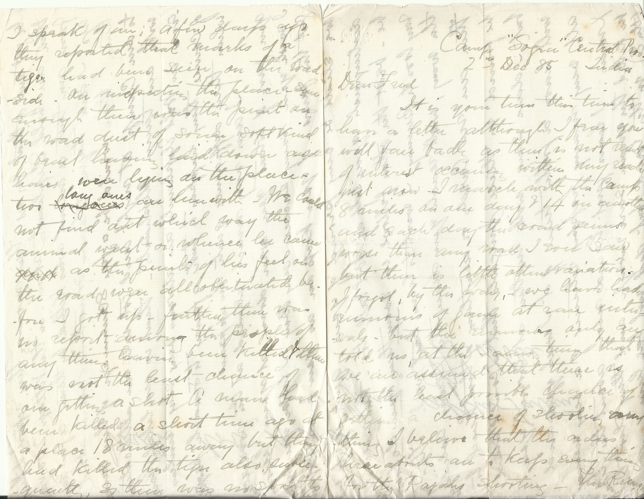 P.S. I had a letter from Parker this morning. He appears to be all right, but does not say much about himself, and nothing about his girls. I must try & write to him, before leaving this. I shall be within a day's journey of him, when I get to Delhi. He congratulates on Fred's success. Fred.