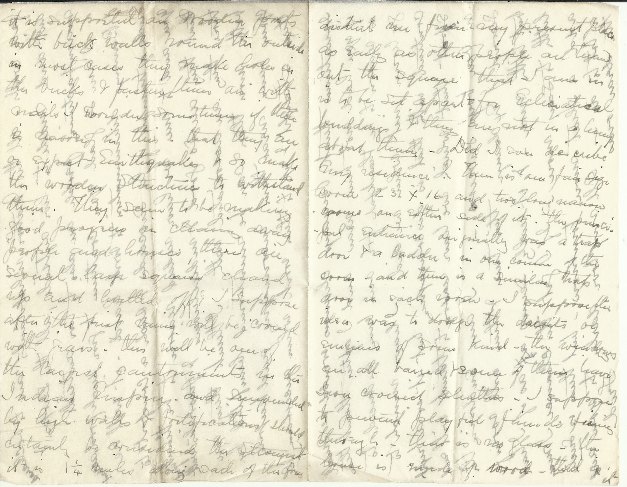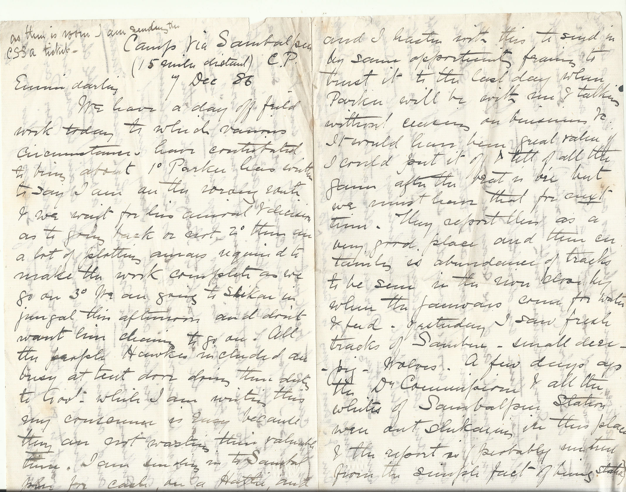 This is three days before mail time, but I must write, for fear I shall be too busy for it, tomorrow & next day. I have been pretty fully occupied, since the last mail went out, in making preparation. I told you, did I not?, that I was to send off equipment, tent, instruments, stationery, etc, for Bell, to Karachi, & for myself, to Delhi, and that is what I have been busy about, & yesterday, I think, all was arranged for, and Bell's share gone. My own share is to be at the Station tomorrow, when I go to book it.