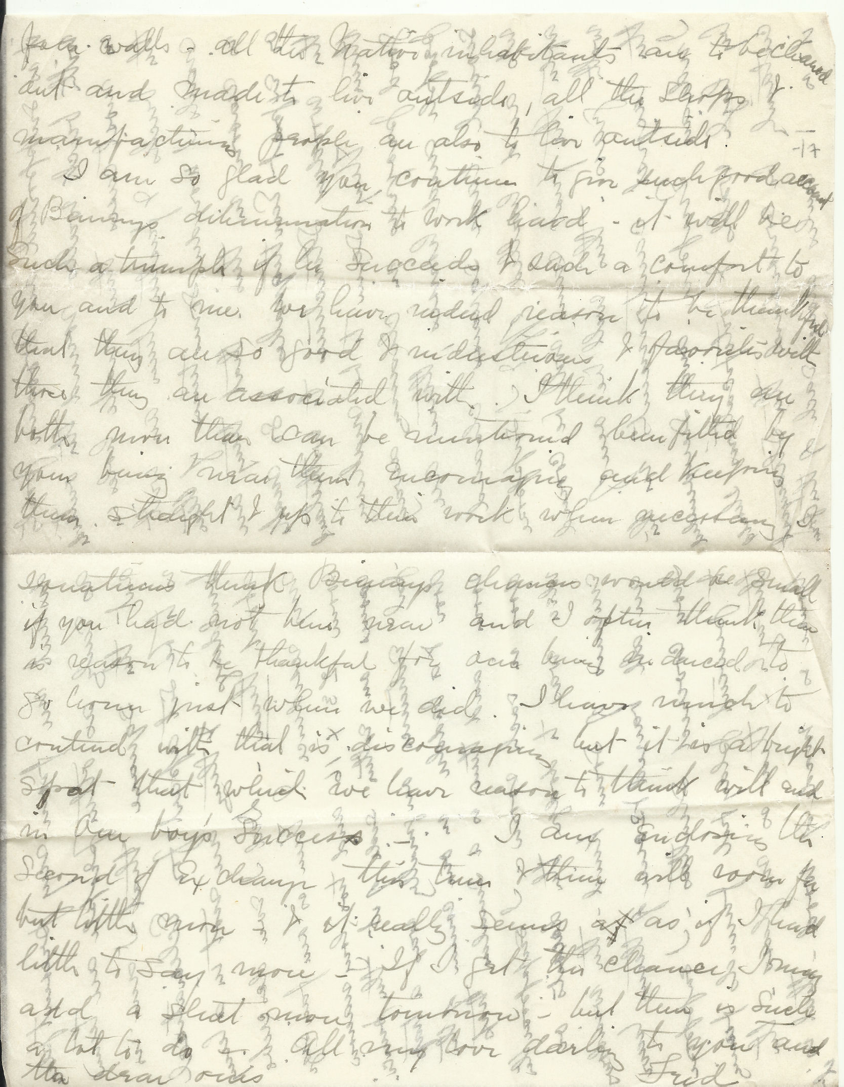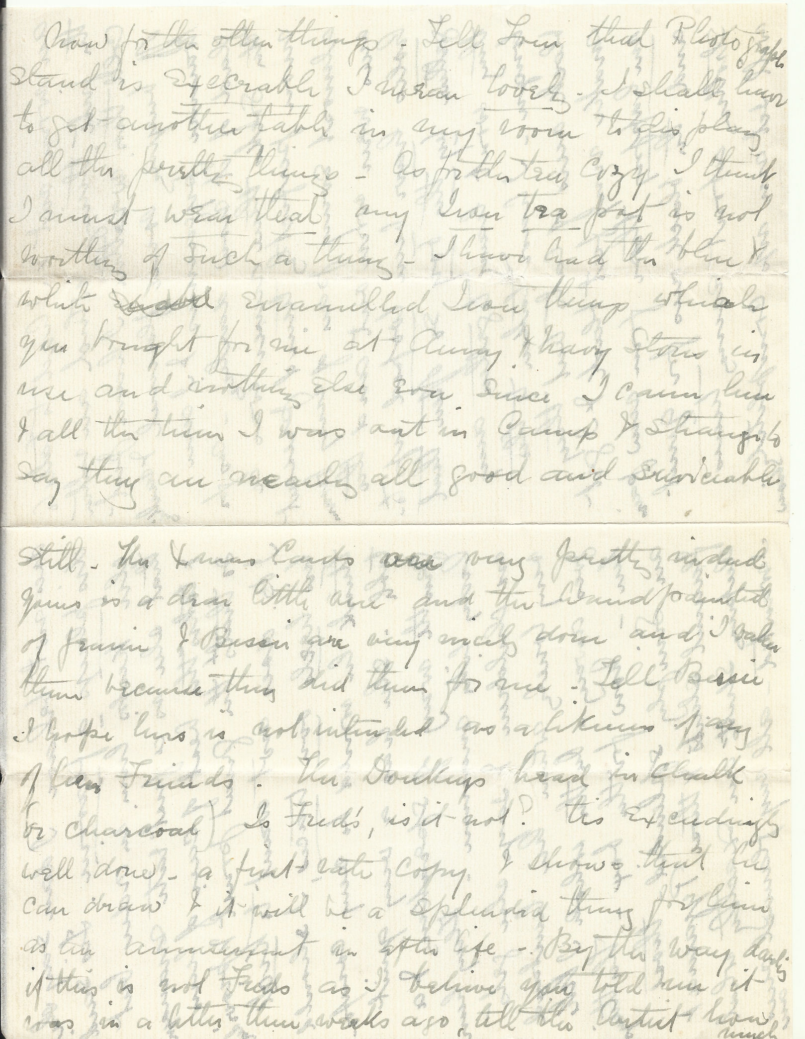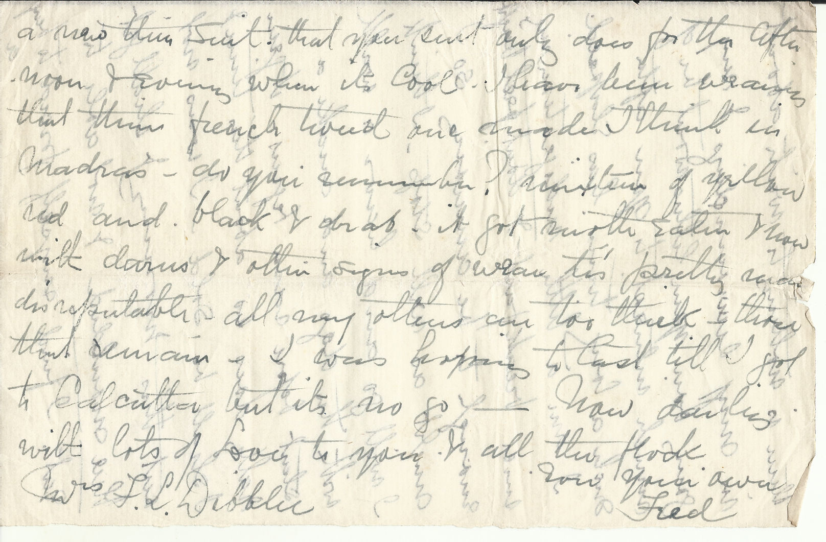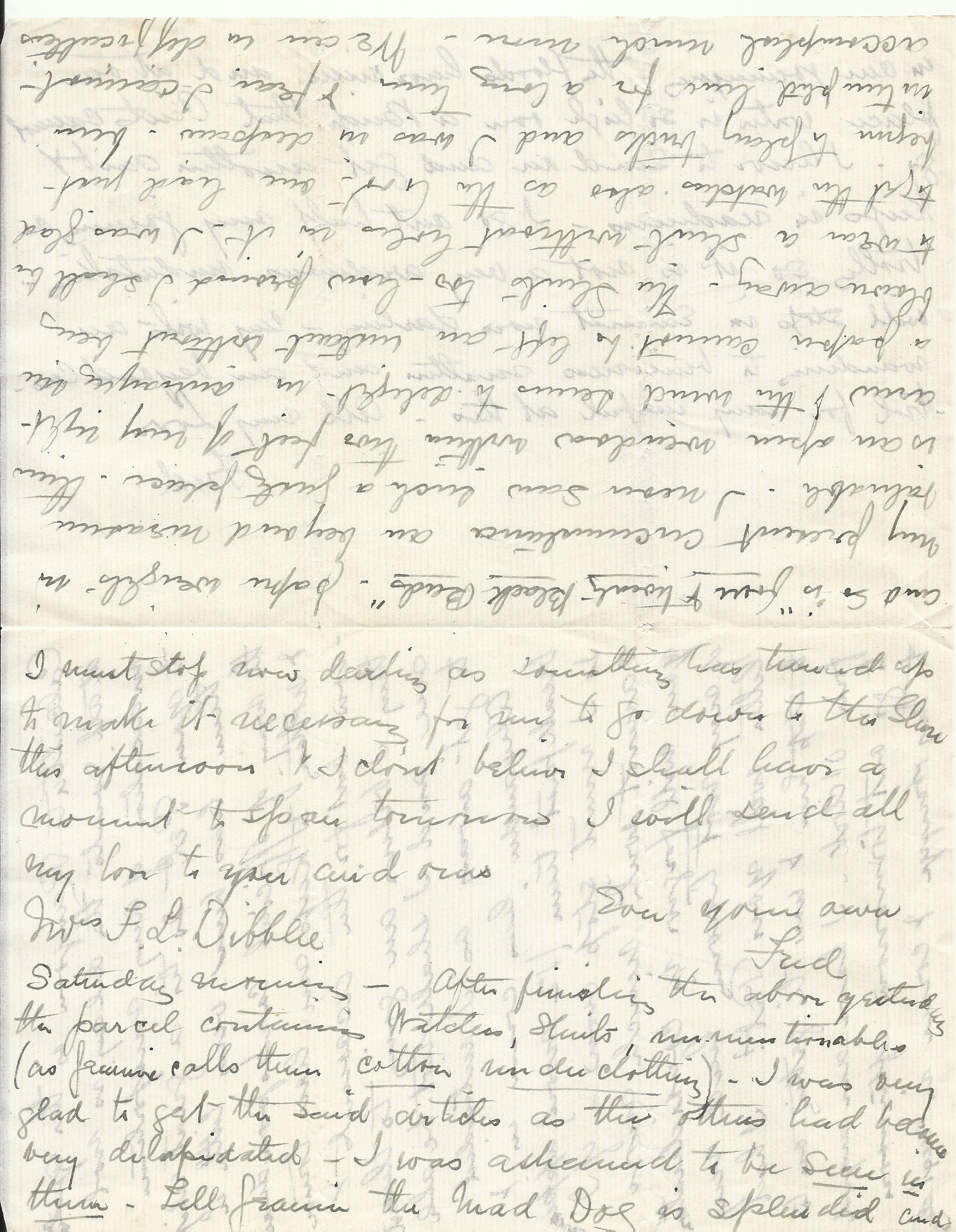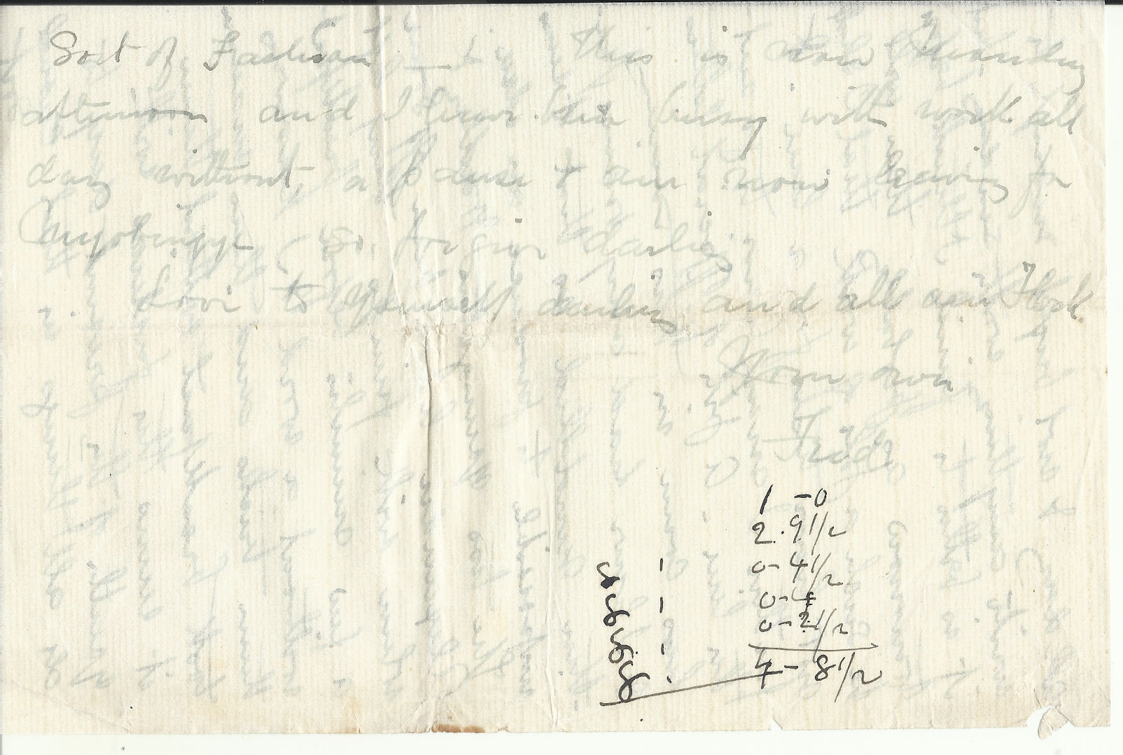 The sheets of the letters were folded in half. The first quarter and the second quarter are on one side (so the second quarter is to the left of the first quarter). On the other side, Fred turned the page, and wrote from top to bottom. The paper is very thin and the writing shows through. This technique is to make it easier to read, since the writing on one side (showing through) is at right angles to the writing on the other. Usually there is more than one sheet to a letter. These letters are not easy to read. Also, some of the sheets of the letters were muddled up and some sheets are missing. It also seems likely that whole letters are missing, since Fred wrote every week. The transcripts below are my best efforts at sorting the letters into order, and reading them. I have scanned the letters as well. Click on the links above the letters to get the scans, in case you want to check what I've said, or offer better suggestions!