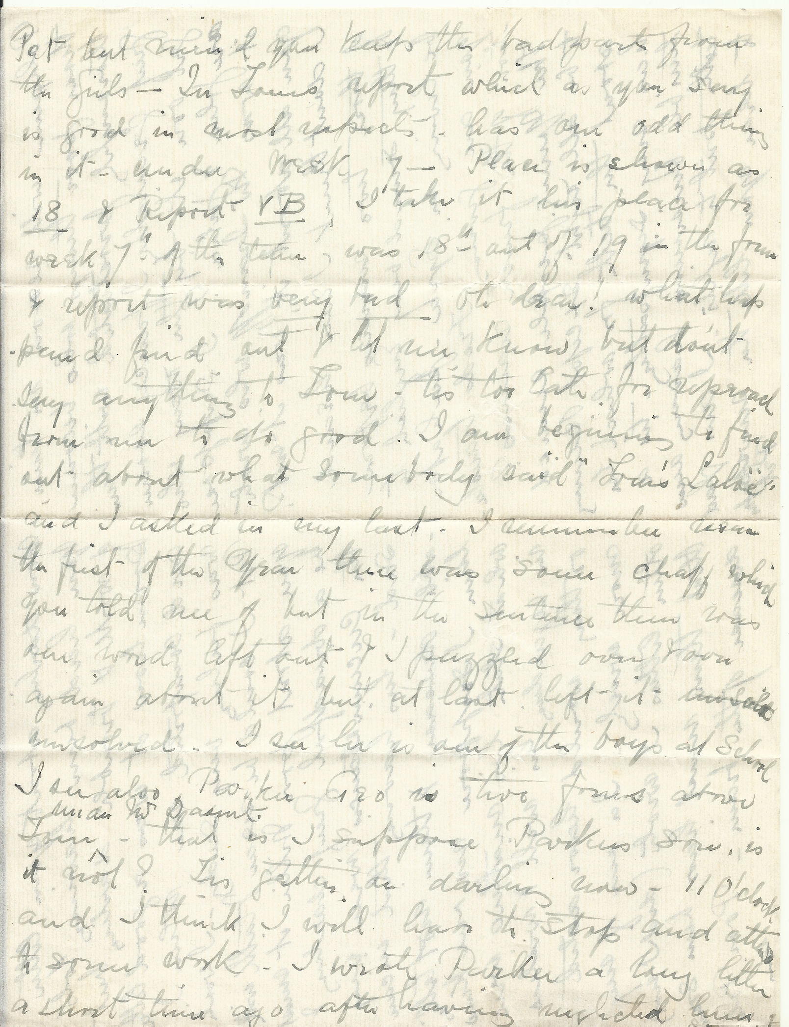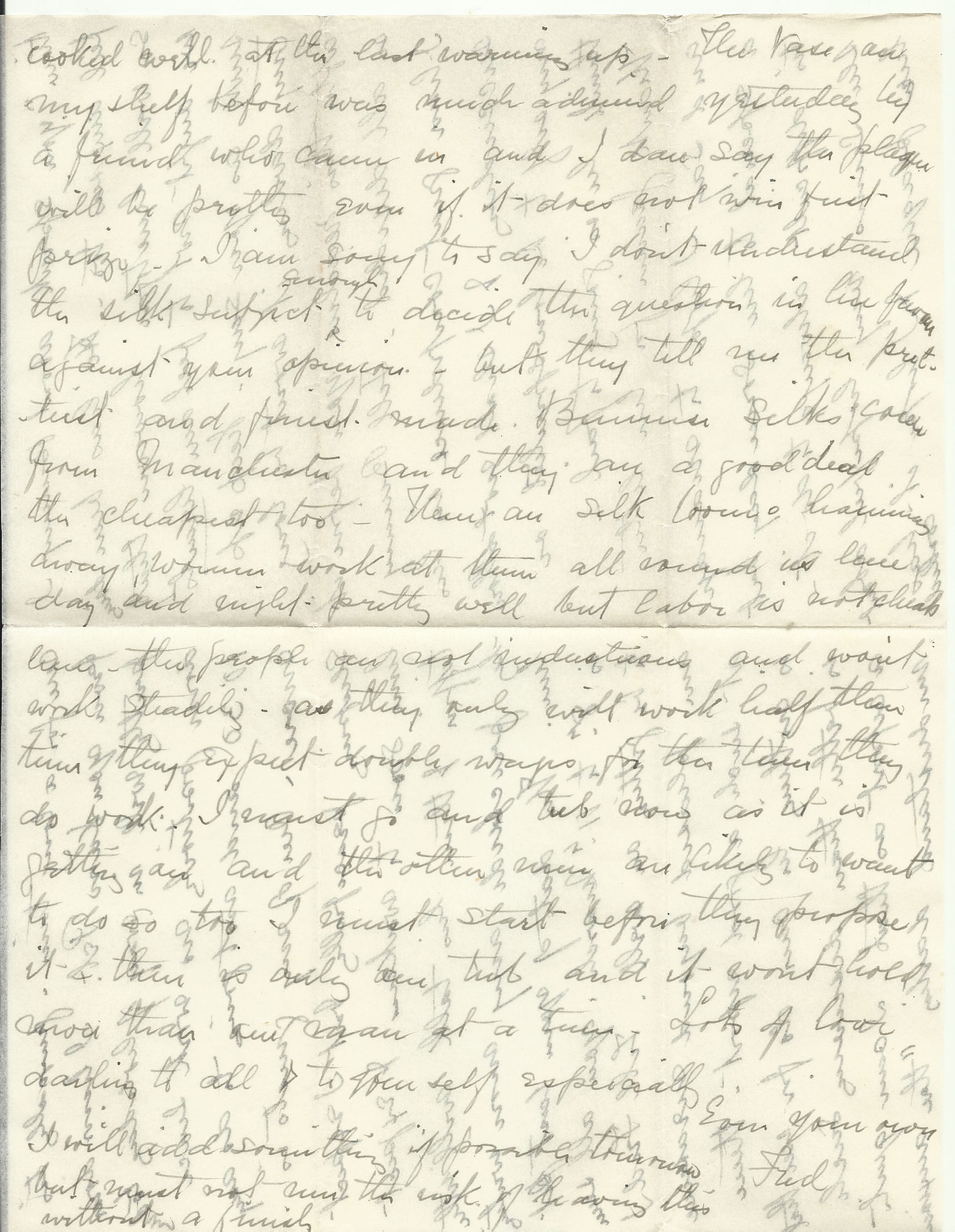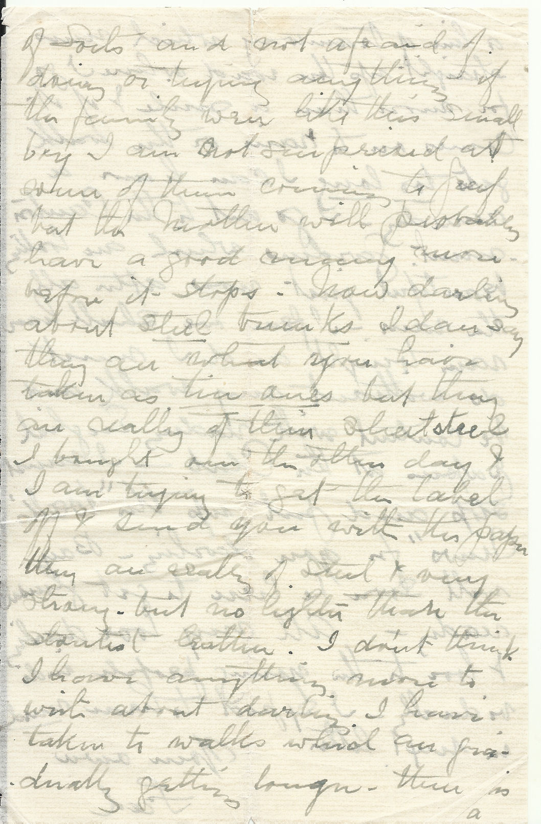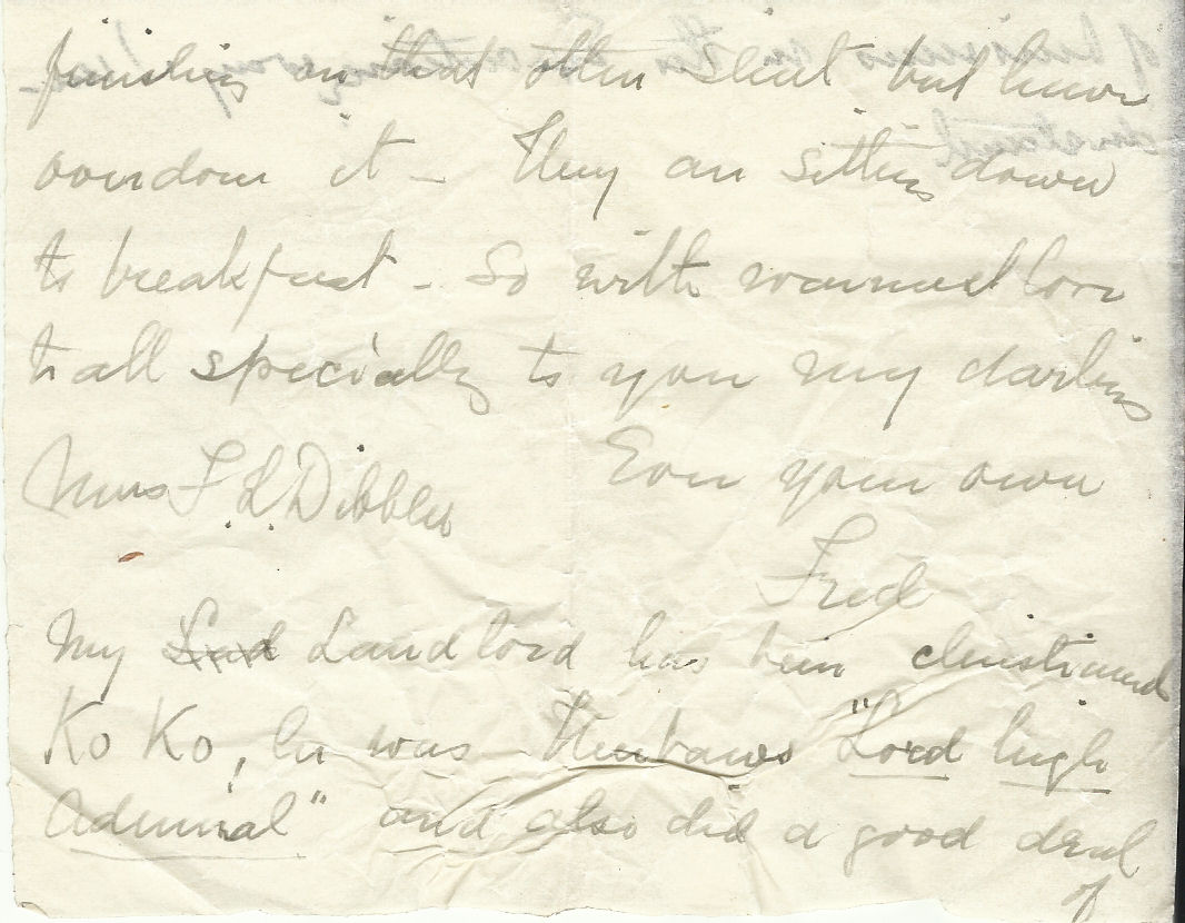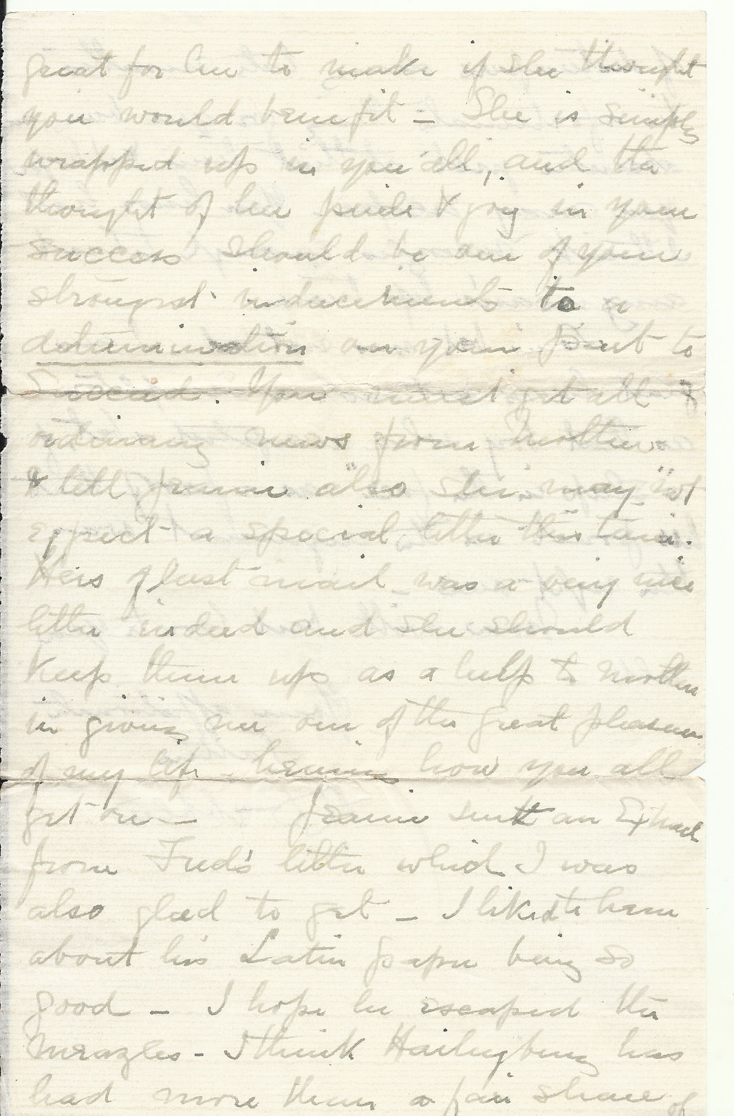 The sheets of the letters were folded in half. The first quarter and the second quarter are on one side (so the second quarter is to the left of the first quarter). On the other side, Fred turned the page, and wrote from top to bottom. The paper is very thin and the writing shows through. This technique is to make it easier to read, since the writing on one side (showing through) is at right angles to the writing on the other. Usually there is more than one sheet to a letter. These letters are not easy to read. Also, some of the sheets of the letters were muddled up and some sheets are missing. It also seems likely that whole letters are missing, since Fred wrote every week. The transcripts below are my best efforts at sorting the letters into order, and reading them. I have scanned the letters as well. Click on the links above the letters to get the scans, in case you want to check what I've said, or offer better suggestions!