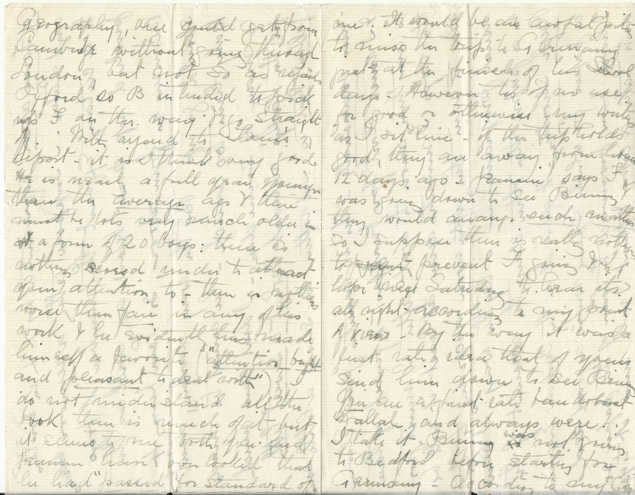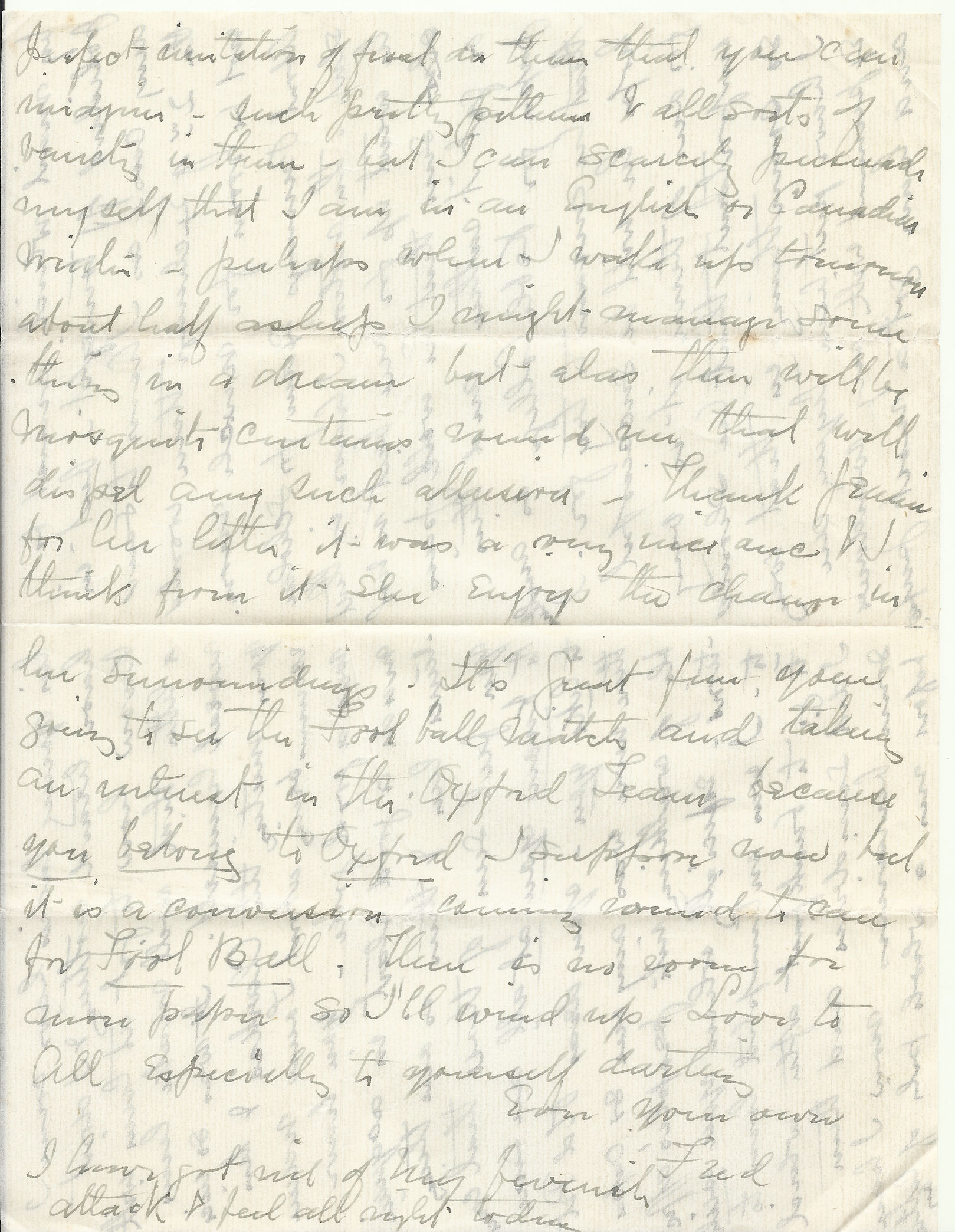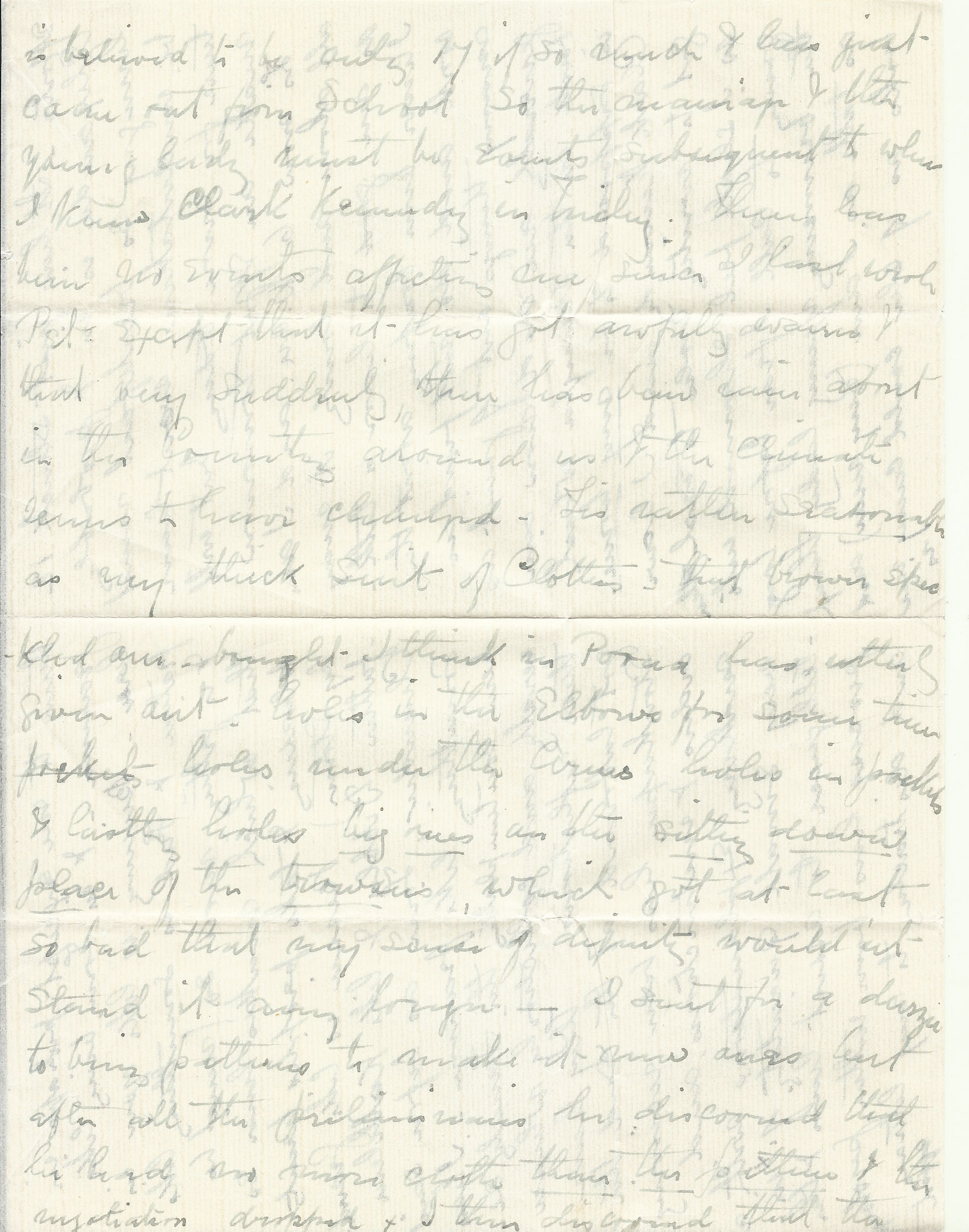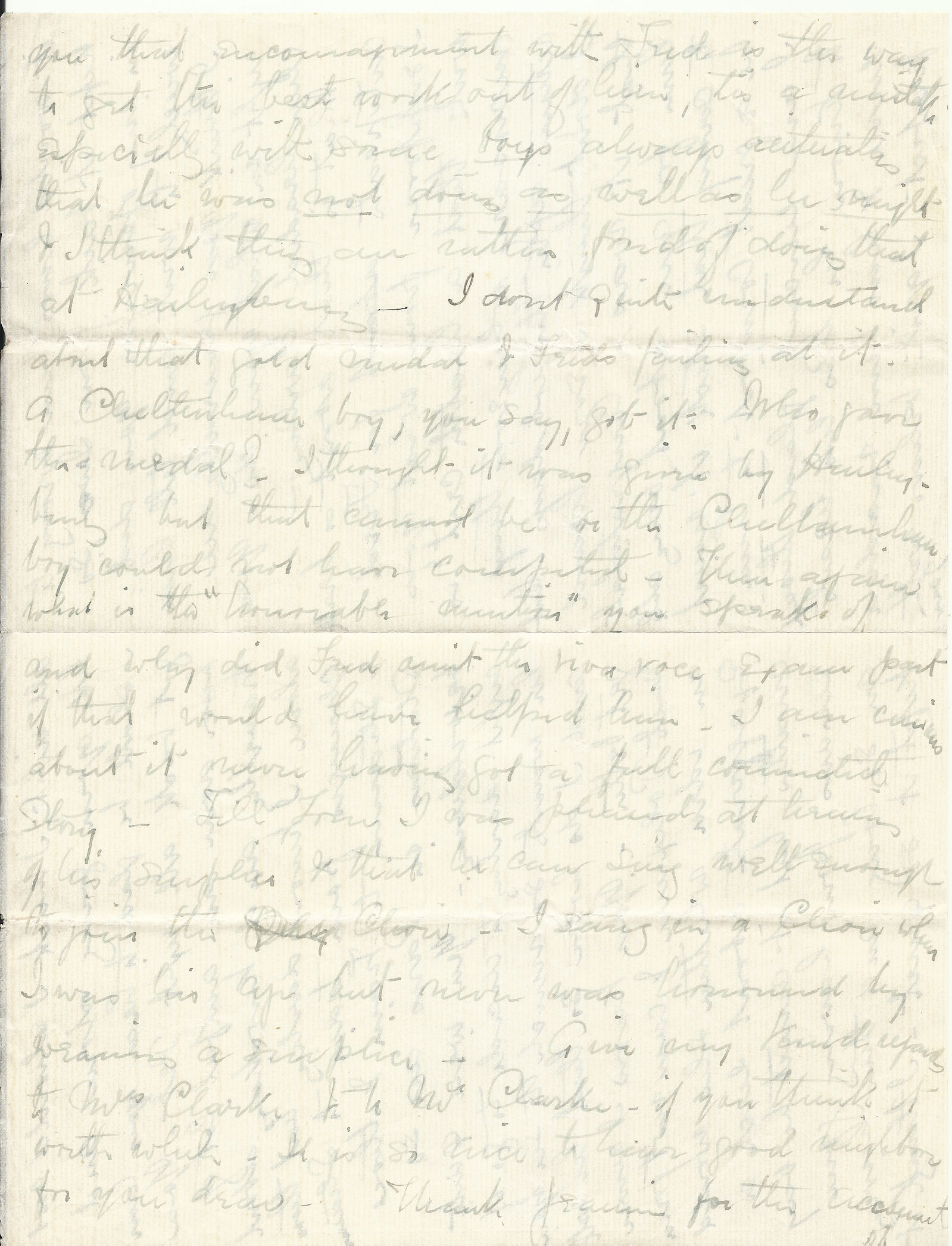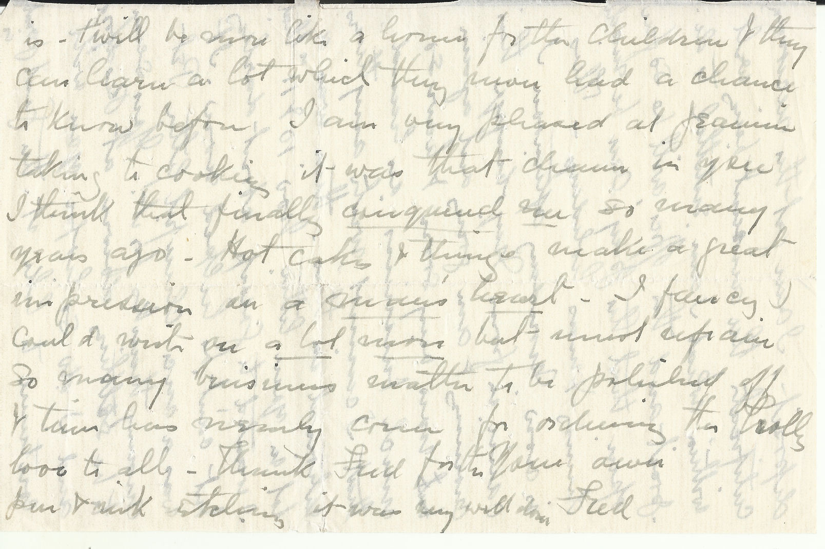 The sheets of the letters were folded in half. The first quarter and the second quarter are on one side (so the second quarter is to the left of the first quarter). On the other side, Fred turned the page, and wrote from top to bottom. The paper is very thin and the writing shows through. This technique is to make it easier to read, since the writing on one side (showing through) is at right angles to the writing on the other. Usually there is more than one sheet to a letter. These letters are not easy to read. Also, some of the sheets of the letters were muddled up and some sheets are missing. It also seems likely that whole letters are missing, since Fred wrote every week. The transcripts below are my best efforts at sorting the letters into order, and reading them. I have scanned the letters as well. Click on the links above the letters to get the scans, in case you want to check what I've said, or offer better suggestions!