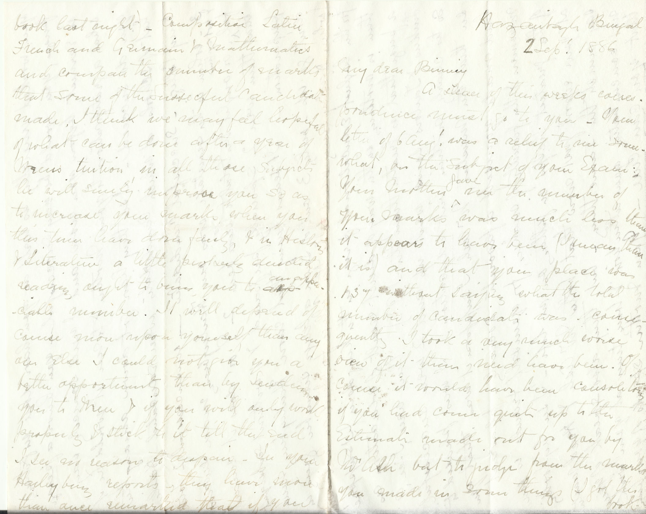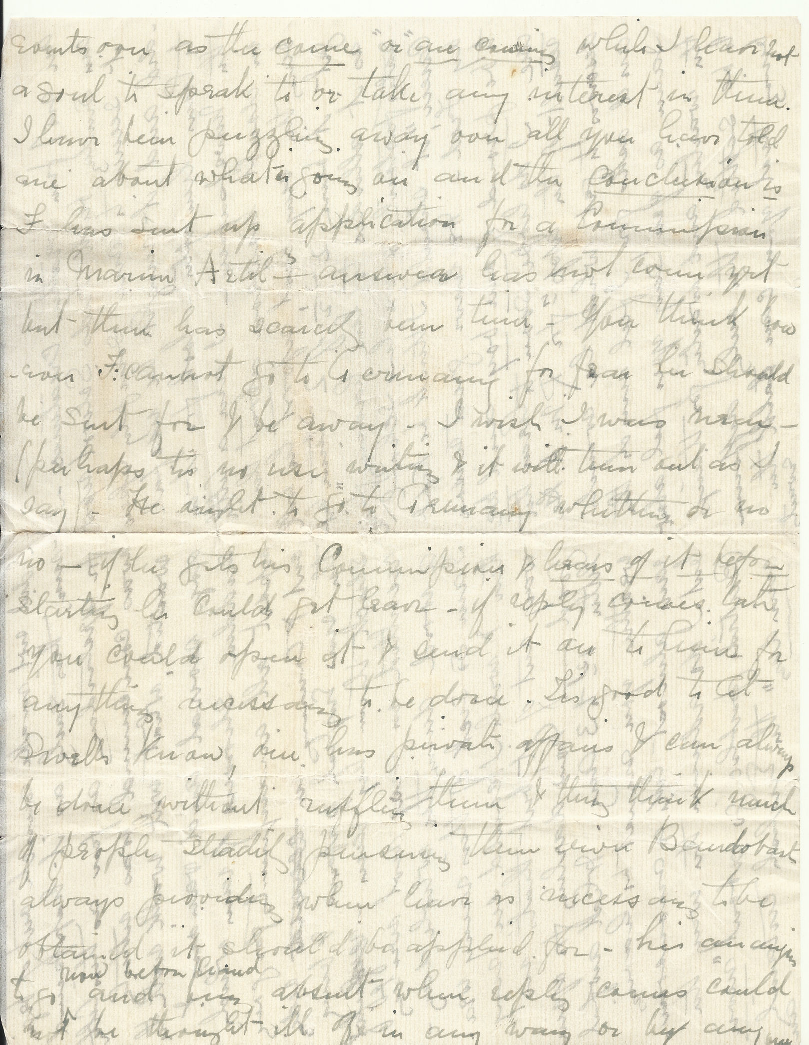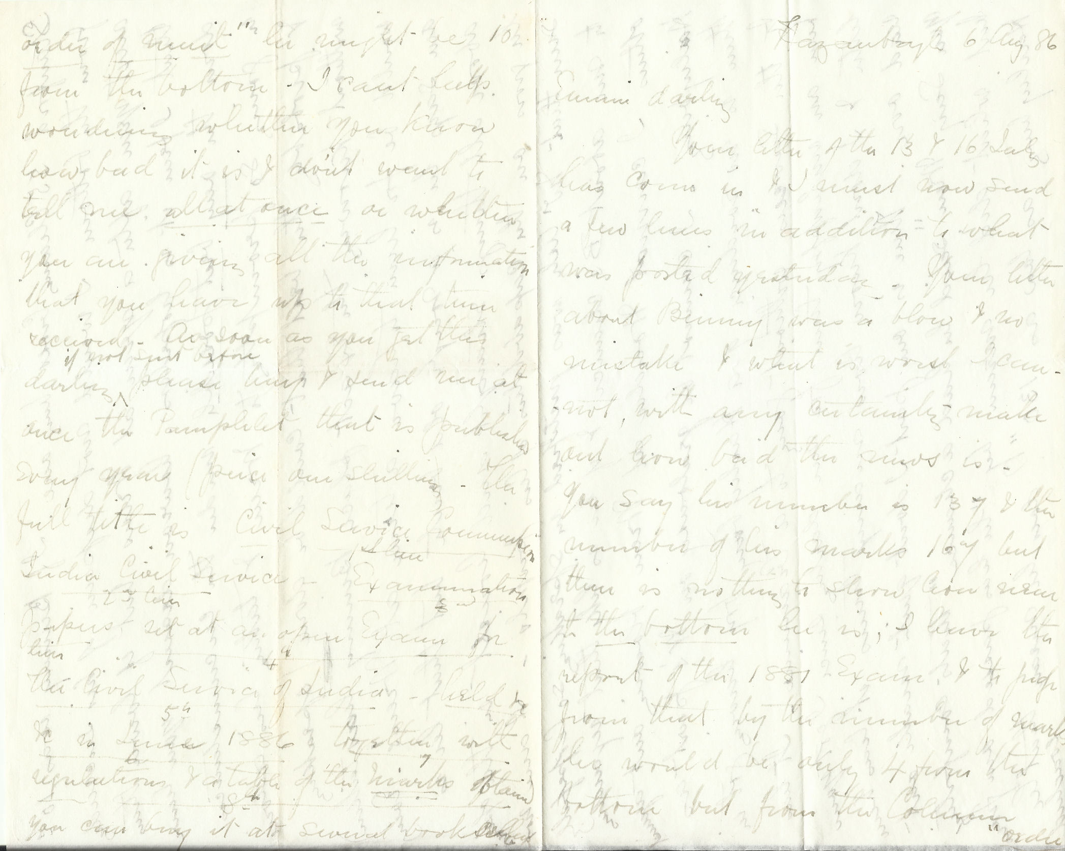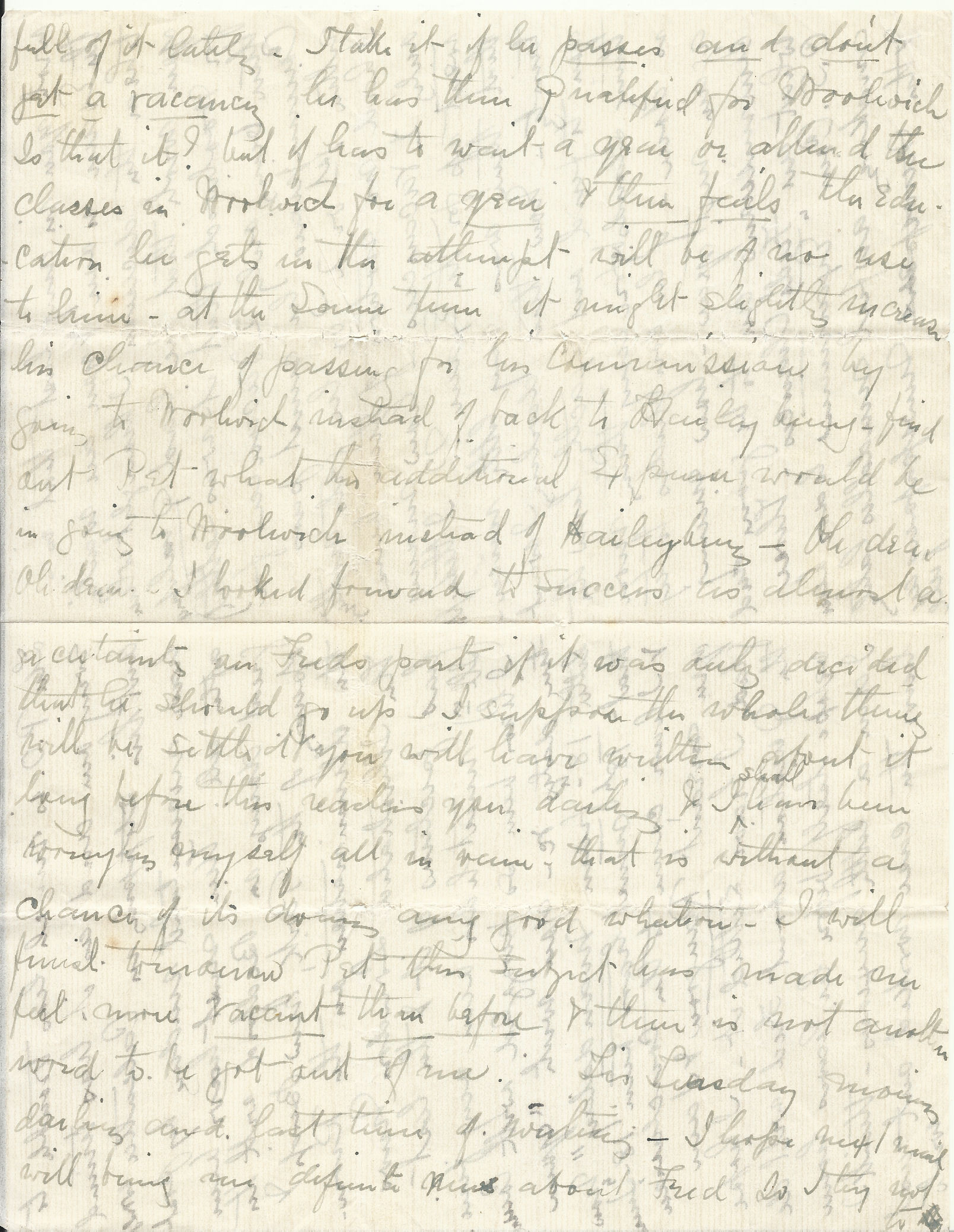 I see by your news, then, Binney has gone, & Fred has stopped behind, awaiting the action of the Admiralty, so I suppose he has decided to take the R.M.A. if he can get it, and the chances seem good. Thus, I suppose, tis given up, the idea of his staying on at Woolwich, in the hope of the better service of the R.E. Tis best, darling, under the circumstances. I really could not afford any more expenditure, on his education, and if the direct Commission is attainable, it should, I think, be accepted. There was just the chance, of my getting back again to my former position, where I should have had an extra Rs1000 a year pension, & in that case, the effort, to get the improved position for Fred, should have been made. Tis extremely hard, that his prospects in life should suffer, when he has shown himself capable of some thing better, but the fact of my poverty is insuperable.