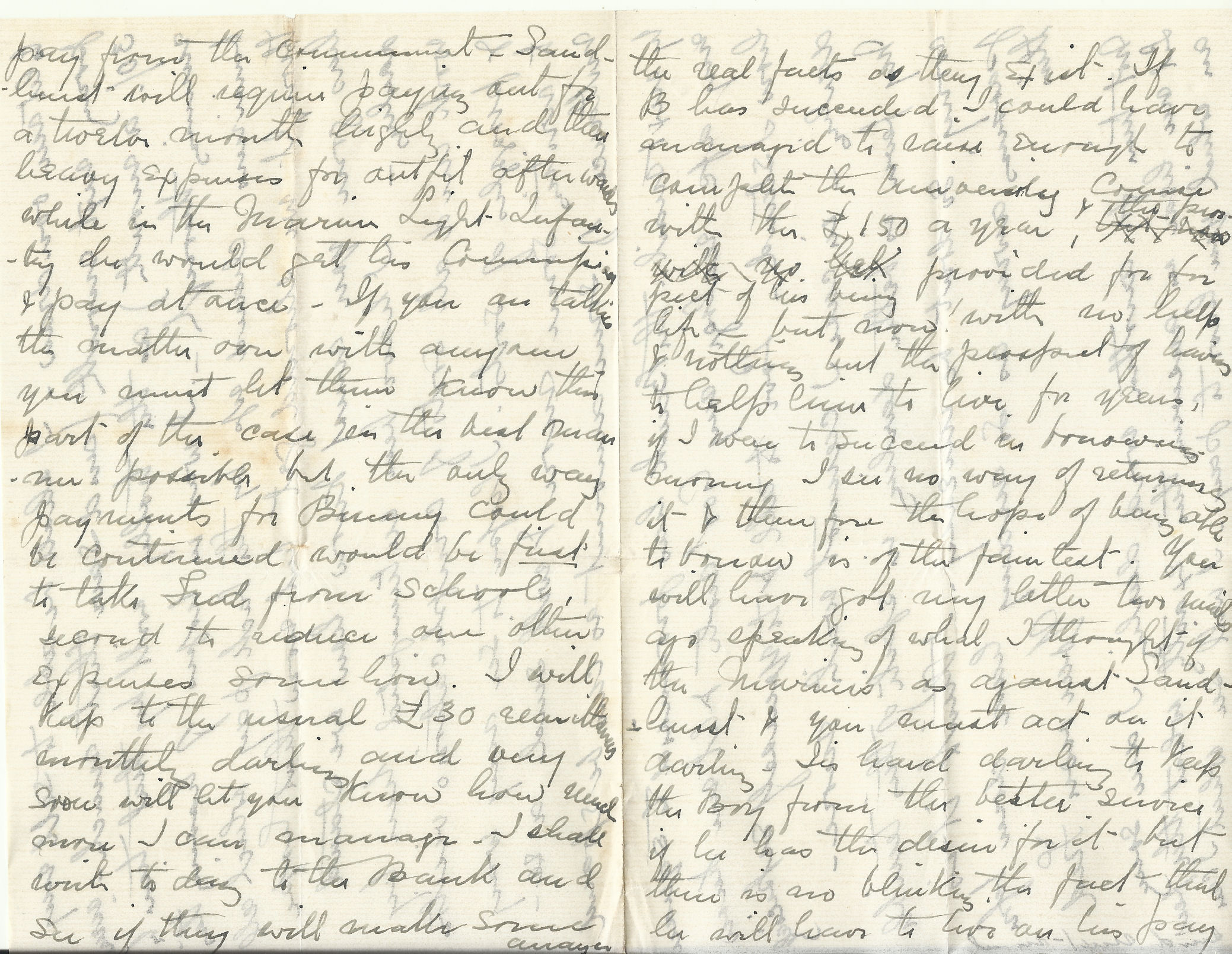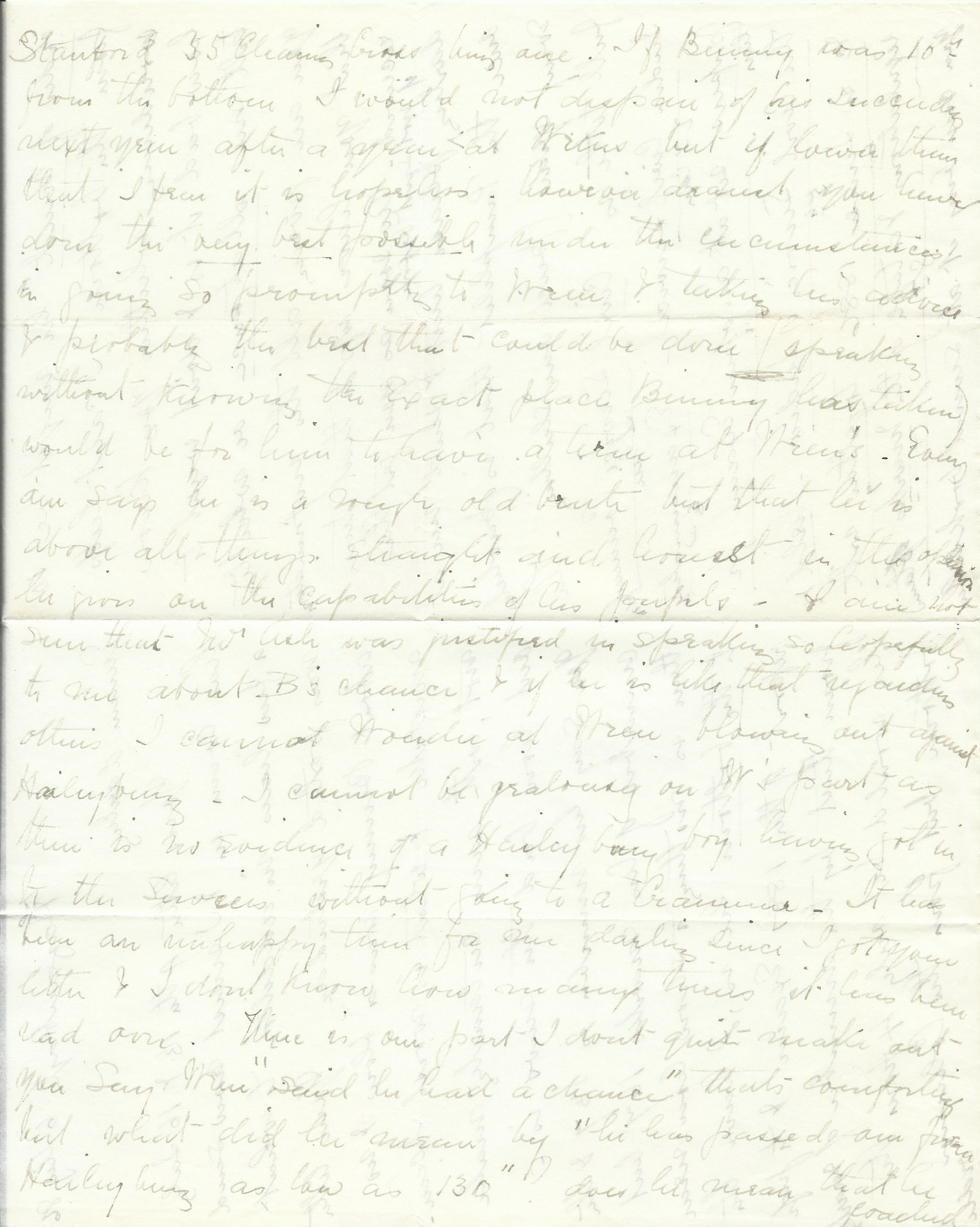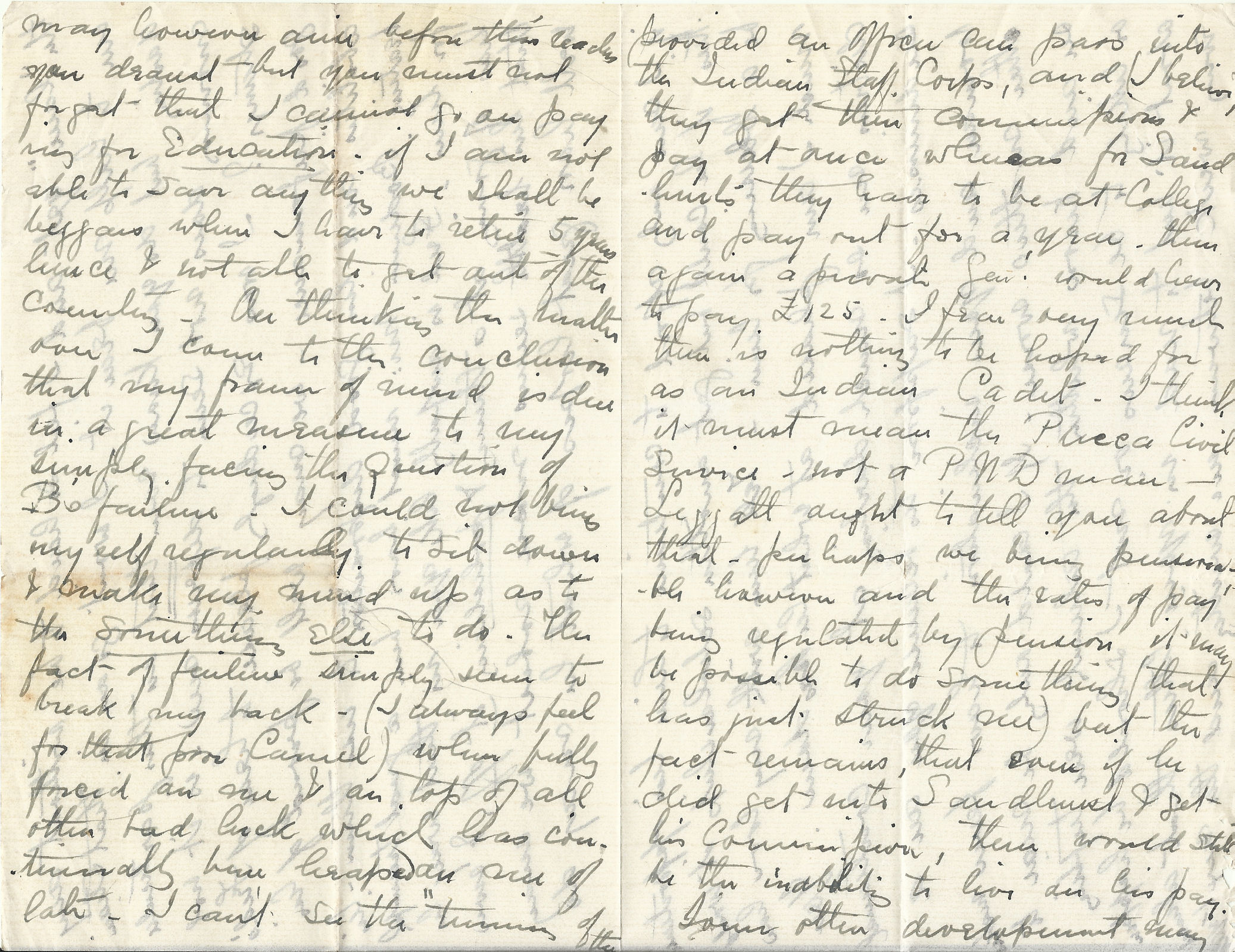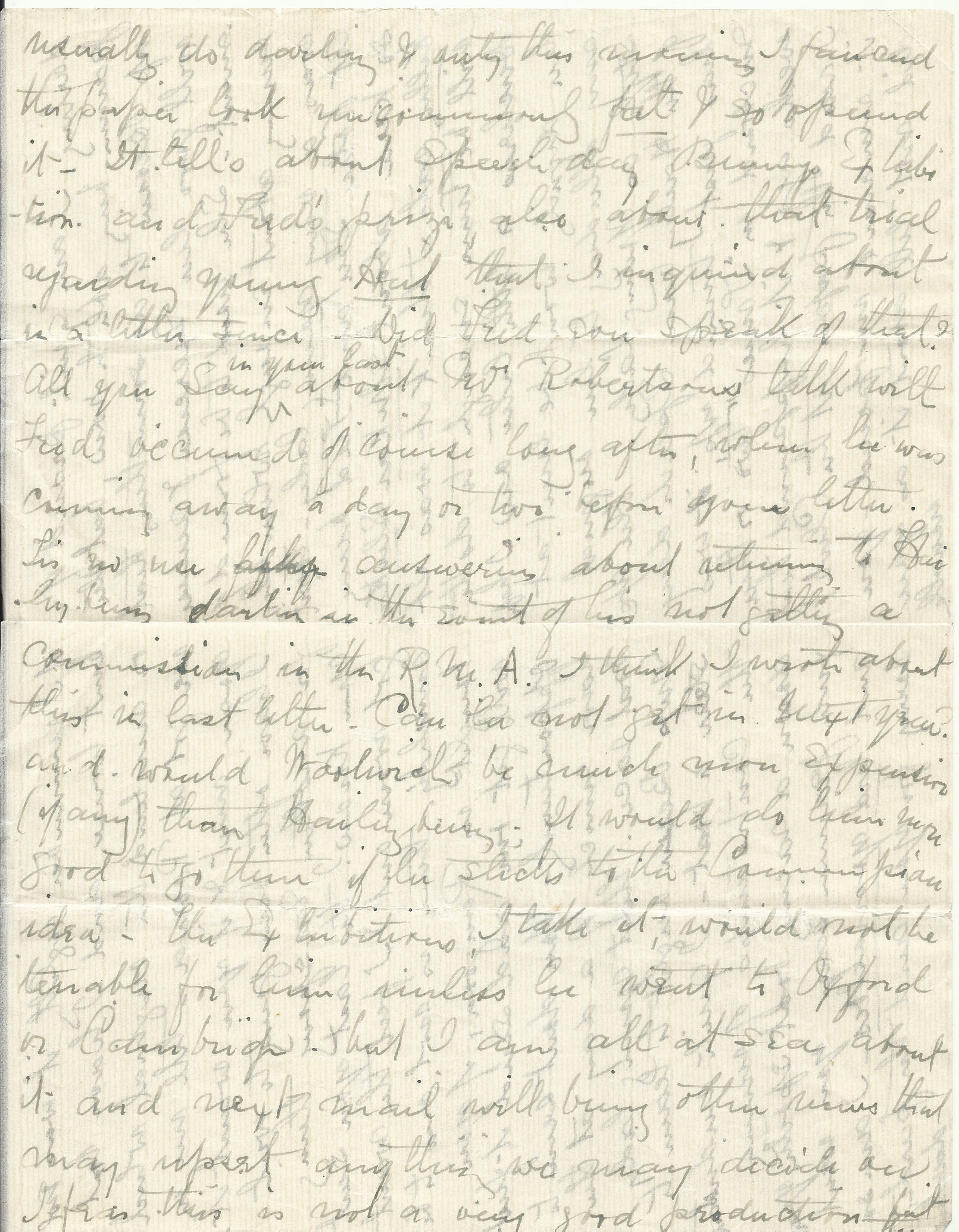 I see by your news, then, Binney has gone, & Fred has stopped behind, awaiting the action of the Admiralty, so I suppose he has decided to take the R.M.A. if he can get it, and the chances seem good. Thus, I suppose, tis given up, the idea of his staying on at Woolwich, in the hope of the better service of the R.E. Tis best, darling, under the circumstances. I really could not afford any more expenditure, on his education, and if the direct Commission is attainable, it should, I think, be accepted. There was just the chance, of my getting back again to my former position, where I should have had an extra Rs1000 a year pension, & in that case, the effort, to get the improved position for Fred, should have been made. Tis extremely hard, that his prospects in life should suffer, when he has shown himself capable of some thing better, but the fact of my poverty is insuperable.