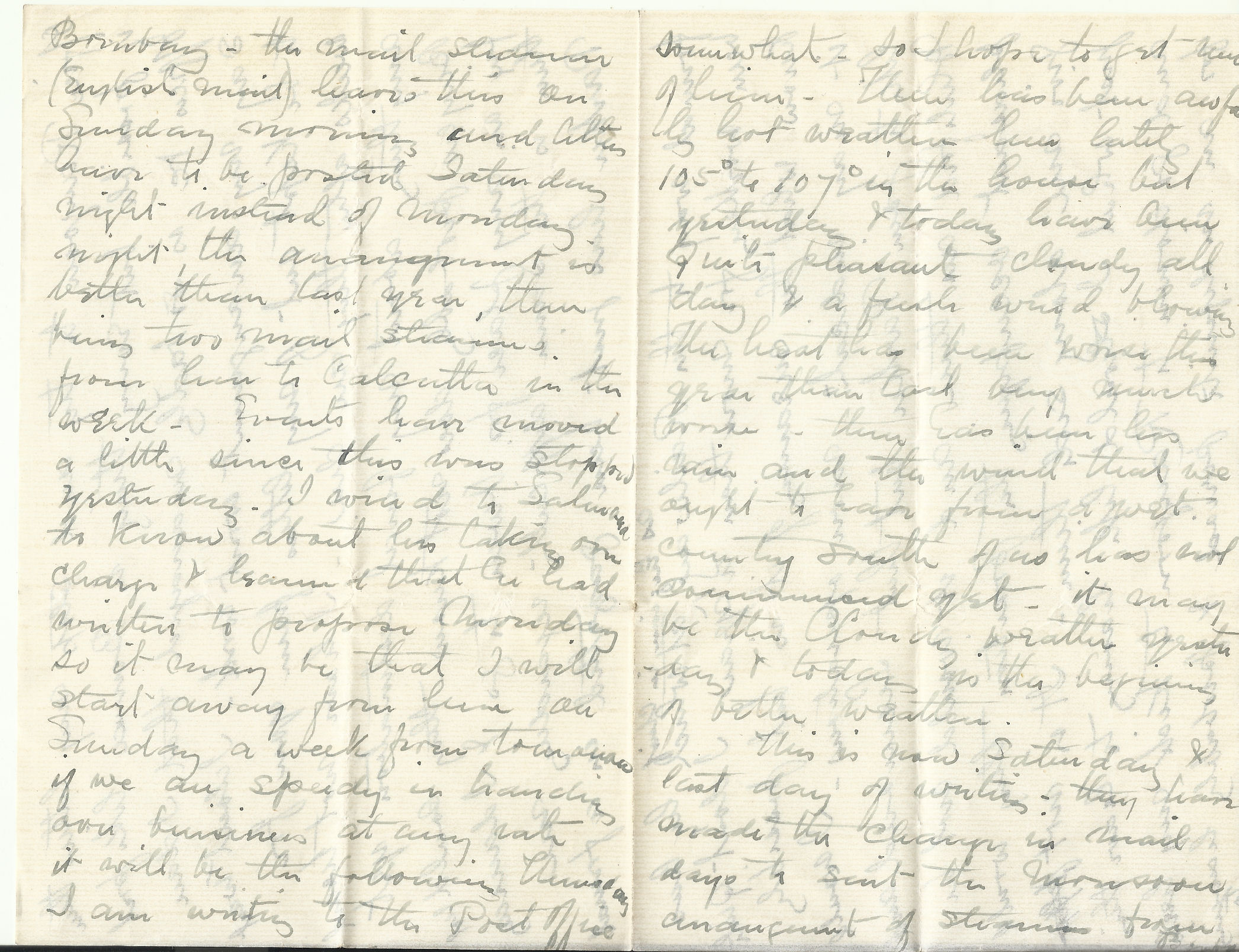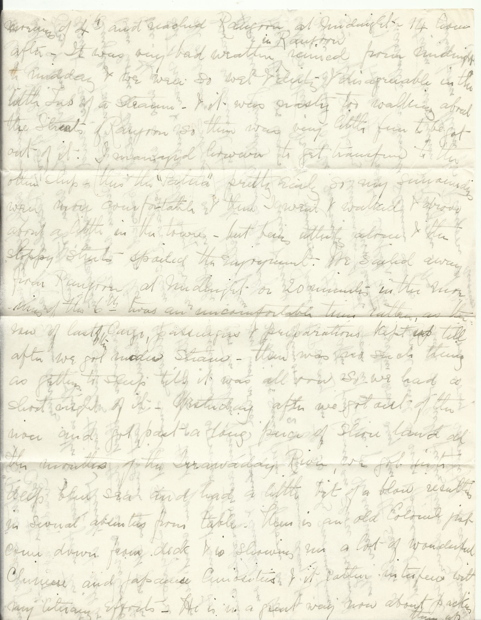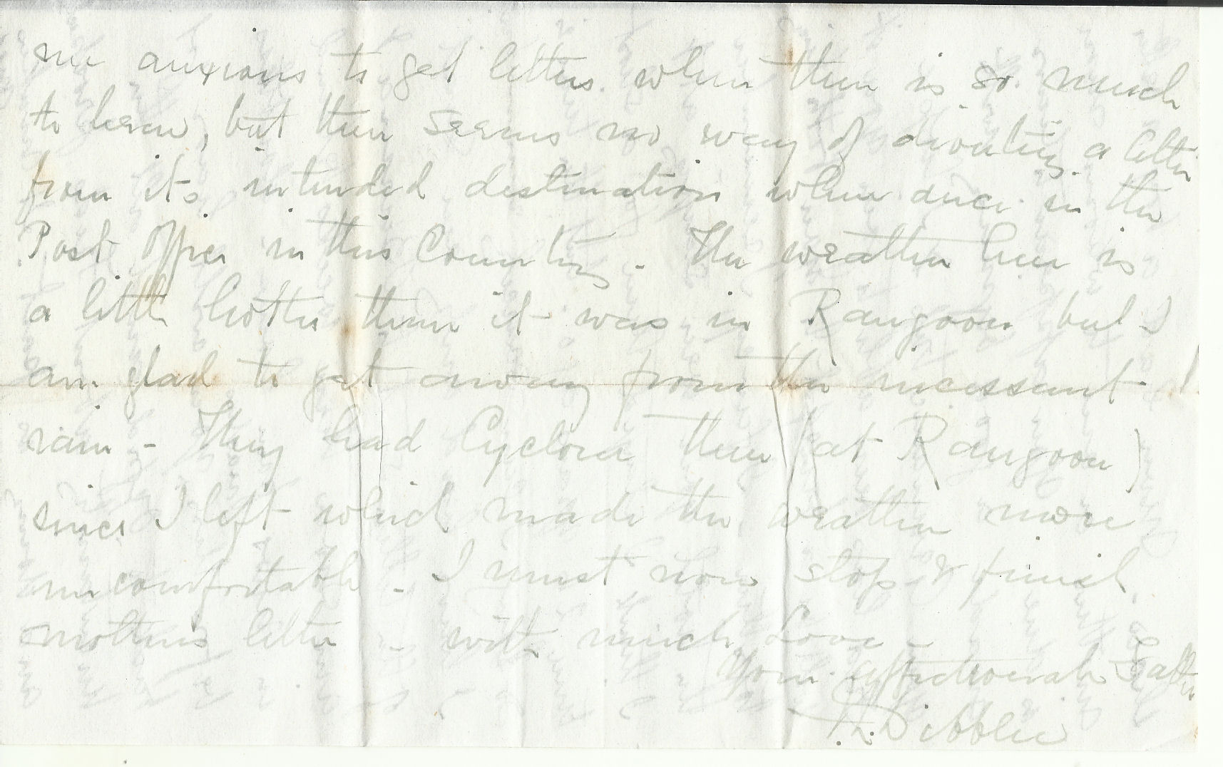 The weather here is a little hotter, than it was in Rangoon, but I am glad to get away from the incessant rain. They had Cyclone there at Rangoon, since I left, which made the weather more uncomfortable. I must now stop, & finish Mother's letter.