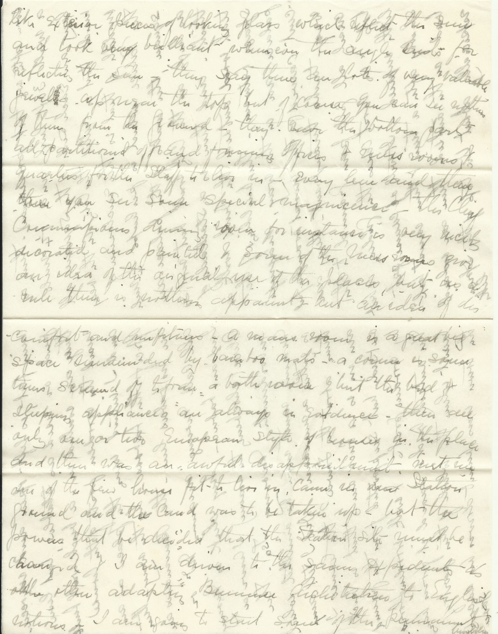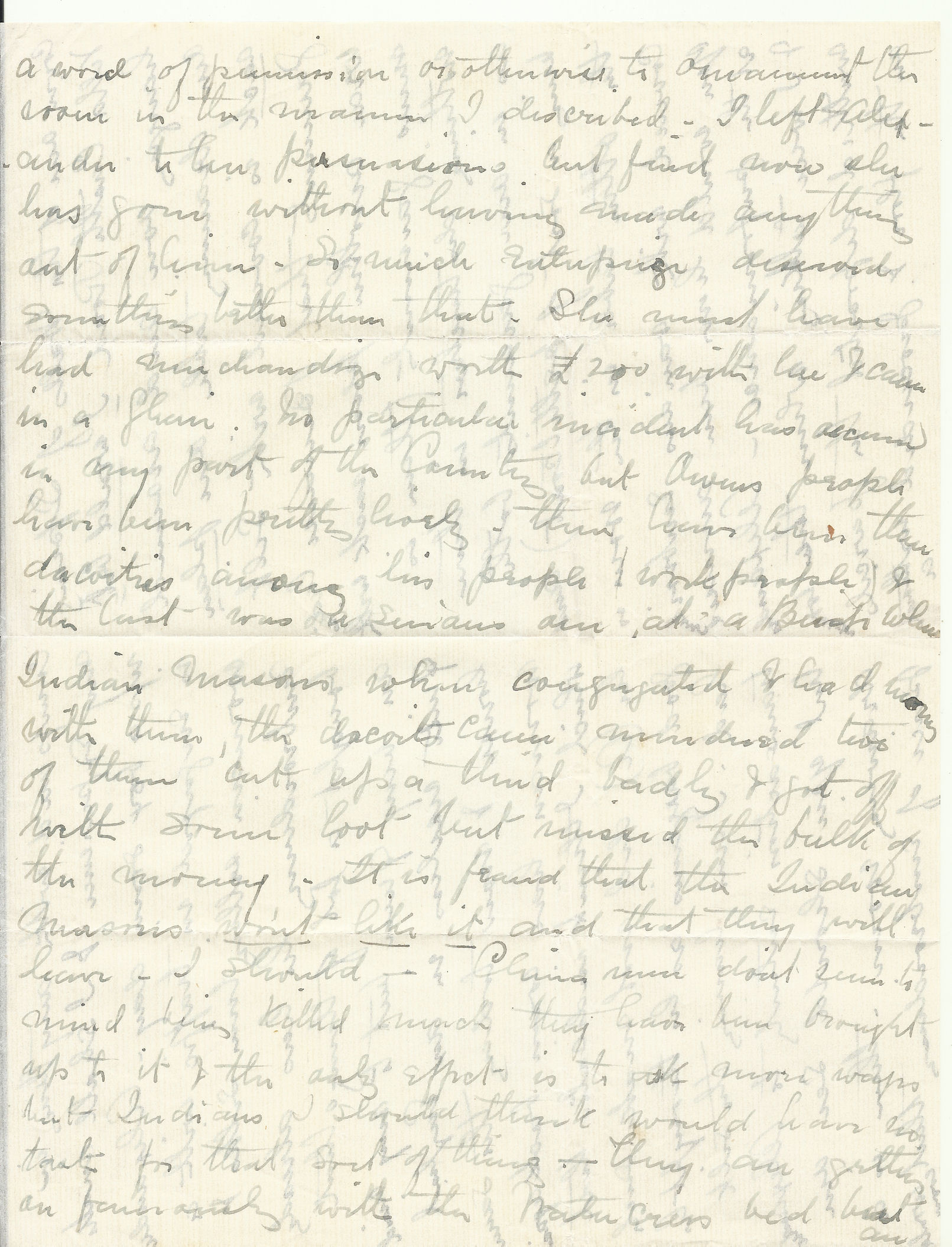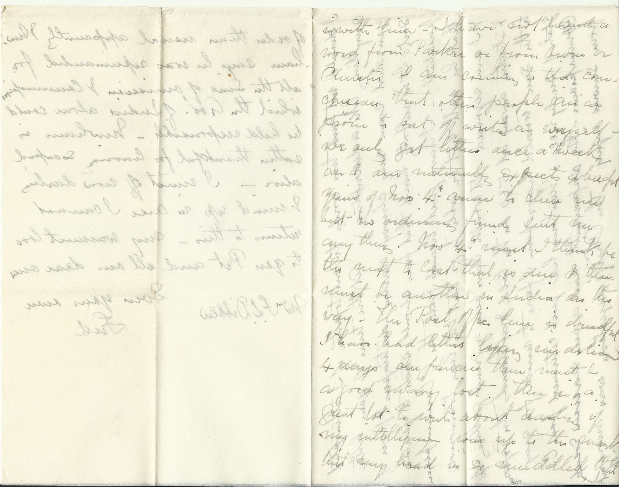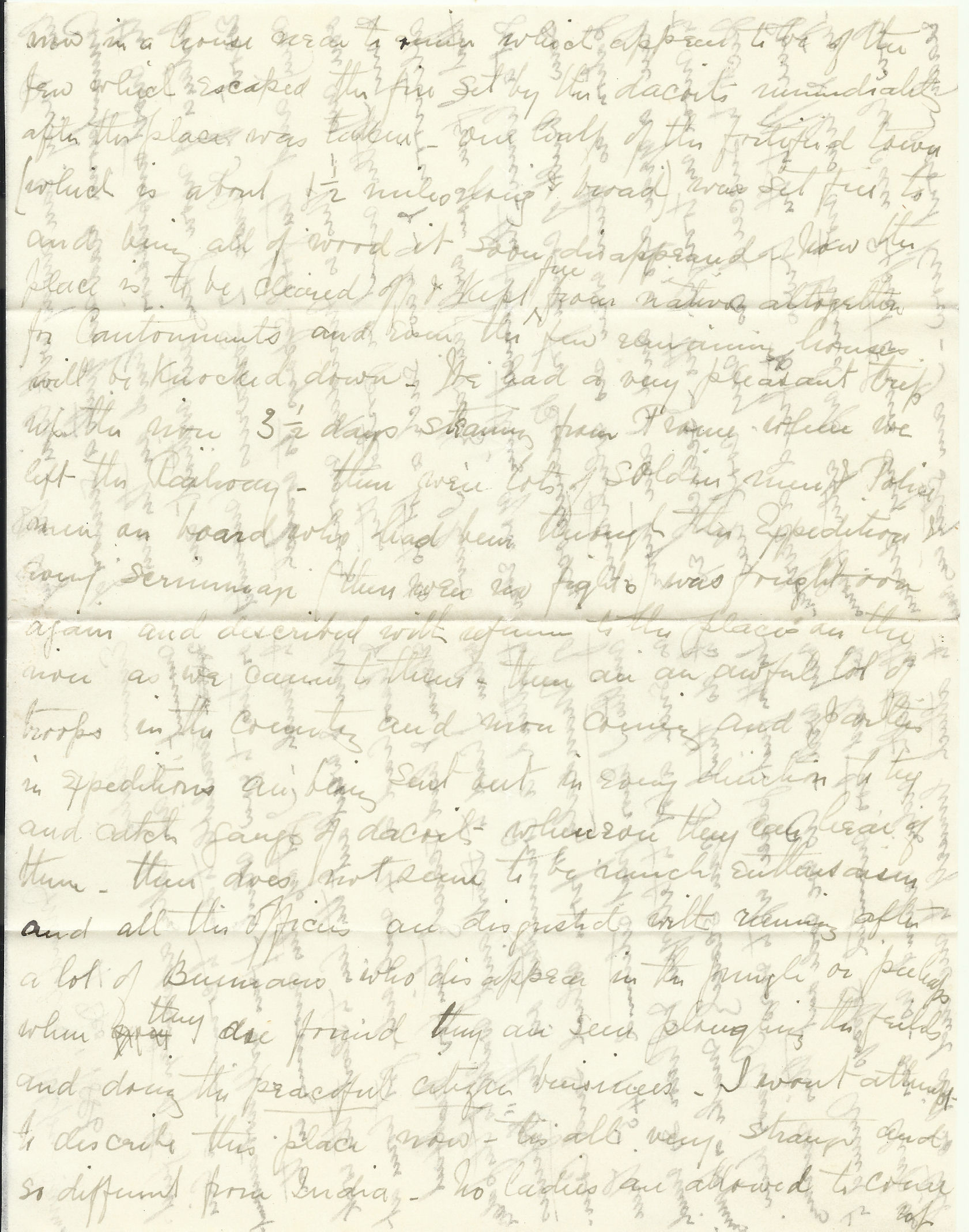 The weather here is a little hotter, than it was in Rangoon, but I am glad to get away from the incessant rain. They had Cyclone there at Rangoon, since I left, which made the weather more uncomfortable. I must now stop, & finish Mother's letter.