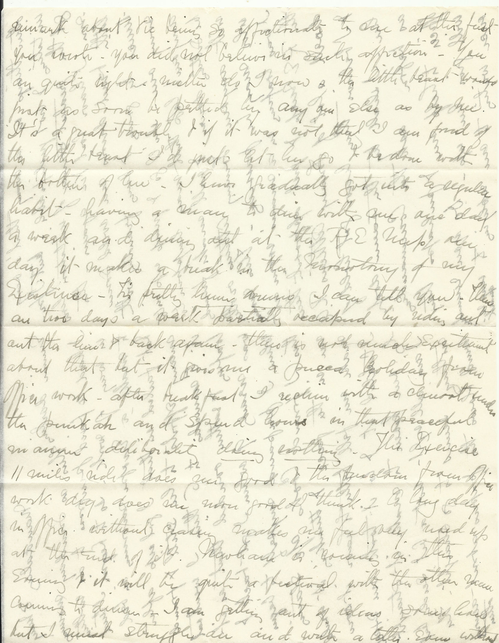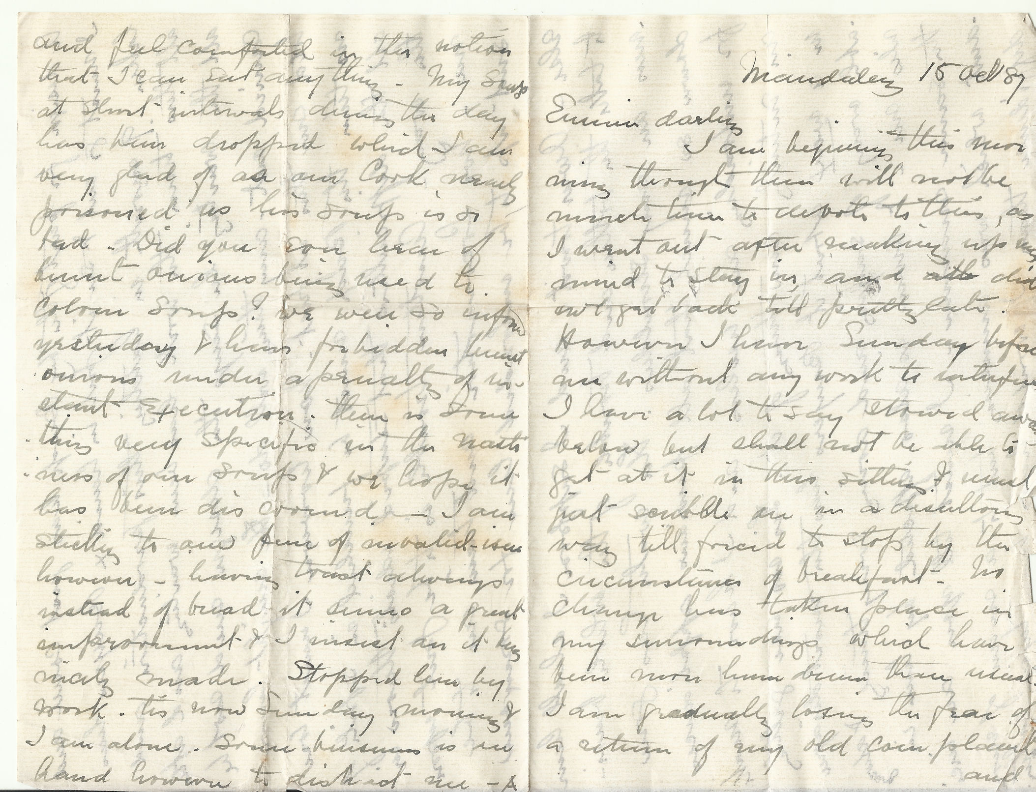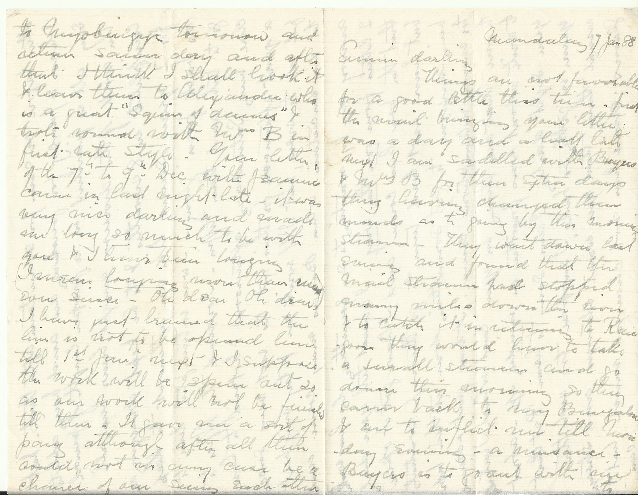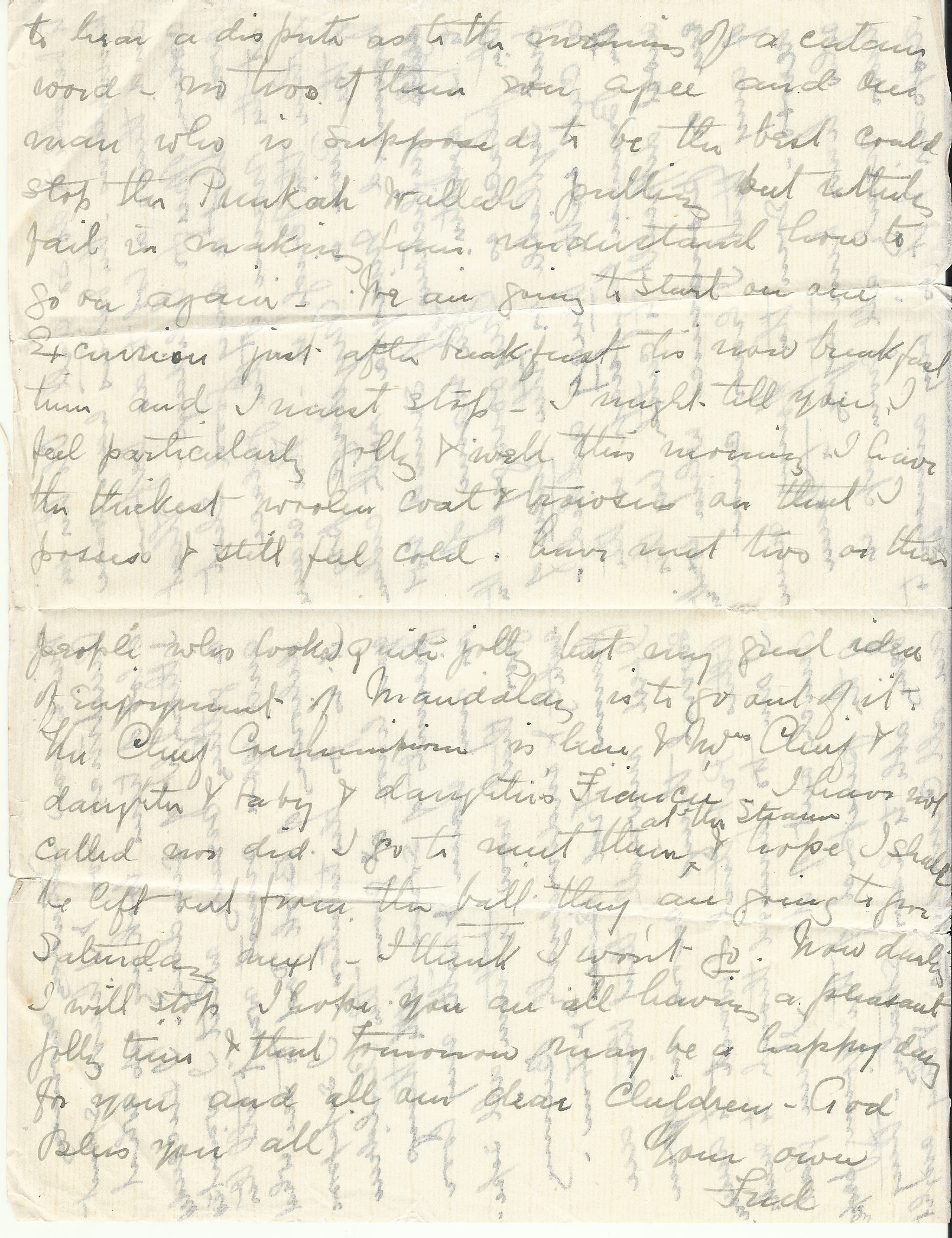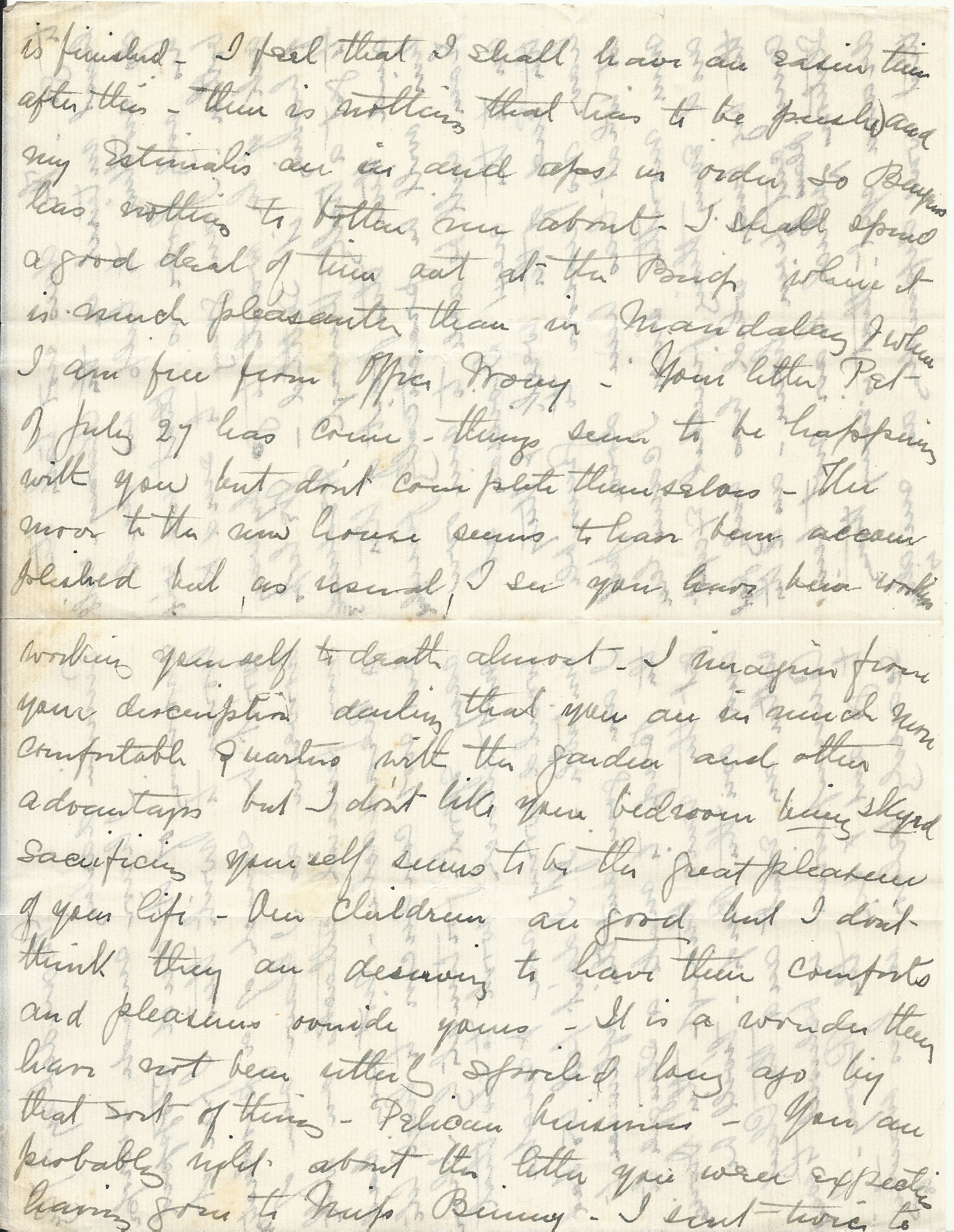 Now, darling, I must tell you, now it having passed, all that was in my mind, when I was staying in Rangoon, that kept my spirits down, & prevented cheerful letters, & writing separate letters to the young people. I was seedy, my digestion apparatus got all wrong, and I could neither eat or digest enough to keep me going. I did not eat a mouthful of meat for three months. I got rest from work, got away from Mandalay, & proper treatment, and so gradually got right again. So I am just as glad, nothing was said about it, but you can understand my being pretty low spirited.