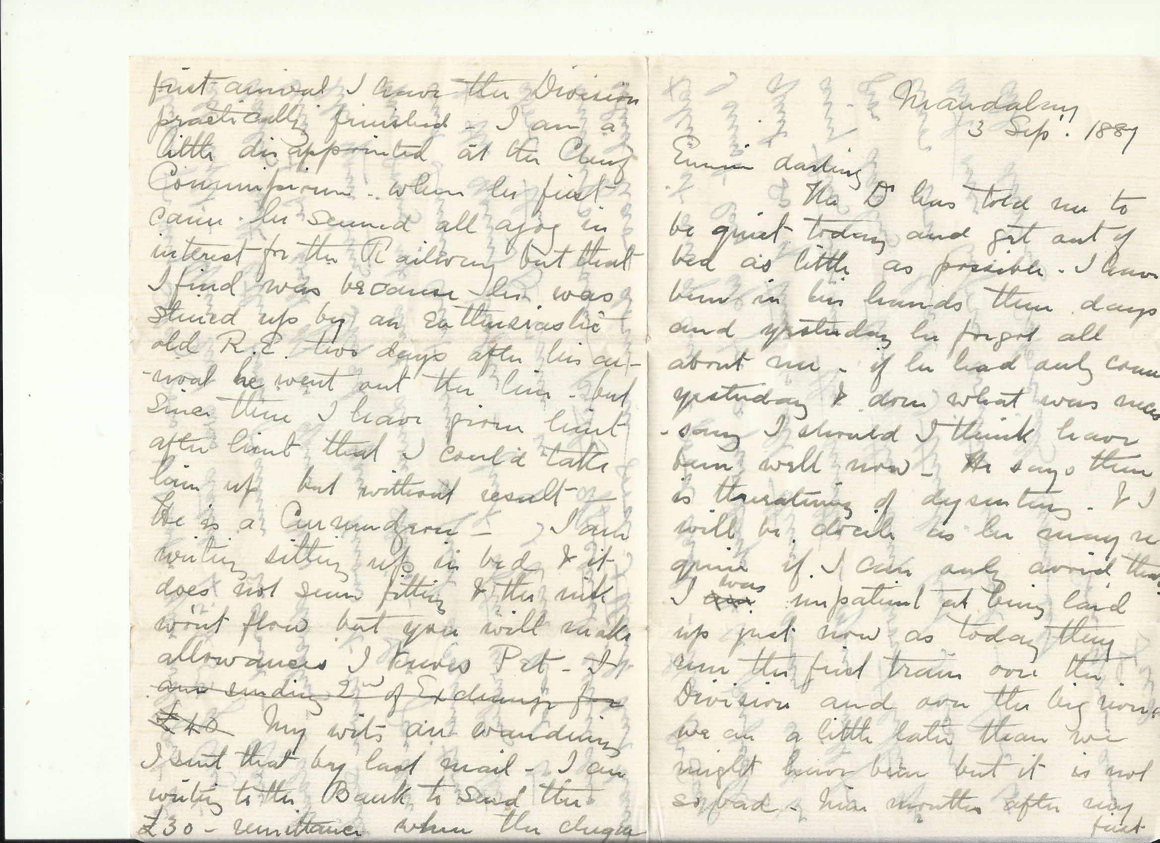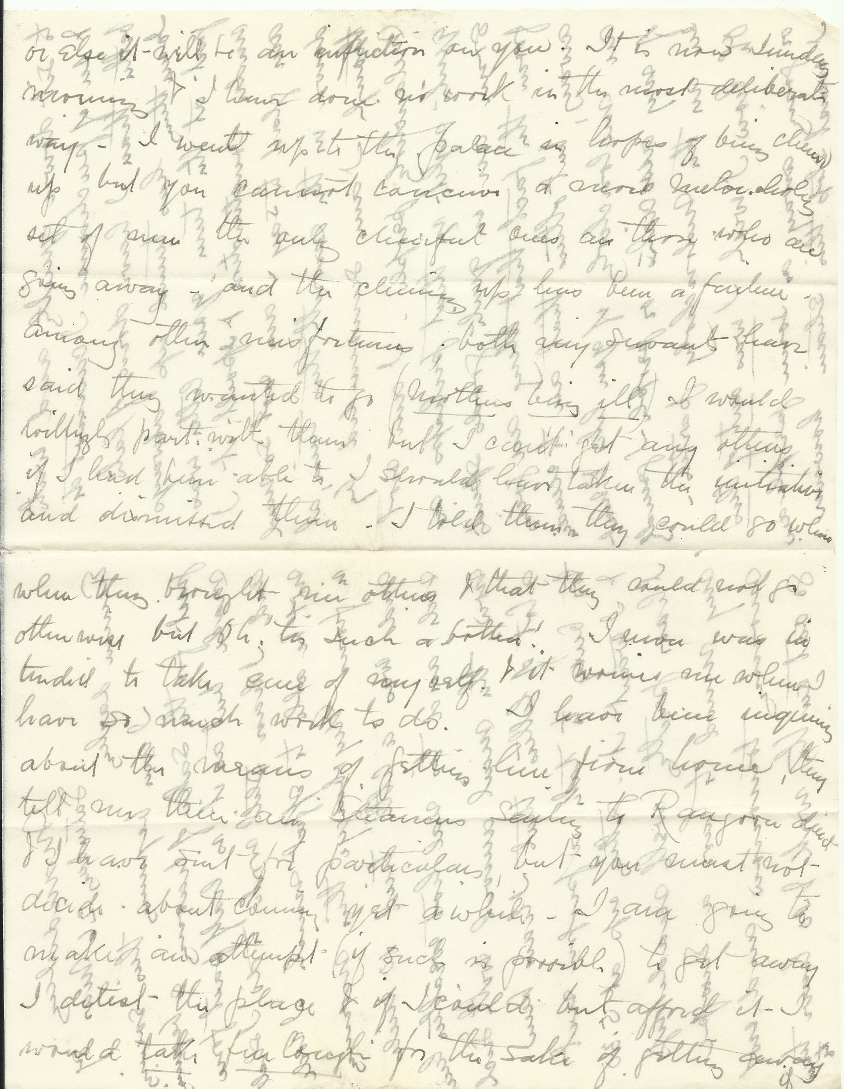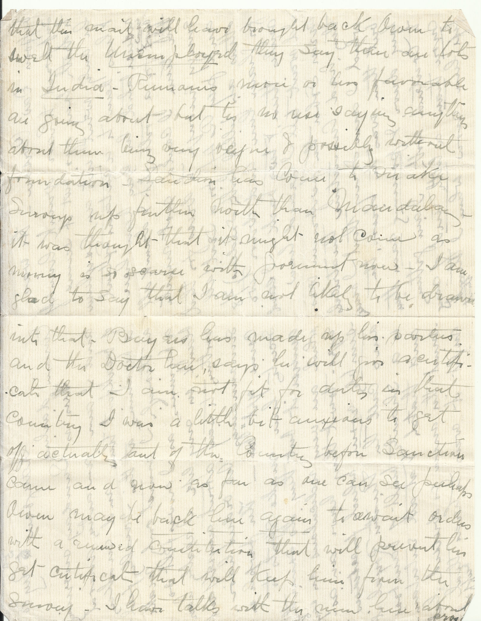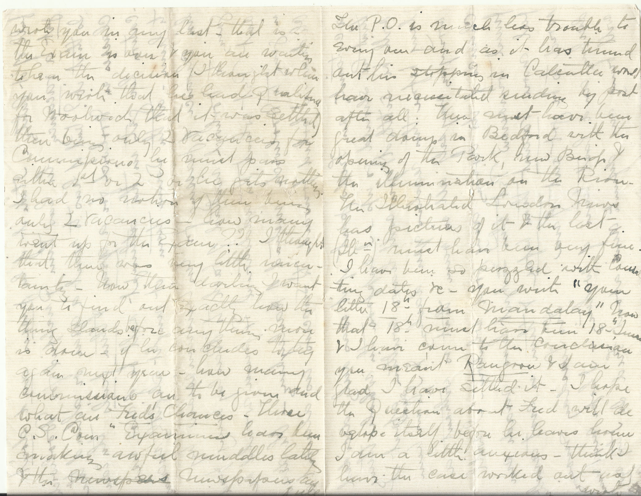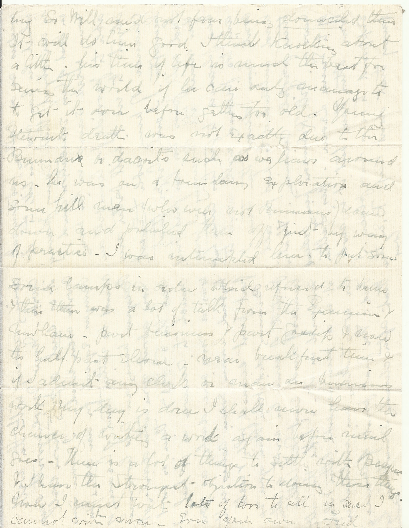 Now, darling, I must tell you, now it having passed, all that was in my mind, when I was staying in Rangoon, that kept my spirits down, & prevented cheerful letters, & writing separate letters to the young people. I was seedy, my digestion apparatus got all wrong, and I could neither eat or digest enough to keep me going. I did not eat a mouthful of meat for three months. I got rest from work, got away from Mandalay, & proper treatment, and so gradually got right again. So I am just as glad, nothing was said about it, but you can understand my being pretty low spirited.