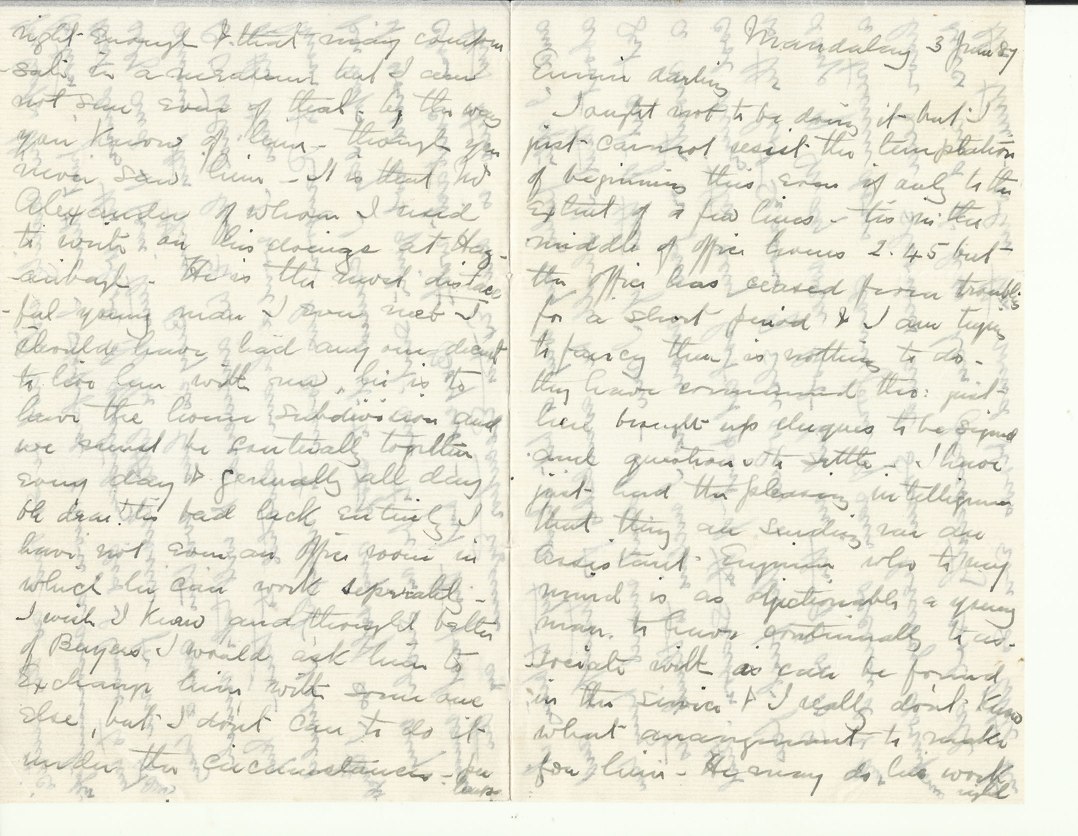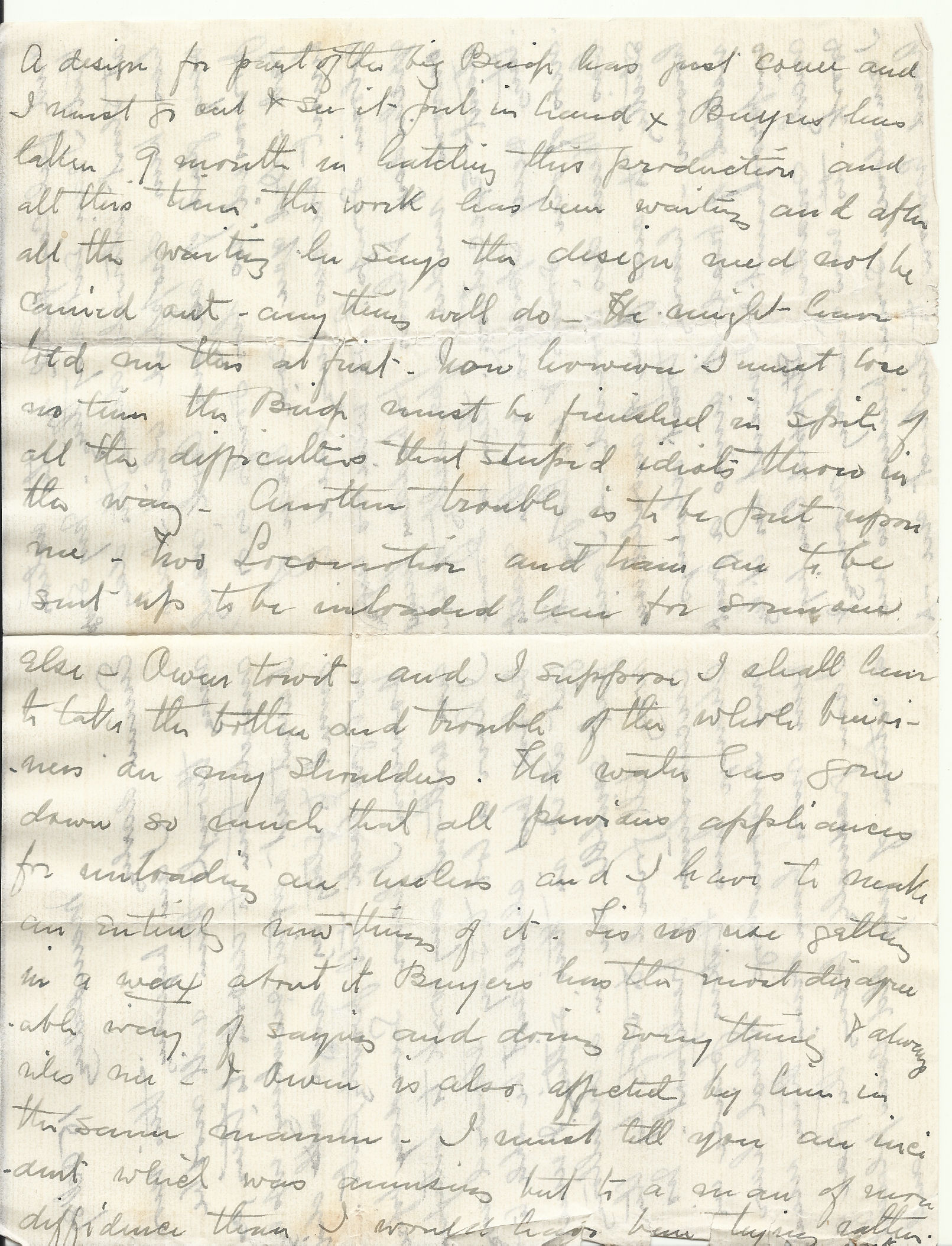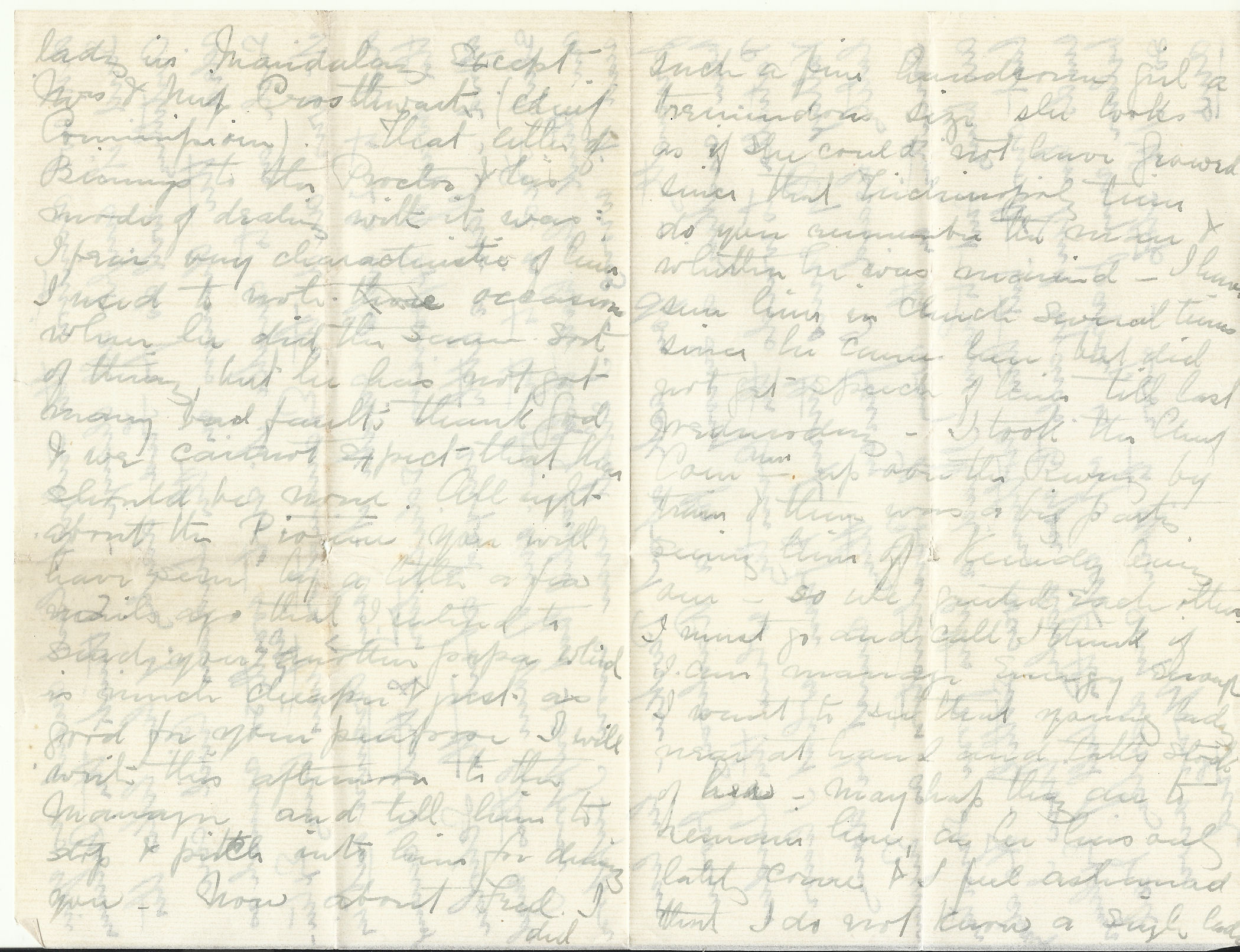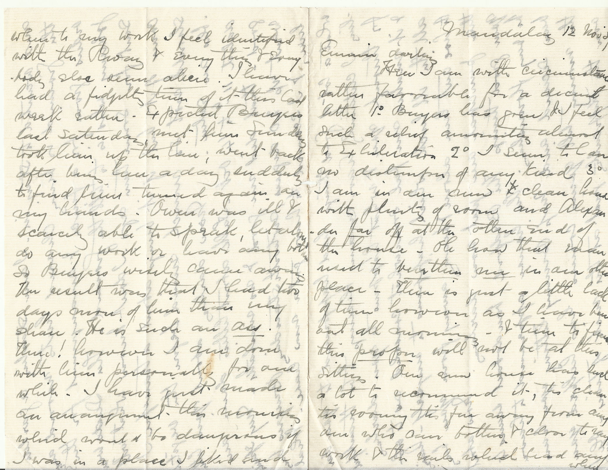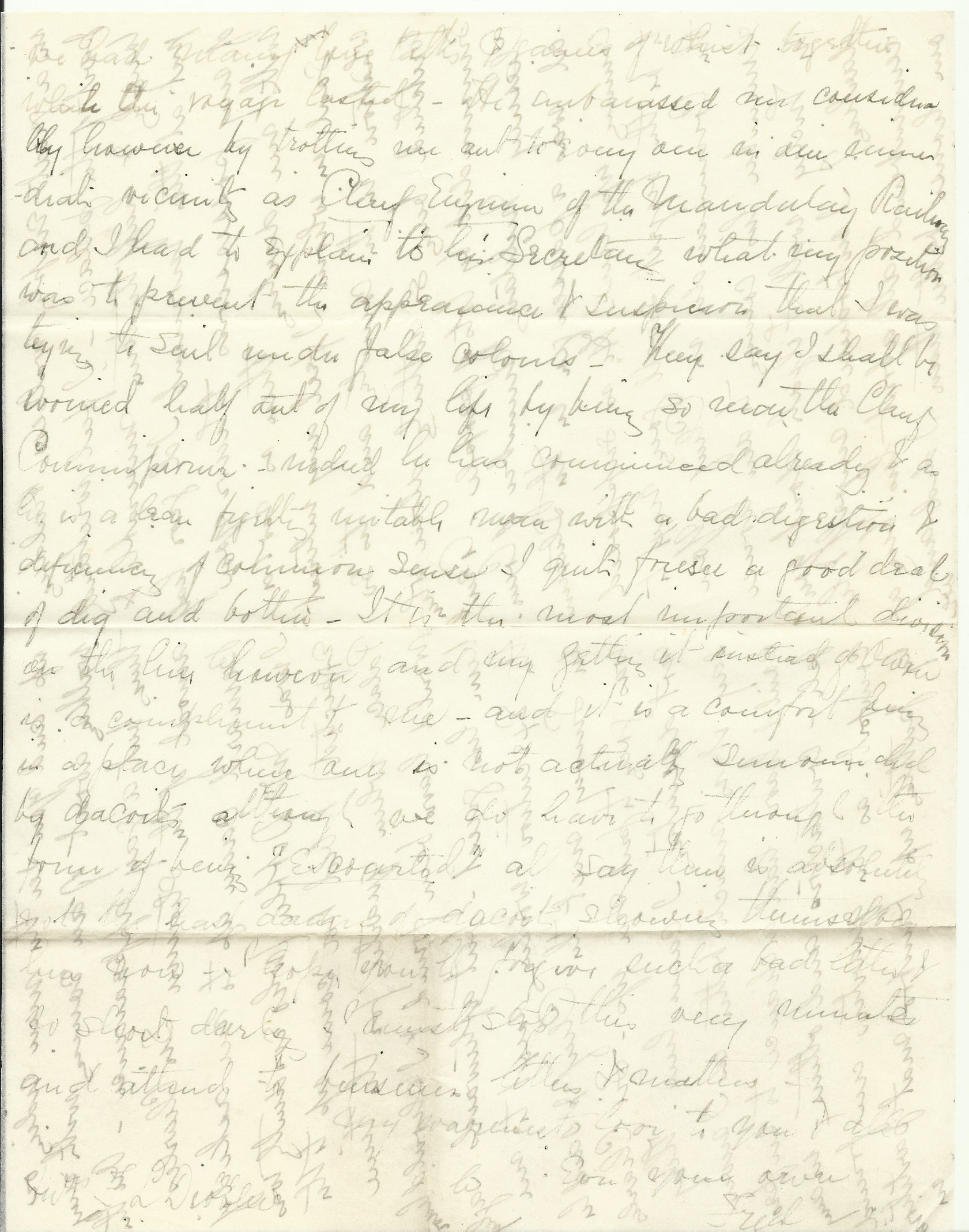Now, darling, I must tell you, now it having passed, all that was in my mind, when I was staying in Rangoon, that kept my spirits down, & prevented cheerful letters, & writing separate letters to the young people. I was seedy, my digestion apparatus got all wrong, and I could neither eat or digest enough to keep me going. I did not eat a mouthful of meat for three months. I got rest from work, got away from Mandalay, & proper treatment, and so gradually got right again. So I am just as glad, nothing was said about it, but you can understand my being pretty low spirited.