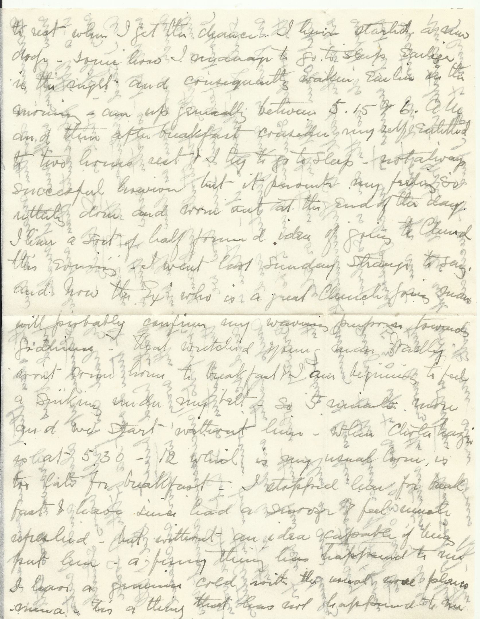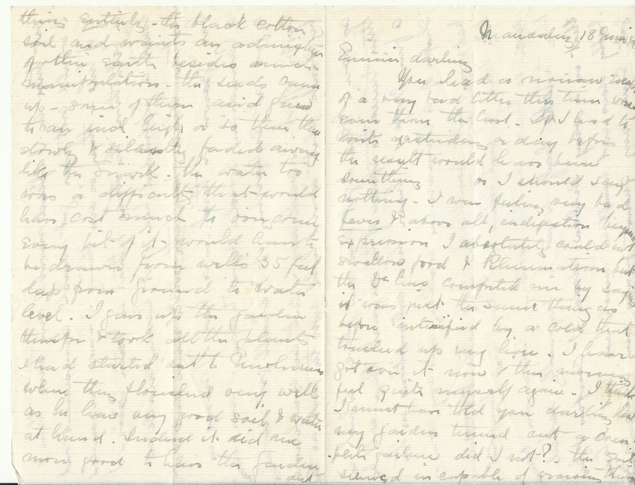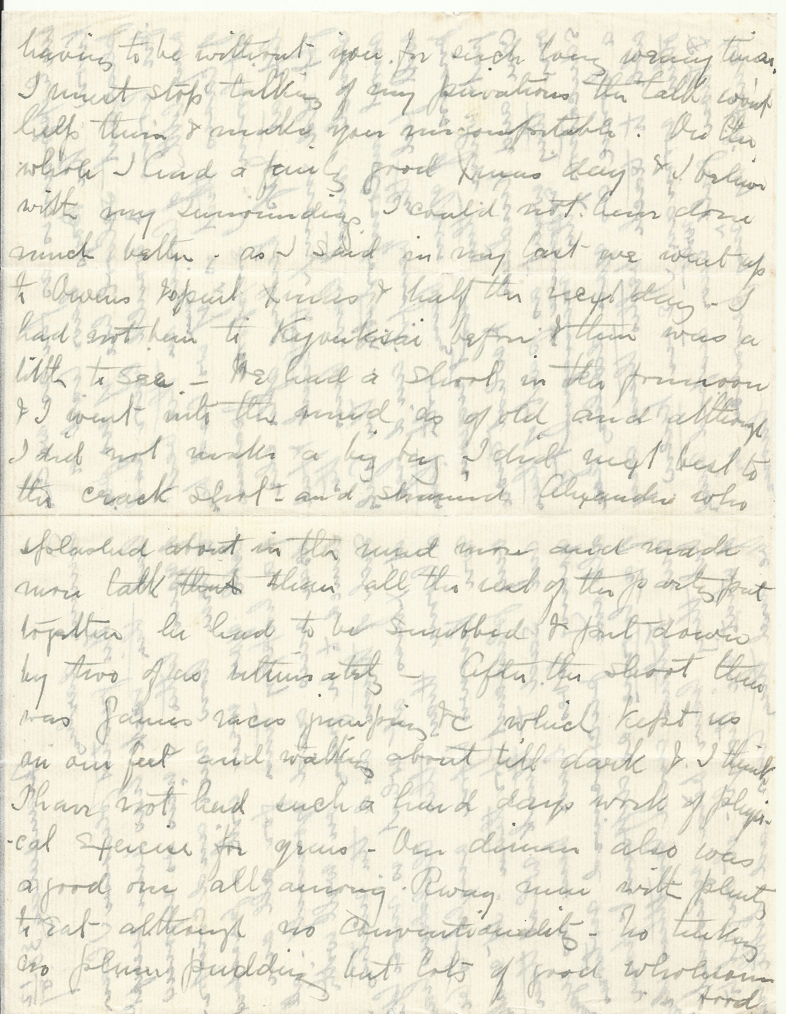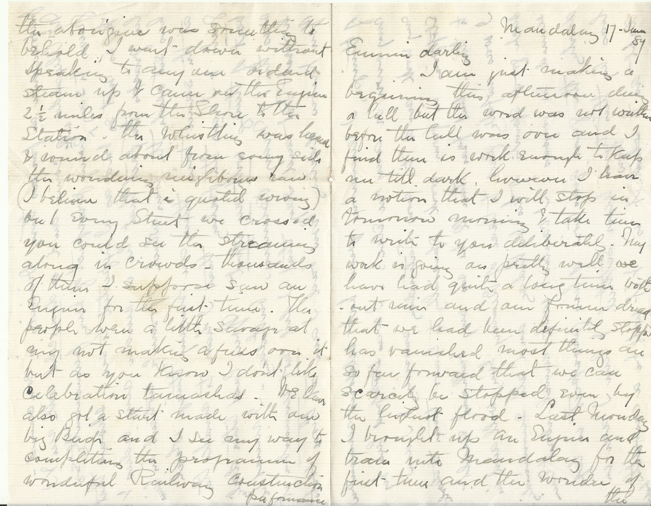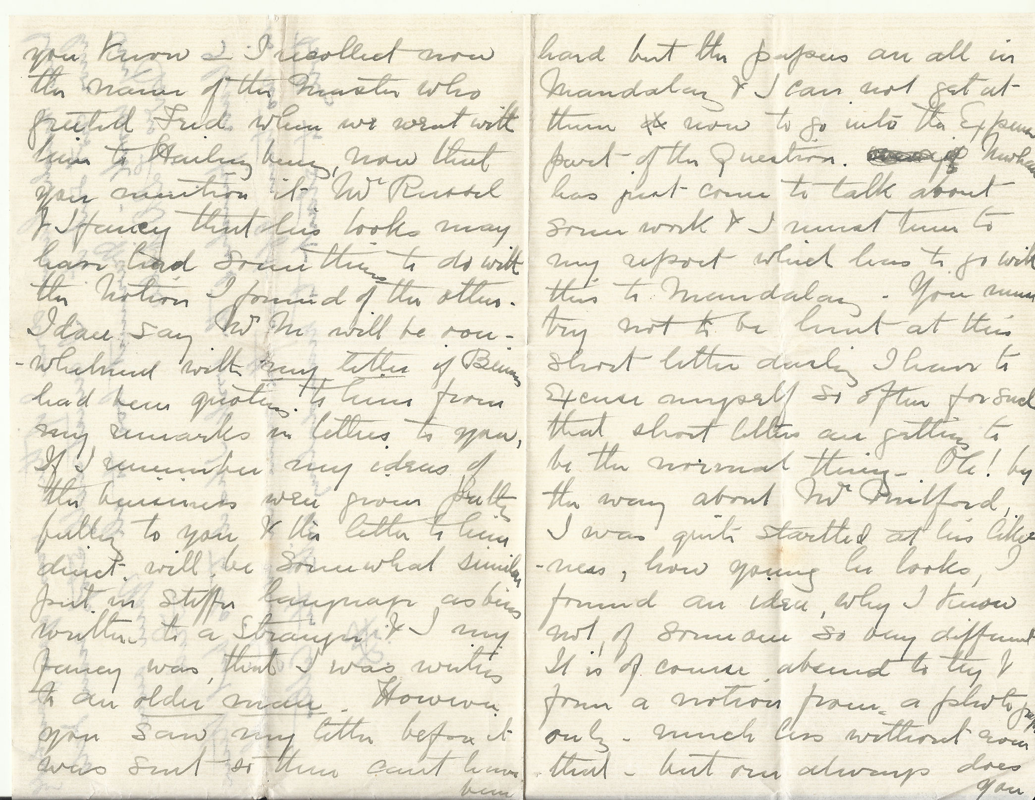 Now, darling, I must tell you, now it having passed, all that was in my mind, when I was staying in Rangoon, that kept my spirits down, & prevented cheerful letters, & writing separate letters to the young people. I was seedy, my digestion apparatus got all wrong, and I could neither eat or digest enough to keep me going. I did not eat a mouthful of meat for three months. I got rest from work, got away from Mandalay, & proper treatment, and so gradually got right again. So I am just as glad, nothing was said about it, but you can understand my being pretty low spirited.