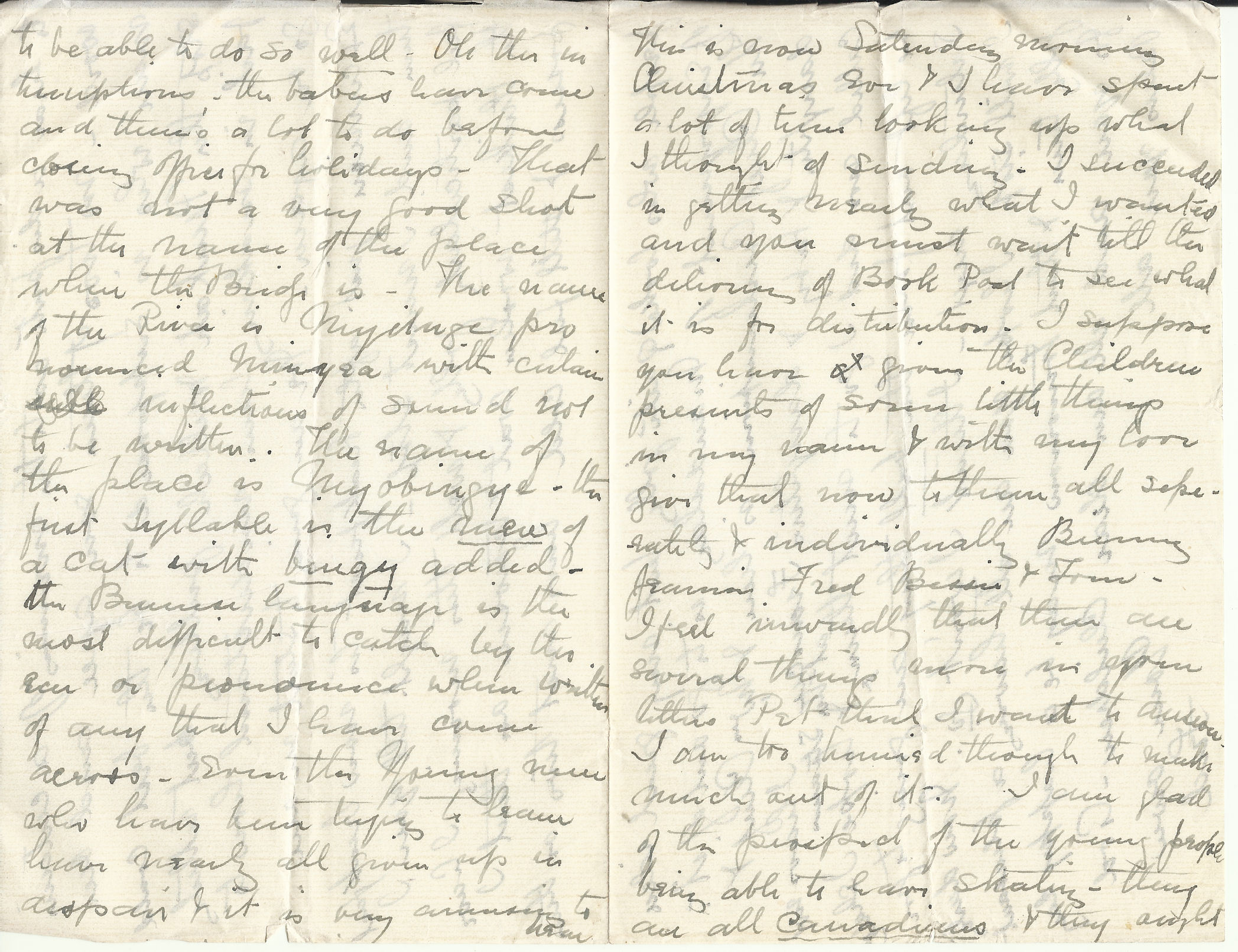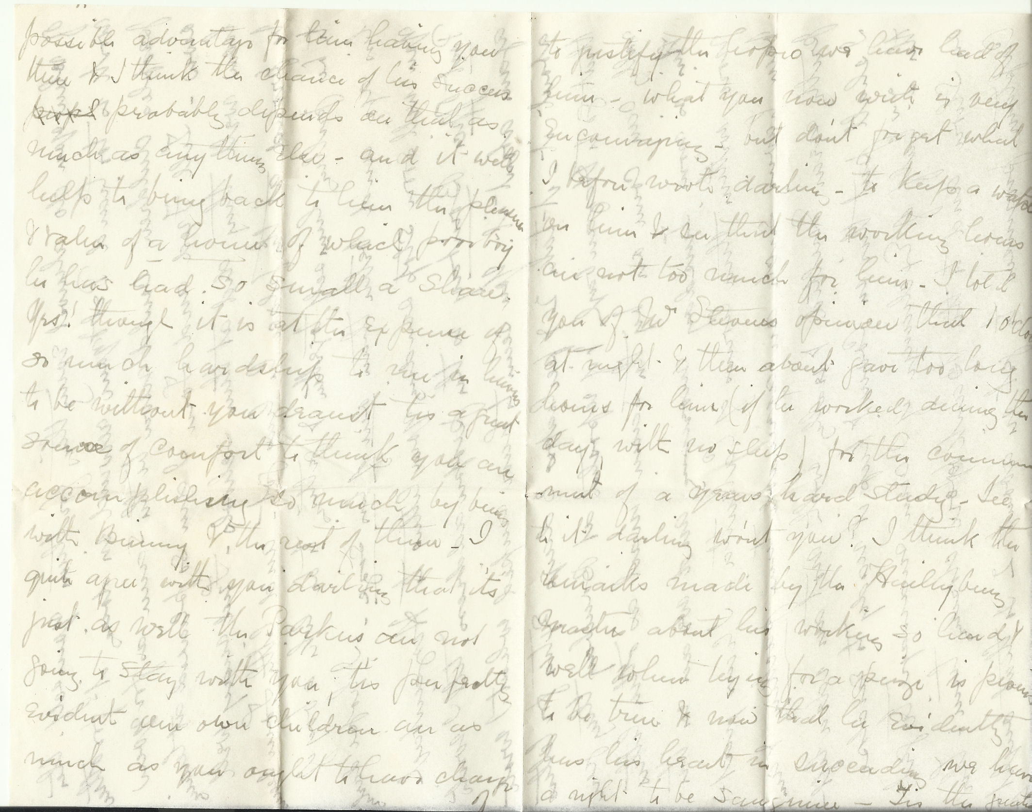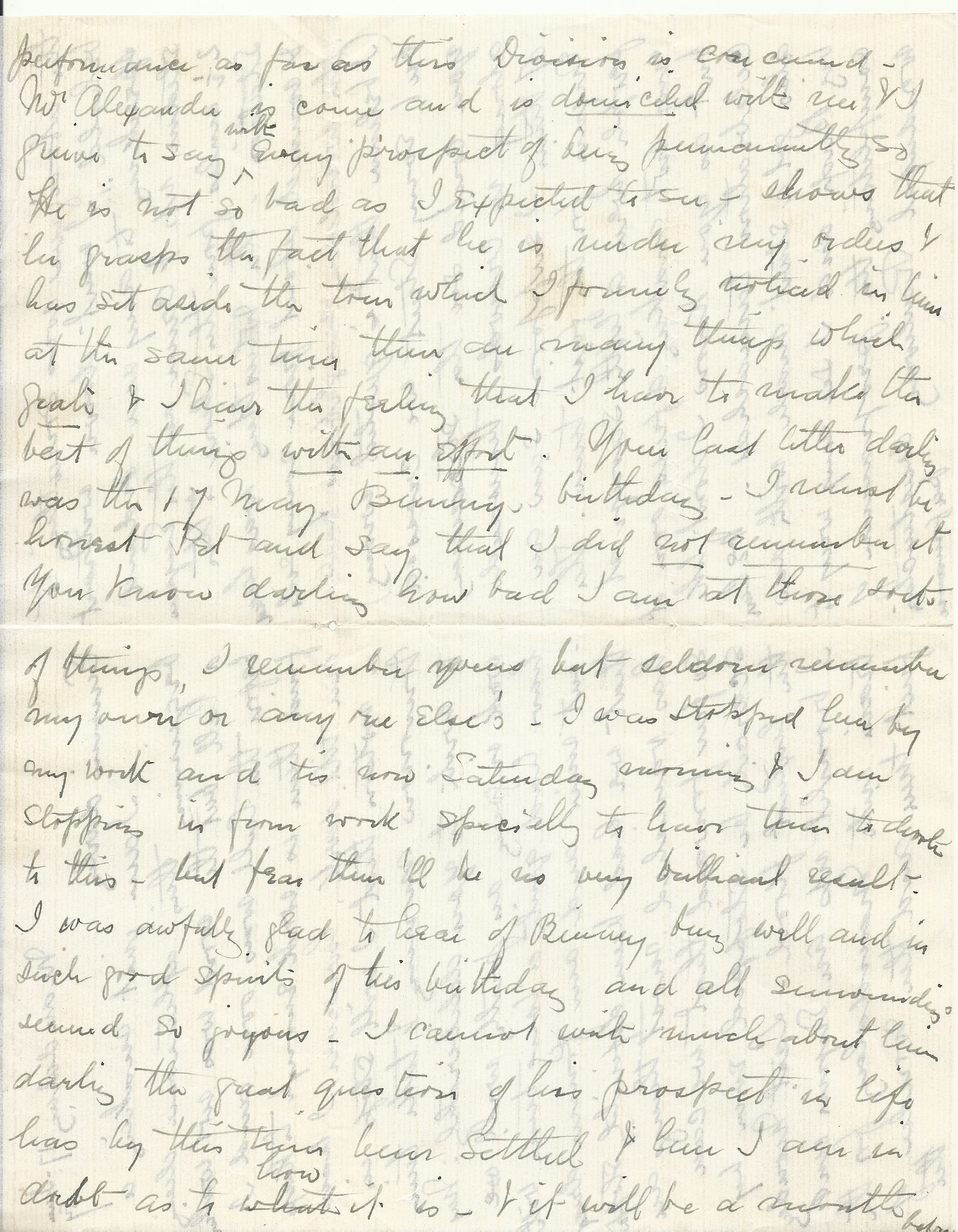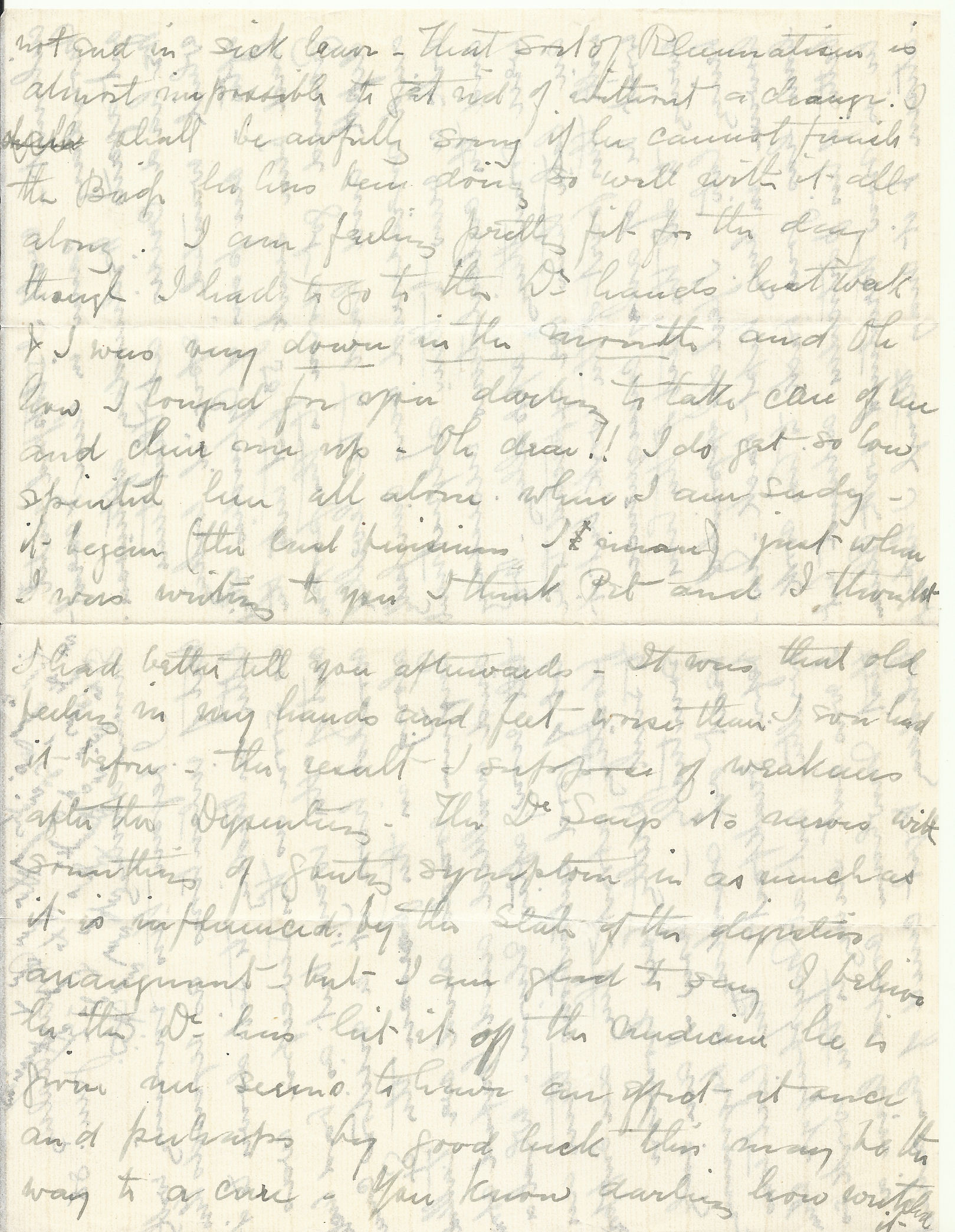 Now, darling, I must tell you, now it having passed, all that was in my mind, when I was staying in Rangoon, that kept my spirits down, & prevented cheerful letters, & writing separate letters to the young people. I was seedy, my digestion apparatus got all wrong, and I could neither eat or digest enough to keep me going. I did not eat a mouthful of meat for three months. I got rest from work, got away from Mandalay, & proper treatment, and so gradually got right again. So I am just as glad, nothing was said about it, but you can understand my being pretty low spirited.