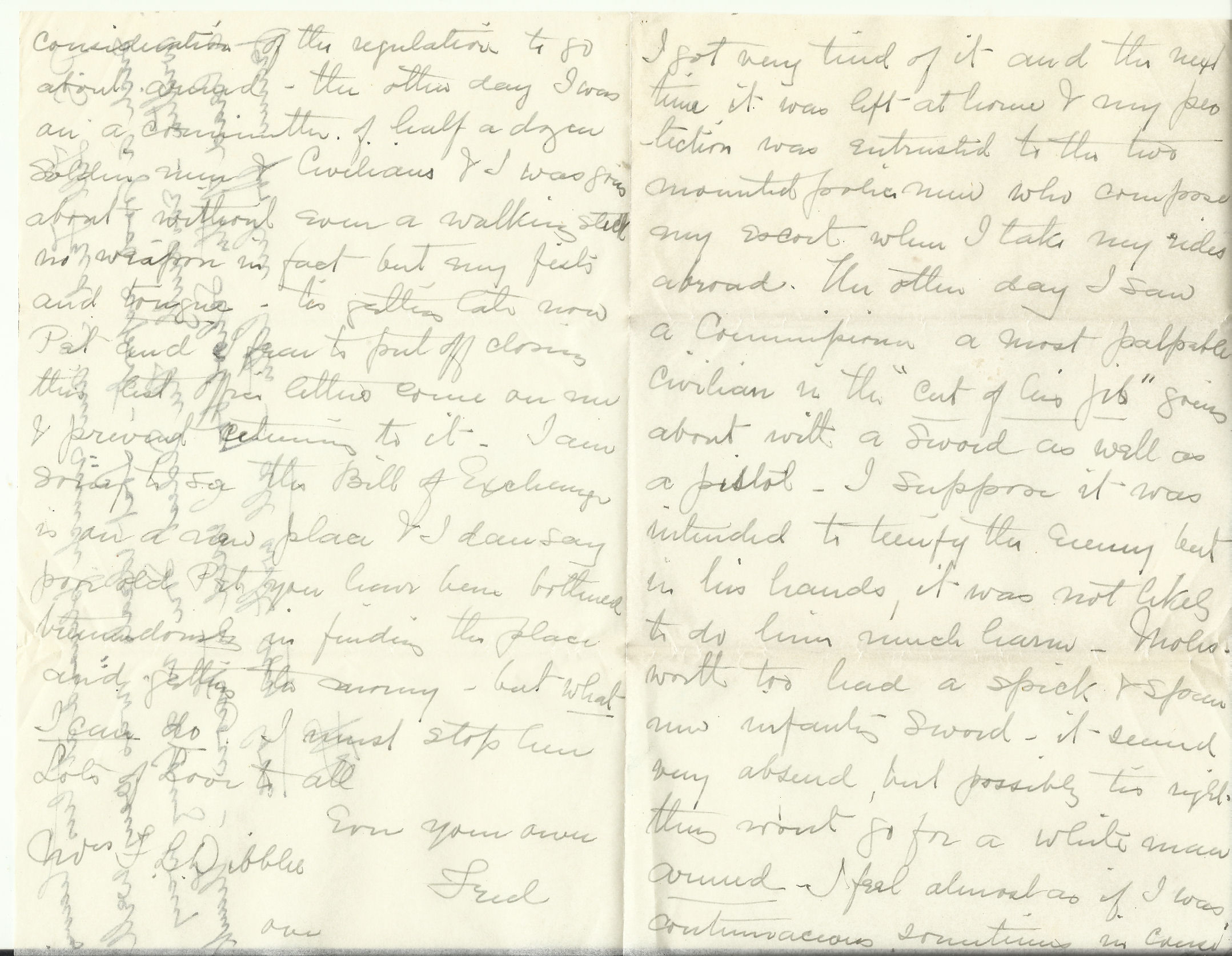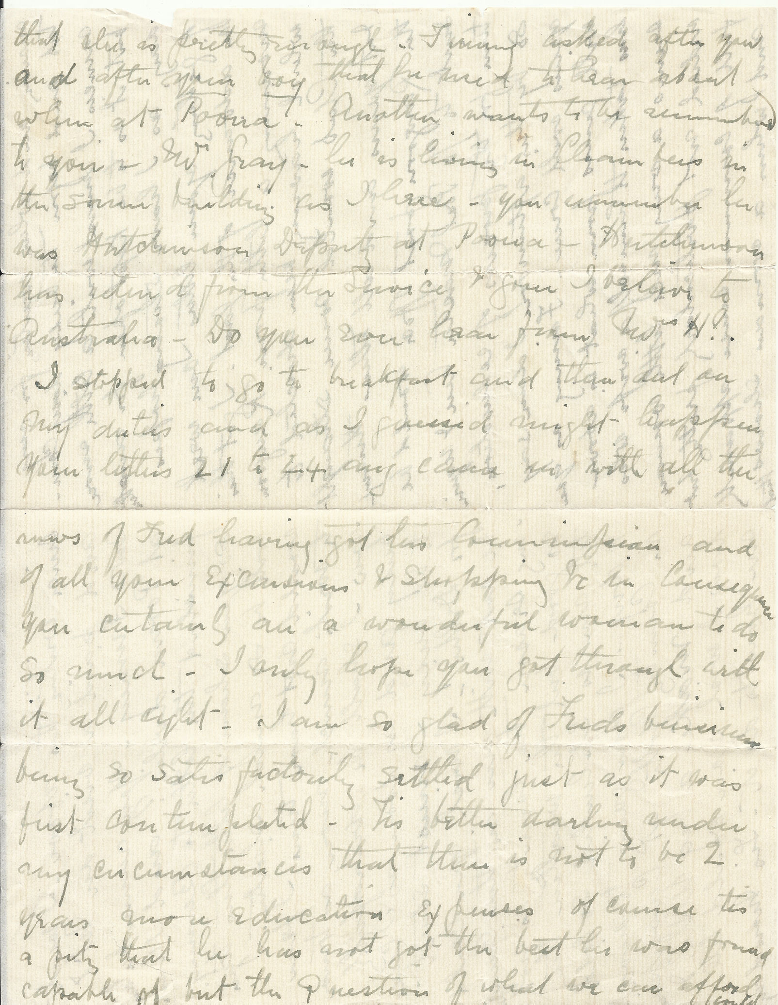 I stopped to go to breakfast, and then out on my duties, and, as I guessed might happen, your letters, 21 to 24 Aug, came in, with all the news, of Fred having got his Commission, and of all your excursions & shopping etc, in consequence. You certainly are a wonderful woman, to do so much. I only hope, you got through with it, all right. I am so glad of Fred's business being so satisfactorily settled, just as it was first contemplated. Tis better, darling, under my circumstances, that there is not to be 2 years more education expenses. Of course, tis a pity, that he has not got the best, he was found capable of, but the Question, of what we can afford, could not be lost sight of.