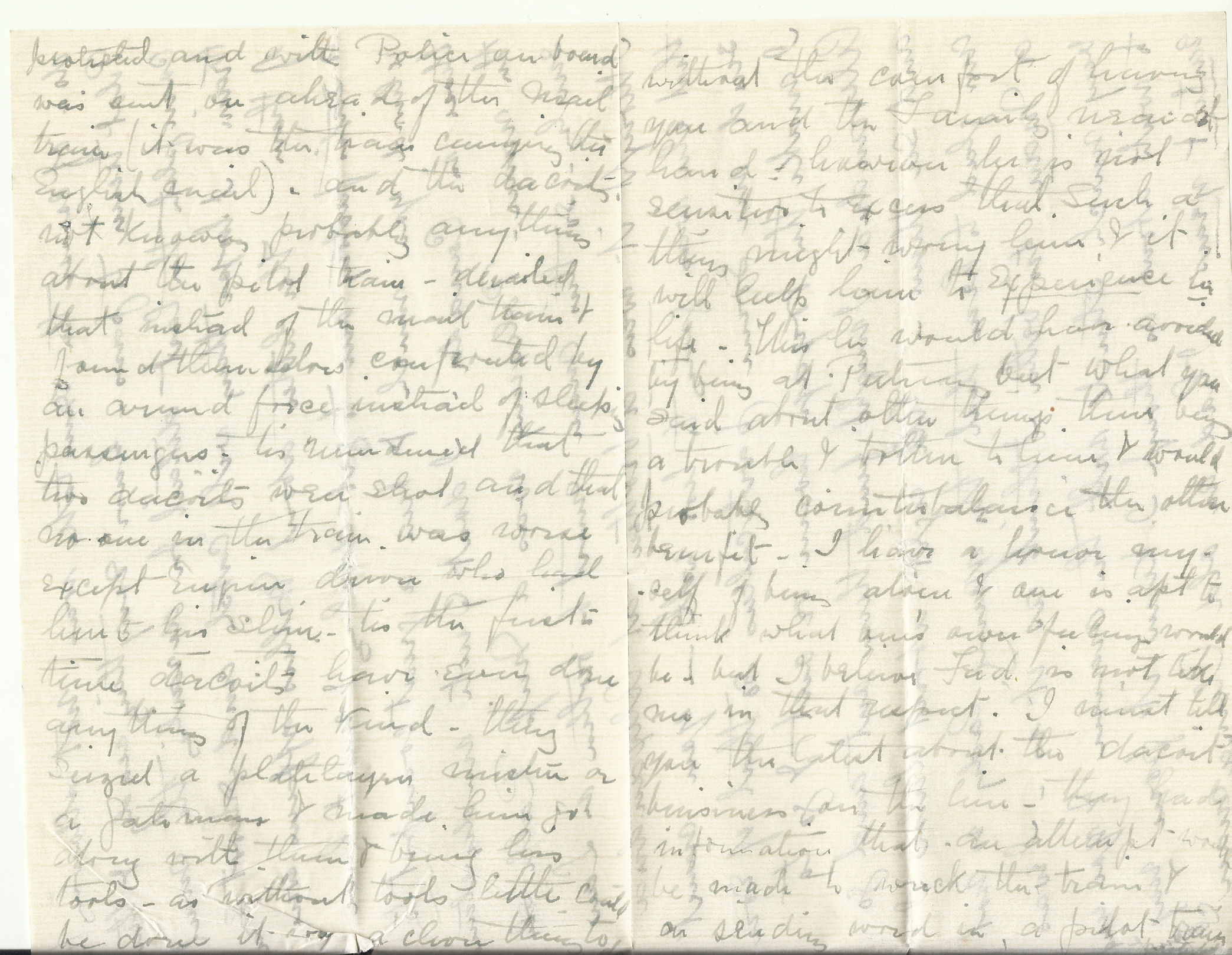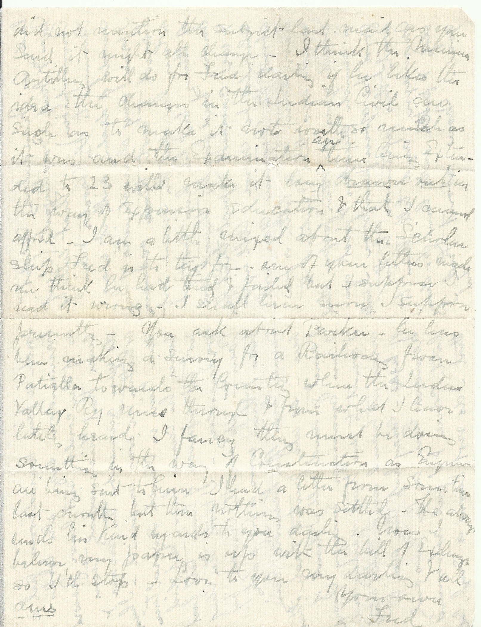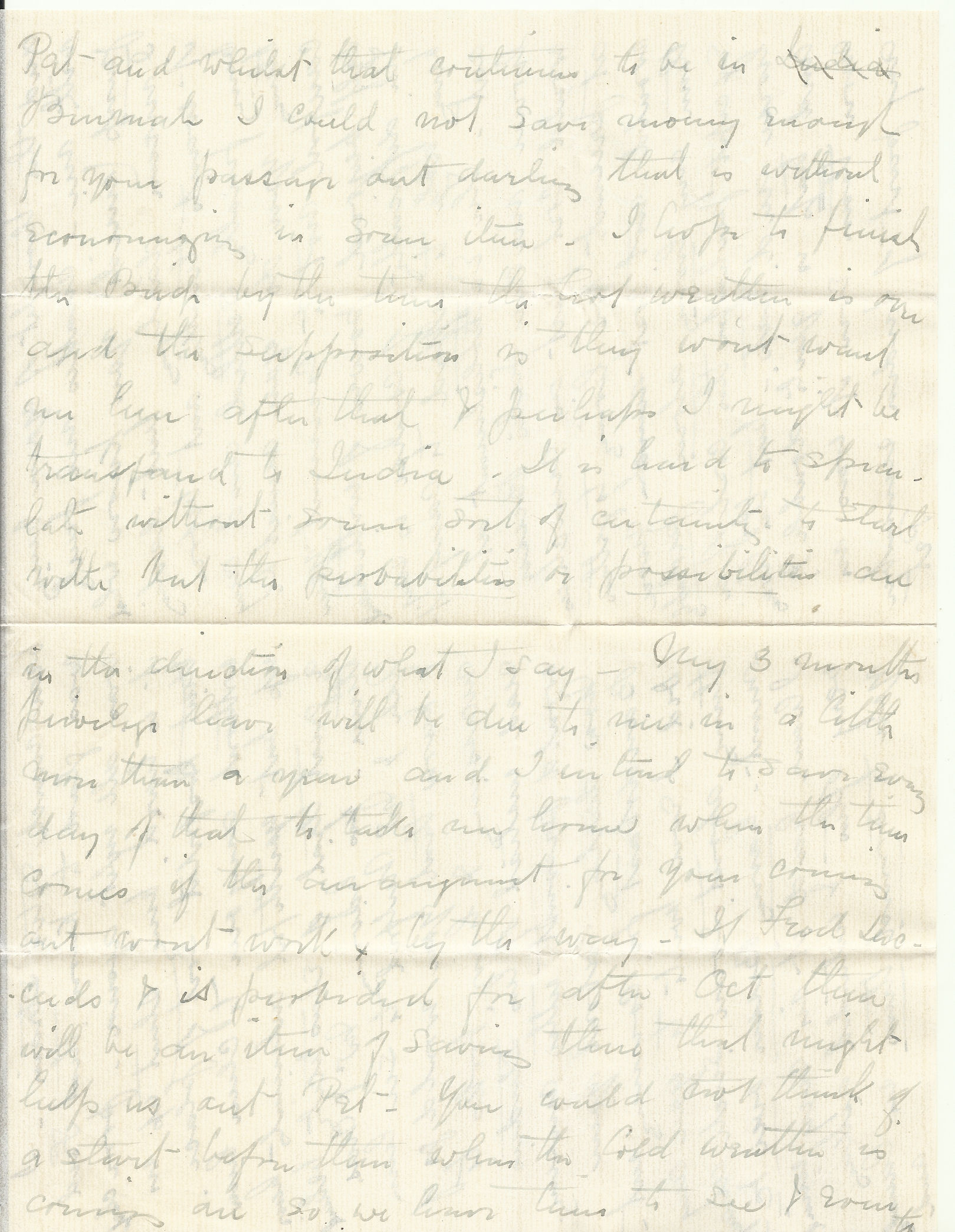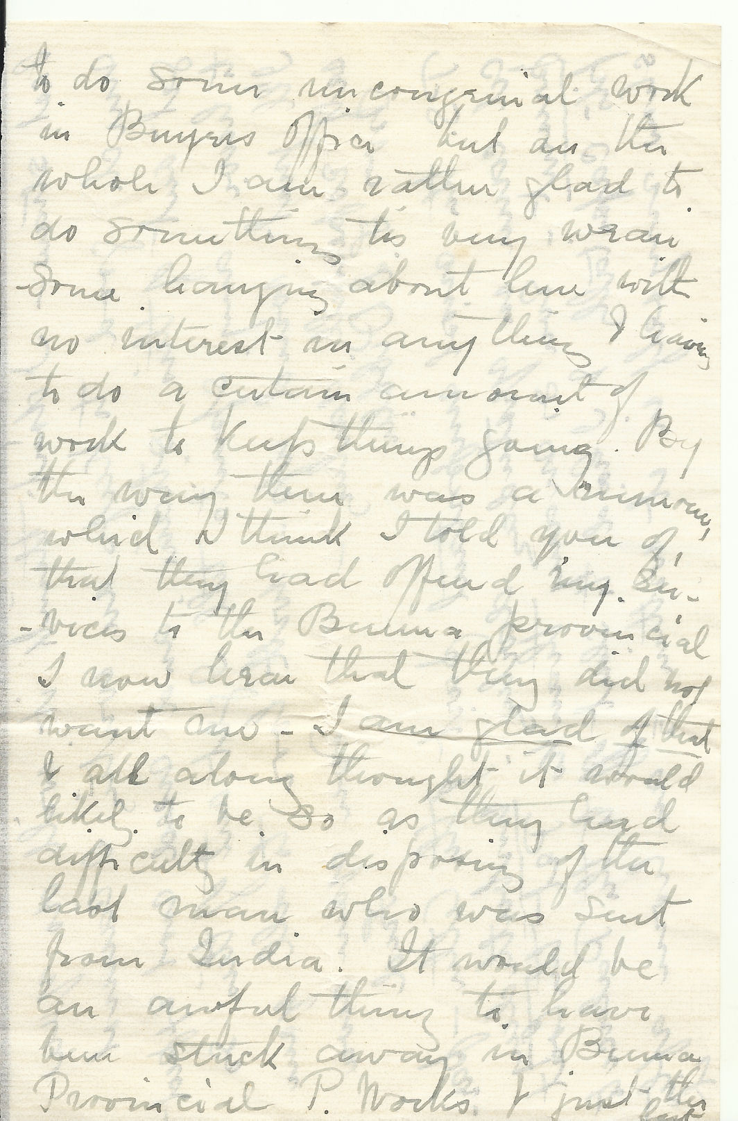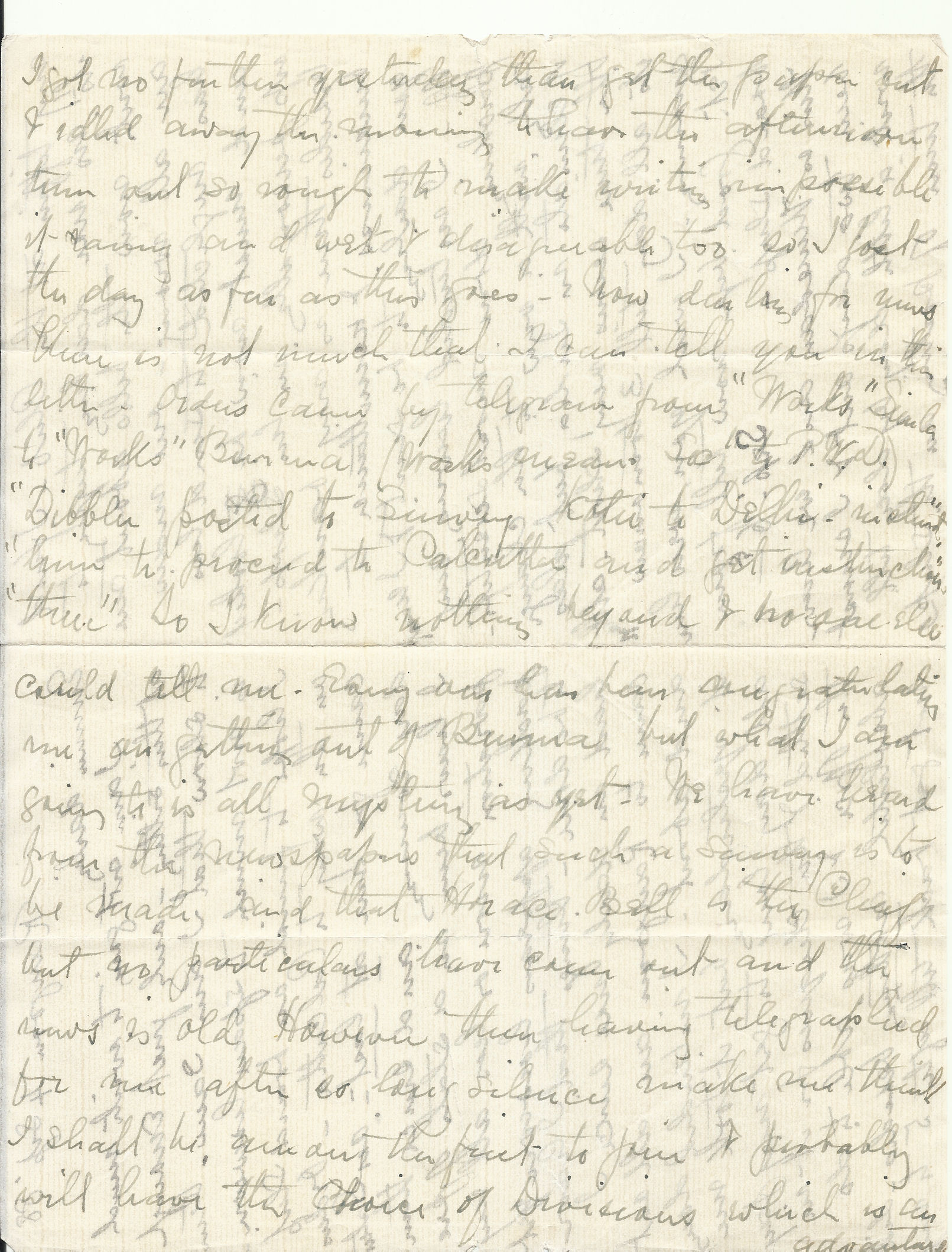 Now, darling, for news. There is not much, that I can tell you in this letter. Orders came by telegram, from "Works" Simla to "Works" Burma ("Works" means Sec to P.W.D.) "Dibblee posted to Survey Kotri to Delhi - instruct him to proceed to Calcutta, and get instruction there". So I know nothing beyond, & no-one else could tell me. Everyone has been congratulating me, on getting out of Burma, but what I am going to is all mystery as yet.