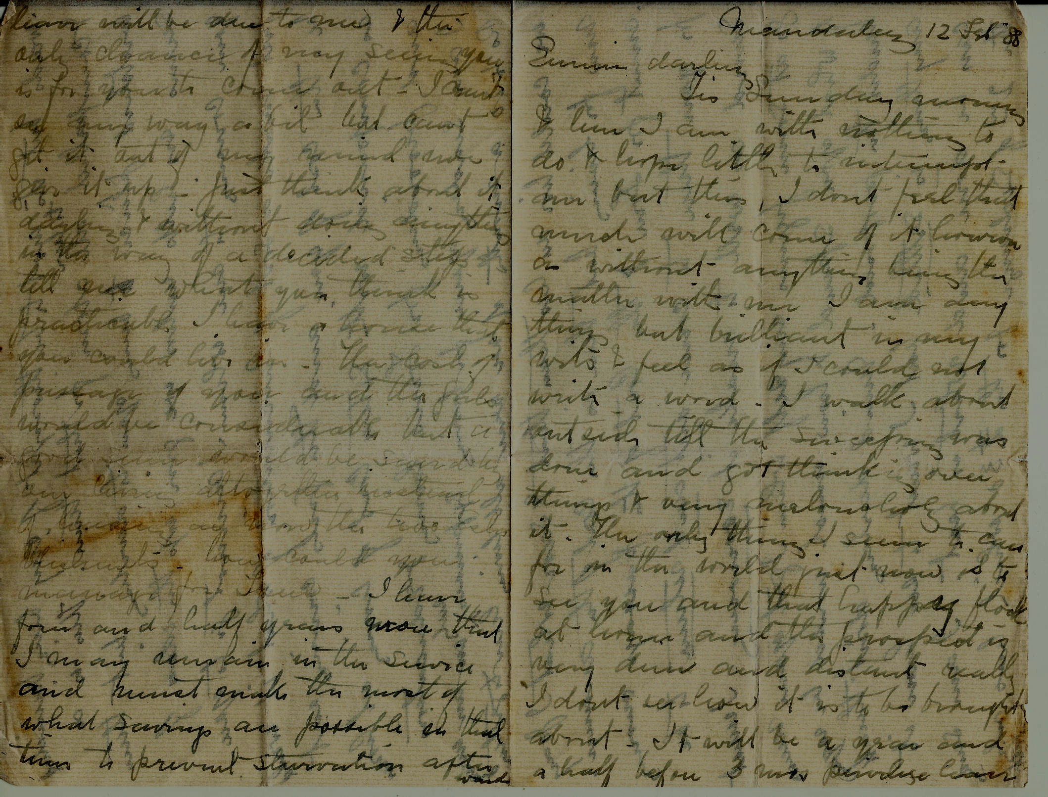 Ah me!!! If I can simply worry on, till next August, then three months leave will be due, & I can get home to you, my Pet. That is now what I look forward to, as the only piece of brightening before me.