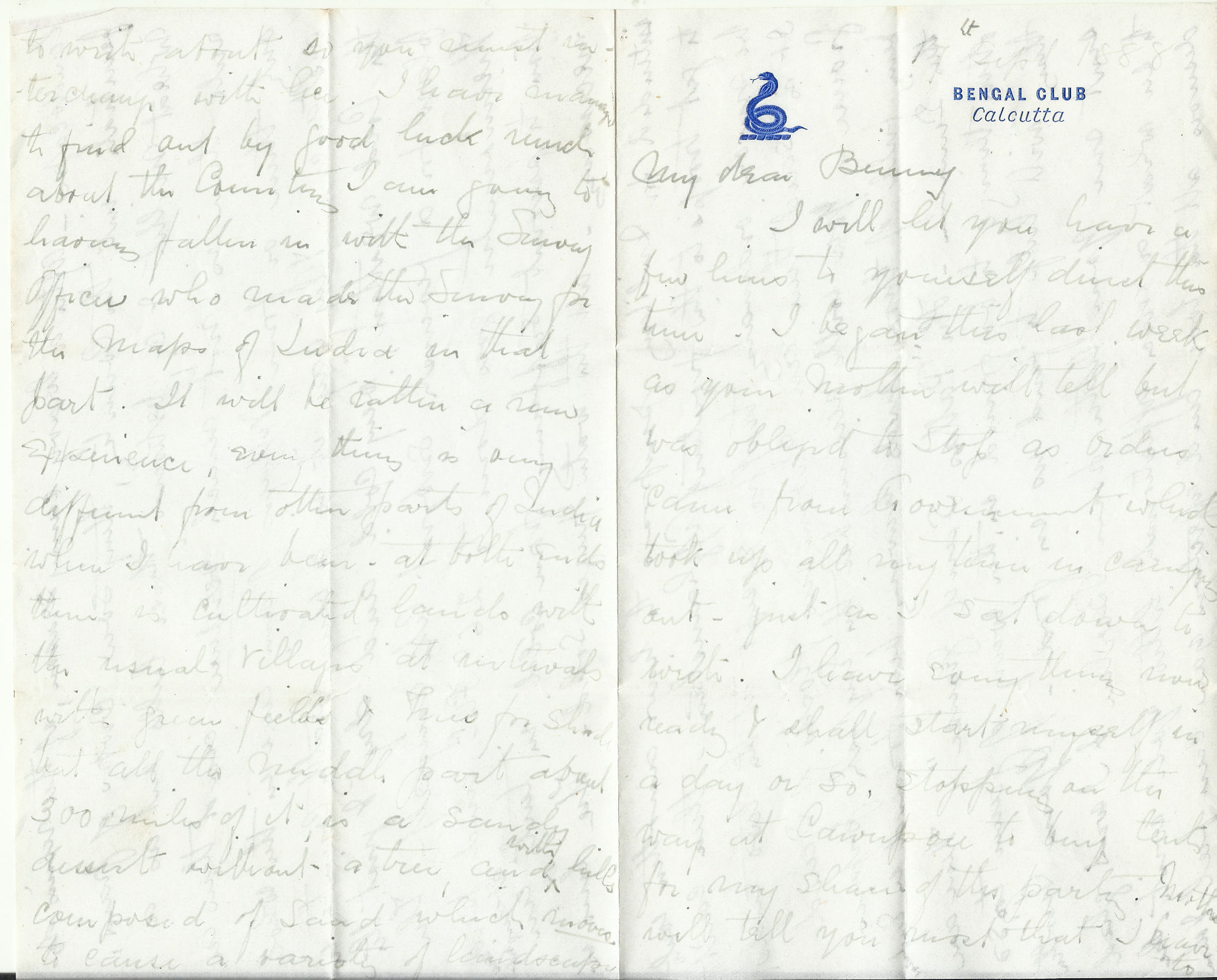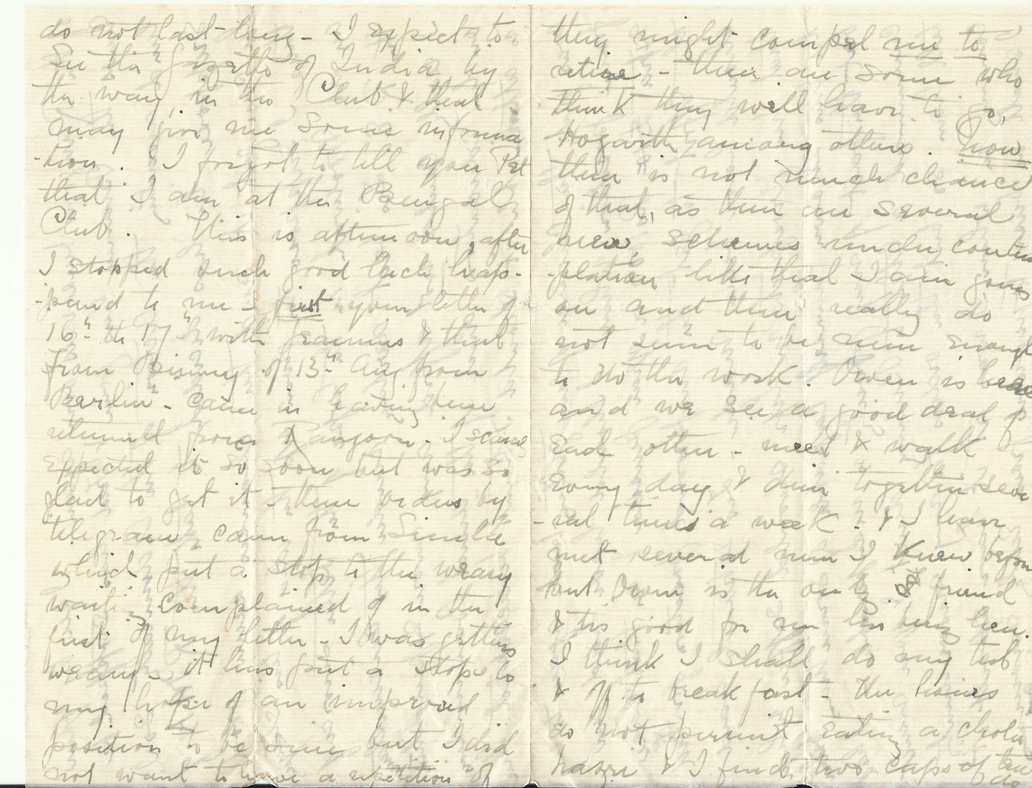 I think, I shall do my tub, & off to breakfast. The hours do not permit eating a chota hazri, & I find, two cups of tea do not last long. I expect to see the Gazette of India, by the way, in the Club, & that may give me some information. I forgot to tell you, Pet, that I am at the Bengal Club.