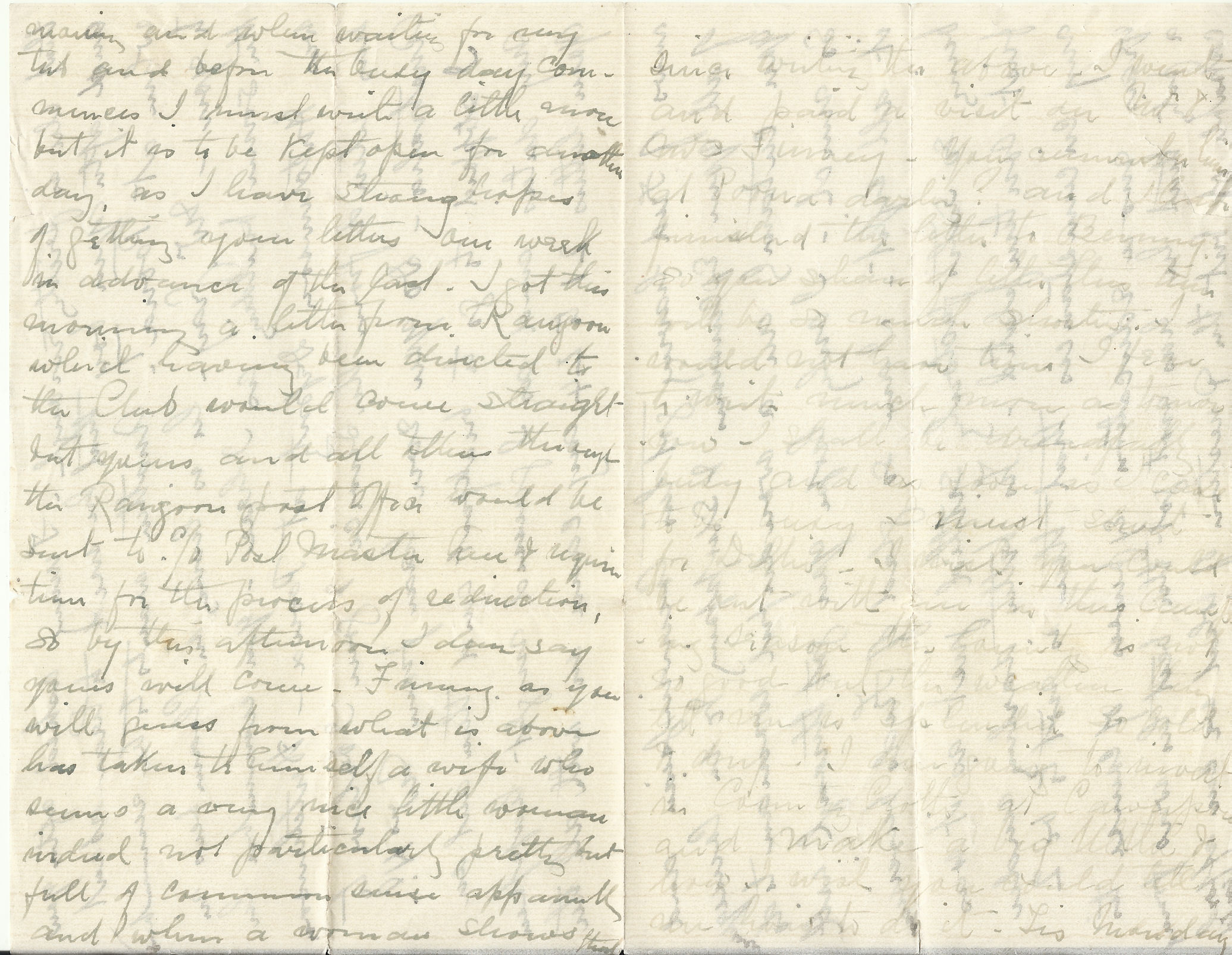 Tis Monday morning, and when waiting for my tub, and before the busy day commences, I must write a little more, but it is to be kept open, for another day, as I have strong hopes of getting your letters, one week in advance of the last. I got, this morning, a letter from Rangoon, which, having been directed to the Club, would come straight, but yours, and all others through the Rangoon post office, would be sent to c/o Post Master here, & require time for the process of redirection, so, by this afternoon, I dare say, yours will come.
