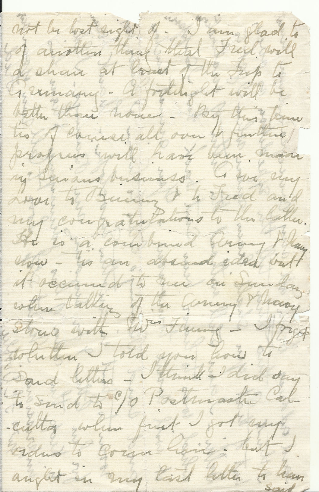 I have got the notes for difference of pay, of R.E. & R.M.A., as concerns Fred's prospects, and will write about it next time, although I dare say, that will be too late to affect the question. I dare say you have settled it all by this time. I have been talking to some military passengers on board, whom I know, & they say the R.M.A. is a first rate service and so, even supposing Fred is fitted for something better, he won't be badly off, and there won't be reason for regret in choosing the R.M.A. However, more about this, in my next. I hope Fred did not miss his trip to Germany.