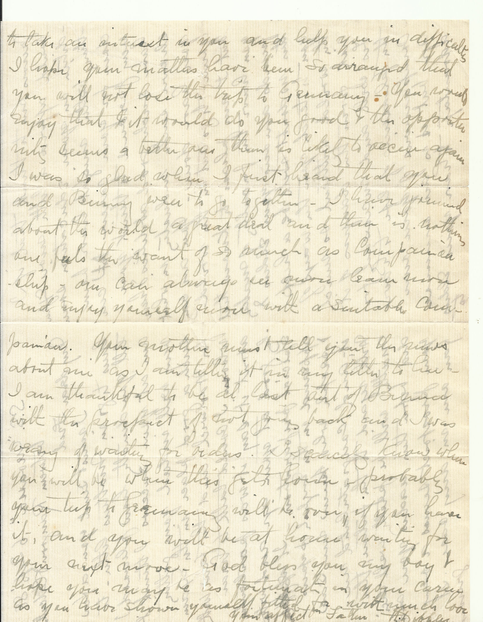 Your Mother sent me your letter, from Berlin, & I was glad to see what a nice affectionate letter you write, She deserves all the love and affection you can feel, & also show. Never had a boy a better Mother, or one to whom more is due. You appear to have made a good beginning with your Germanic trip, & I hope Fred has been able to join you. It will be a benefit to you both being together.