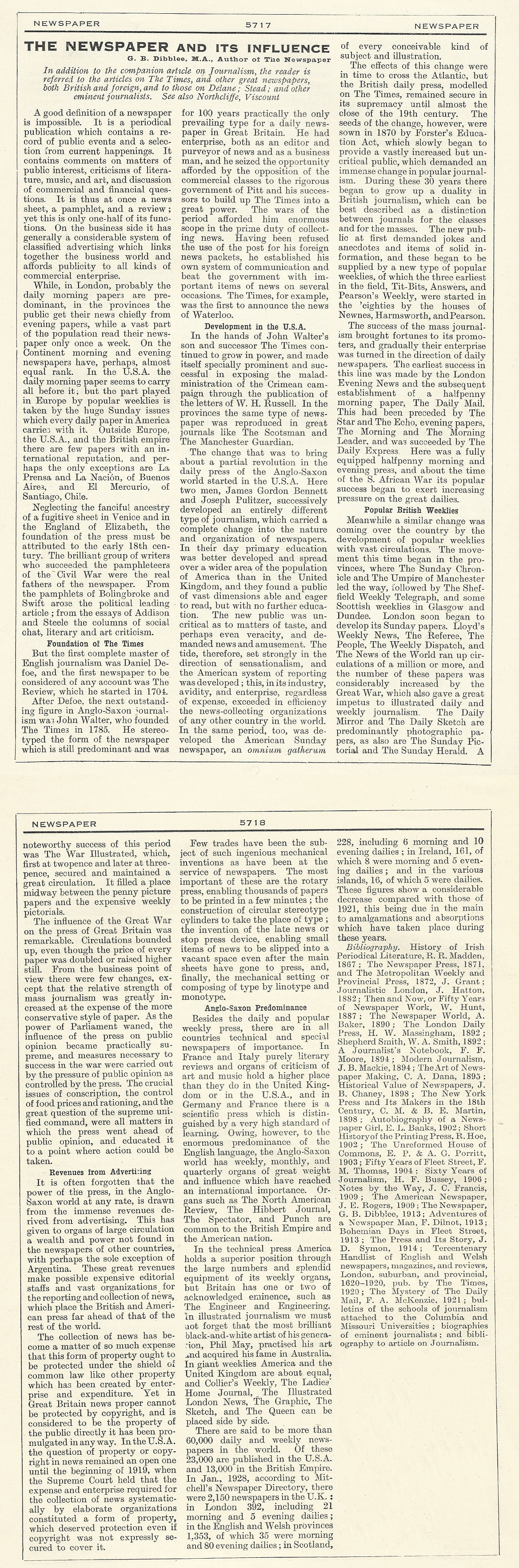 Article by George Binney DibbleeClick here for more on George Binney Dibblee. George Binney Dibblee wrote an article about The Newspaper in The Universal Encyclopedia, in twelve volumes, edited by J.A. Hammerton, Editor of the Universal History of the World, and published by The Educational Book Co. Ltd., Tallis House, Whitefriars. It is dated around 1929 (from looking at the other articles in the encyclopedia).
