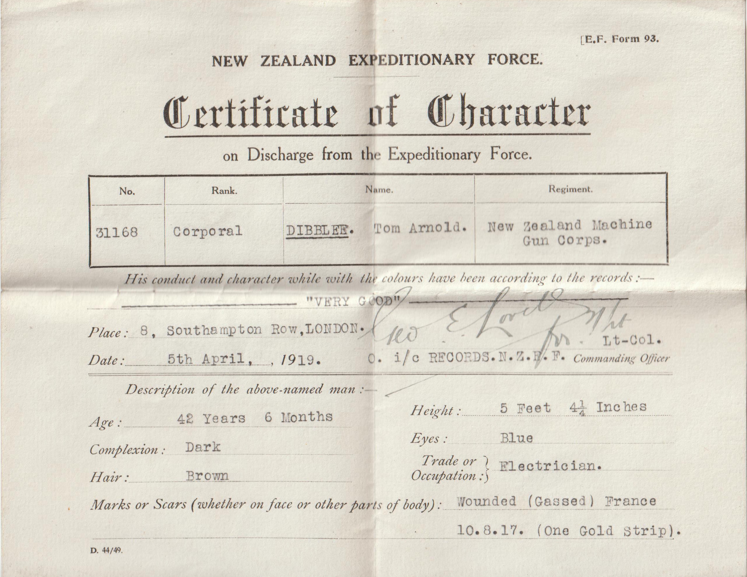 This says that Tom served in the New Zealand Expeditionary Force, from 24 Junly 1916 to 5 April 1919, and was discharged because of Demobilisation. He served 2 years 256 days, of which 2 years 142 dys were abroad.