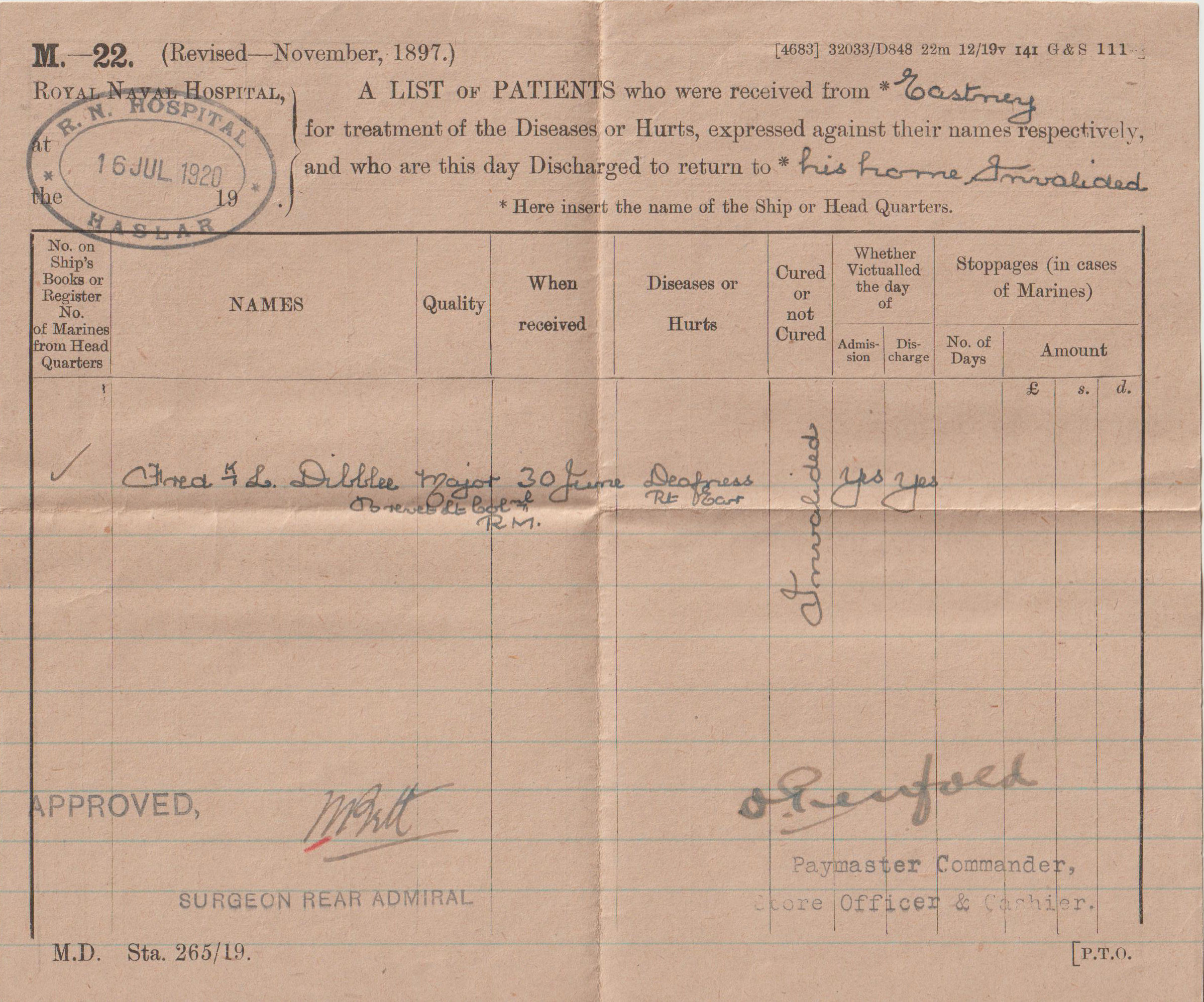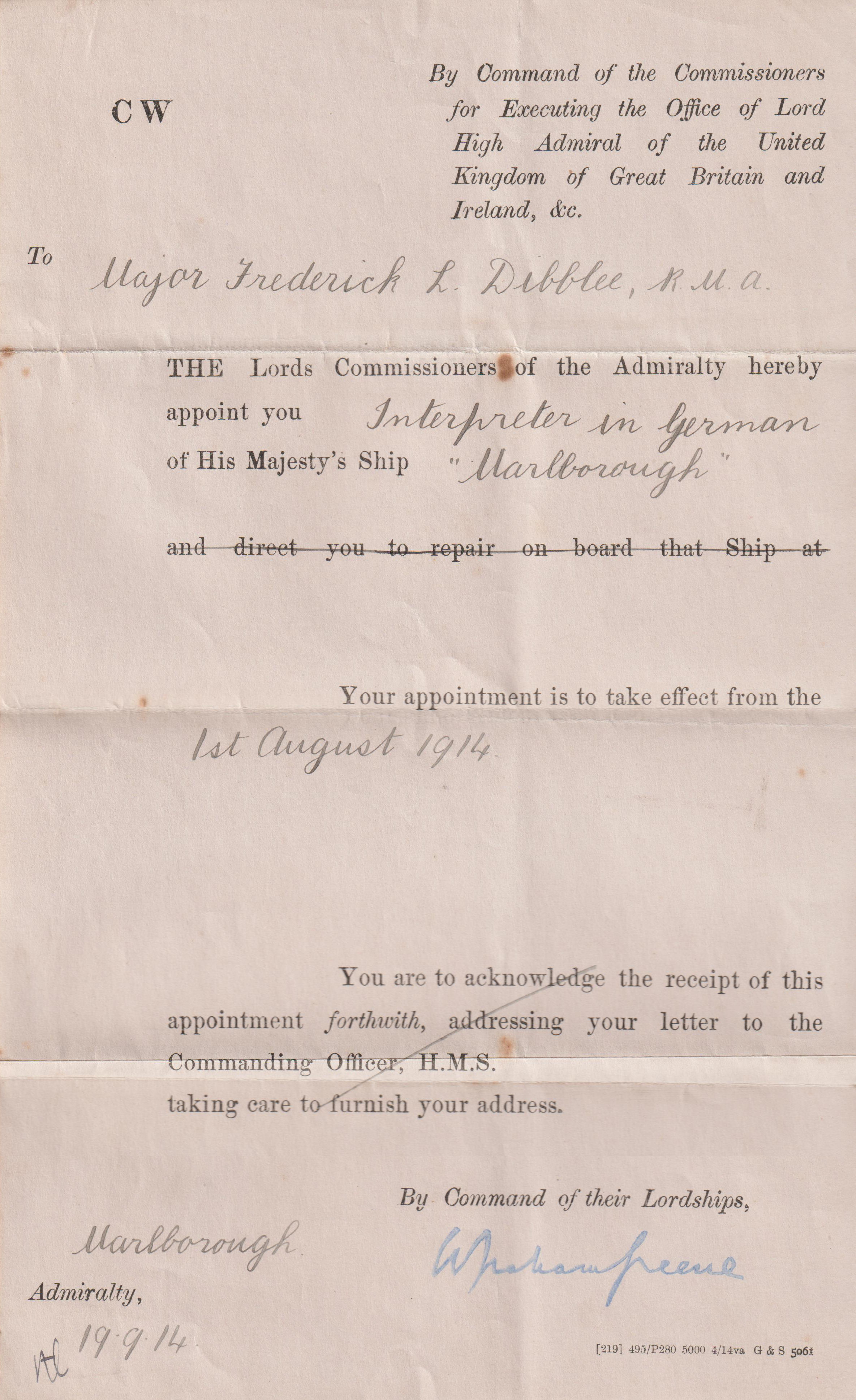 There is an interesting point here. The service record has specified German as a skill back in 1902. Frederick Dibblee's Ship Certificates include a report of his behaviour on various ships. HMS Marlborough has two certificates (presumably two tours). The first, covering 2 June 1914 to 2 Sept 1915, says "Major Diblee's knowledge of German has been very useful during the war". (I sympathise with the fact that people can't spell Dibblee correctly!) The second covers a longer period, including the Battle of Jutland, but only says "[he has conducted himself] entirely to my satisfaction". Then Frederick Dibblee spent a long time at RMA Division, before his last job, on HMS Imperieuse, as German interpreter SNO afloat, Scapa. The timing is what is interesting. The German fleet was at Scapa Flow after the Armistice. On 21 June 1919, their German commander ordered all the ships to be scuttled, as he was concerned that the British would appropriate the fleet for their own use (see Scuttling of the German fleet at Scapa Flow in Wikipedia). I assume that this meant all Germans serving in this fleet now had nowhere to live, which must have meant a chaotic time while the British sorted out accomodation, etc, as these sailors were POWs, with rights. Hence the hasty recall of Frederick Dibblee for interpreting duties.