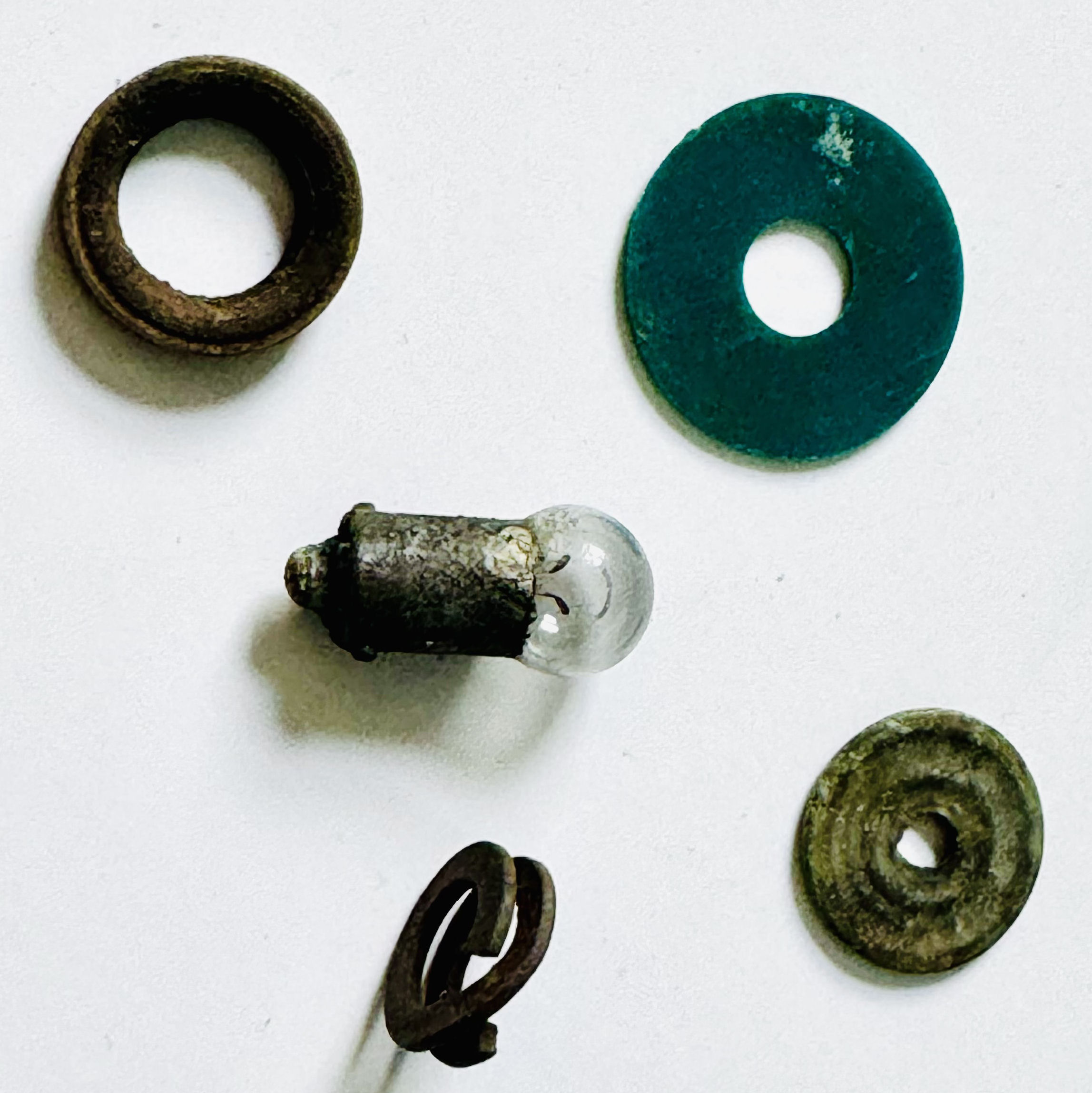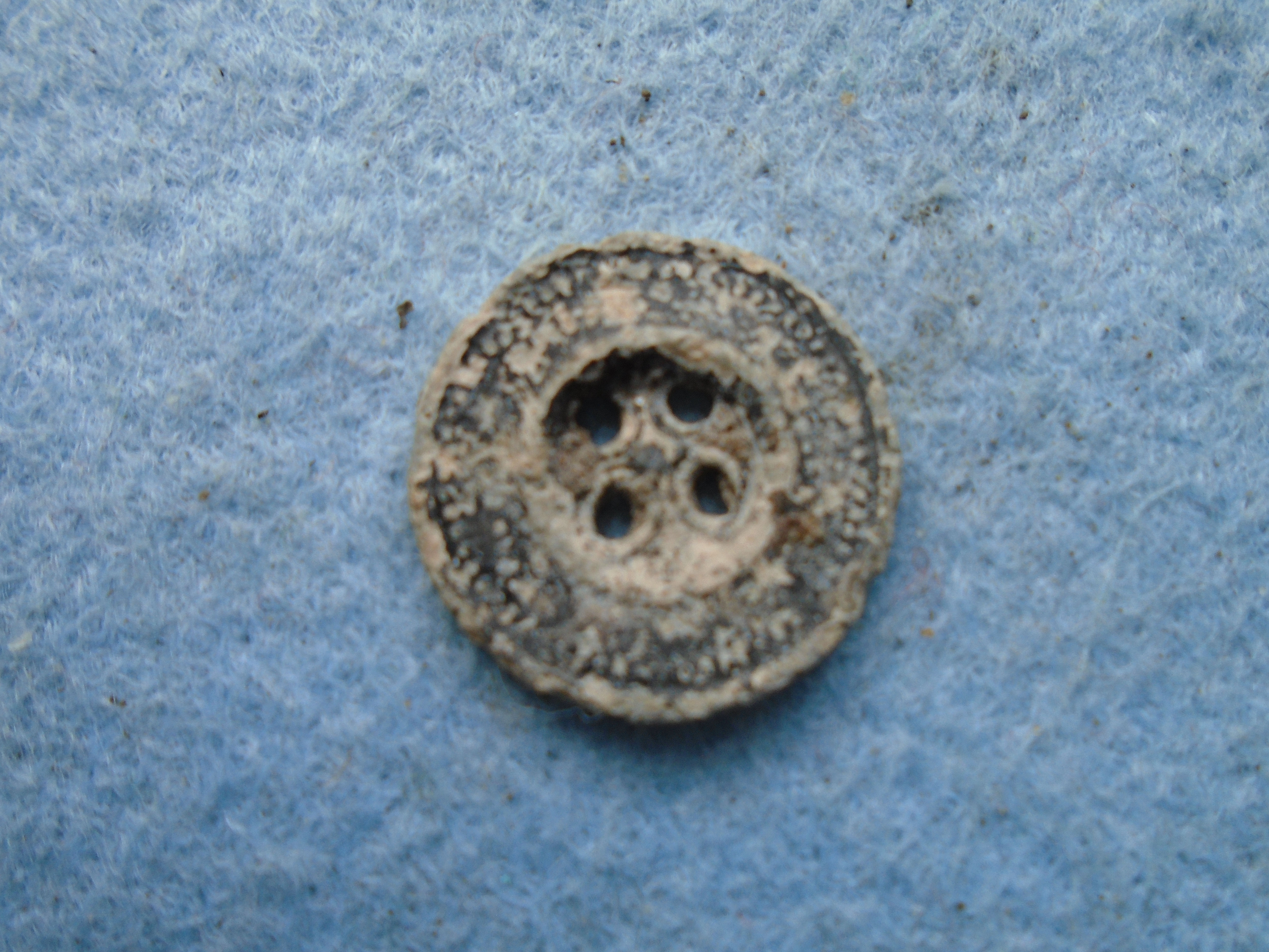 Metal bits. Two are GPO buttons (see Found in shed). One is, I suspect, a fly button or an underwear button! The last seems to be a stud of some kind. The photos below show both sides of each.